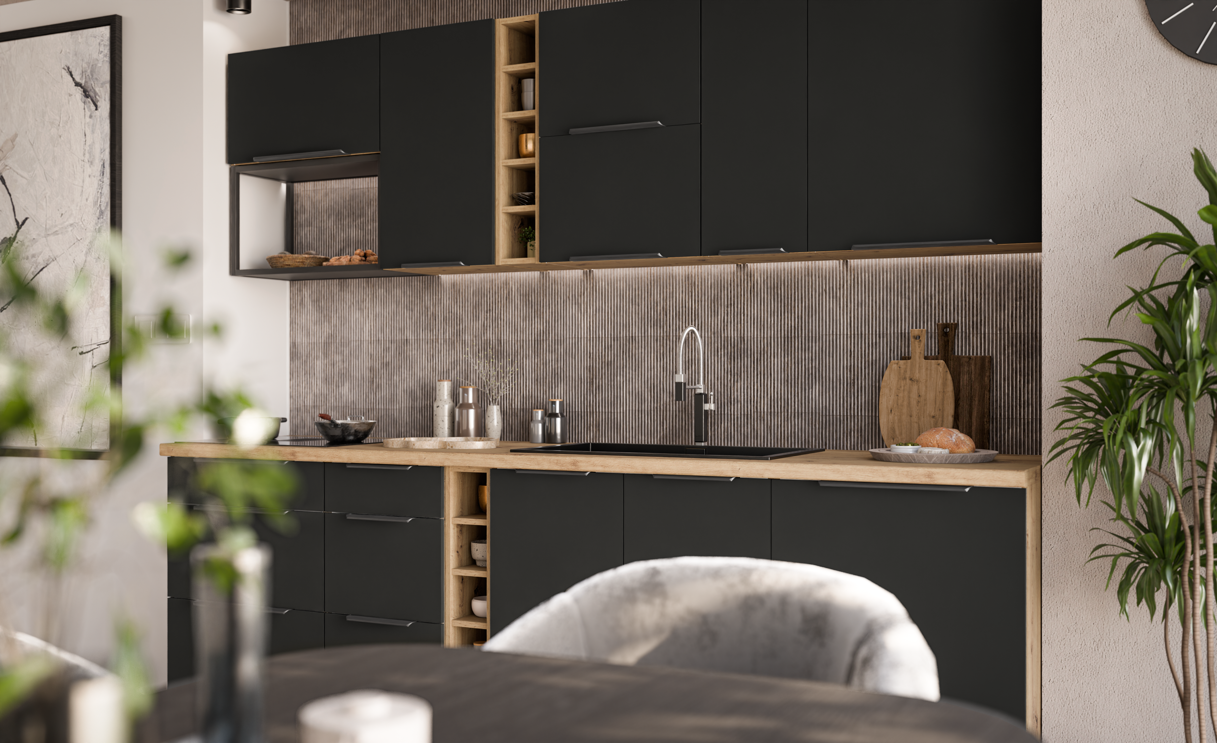 Kombinacija crne i drvene teksture daje prostoru karakter i toplinu koju ćete osjećati svakog dana. Dodavanjem osobnih dekorativnih naglasaka, poput staklenih polica, metalnih dodataka ili svjetlosnih elemenata, možete kuhinju potpuno prilagoditi svom stilu i pretvoriti je u prostor koji izražava vašu osobnost.