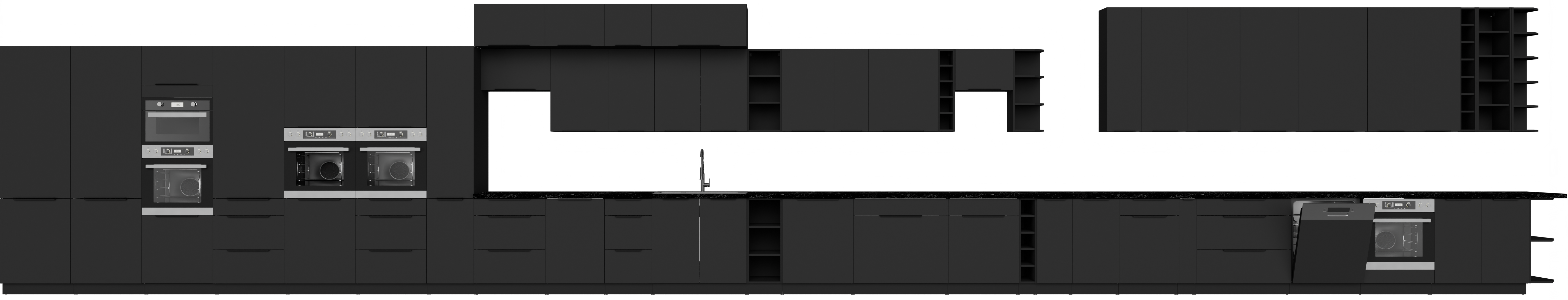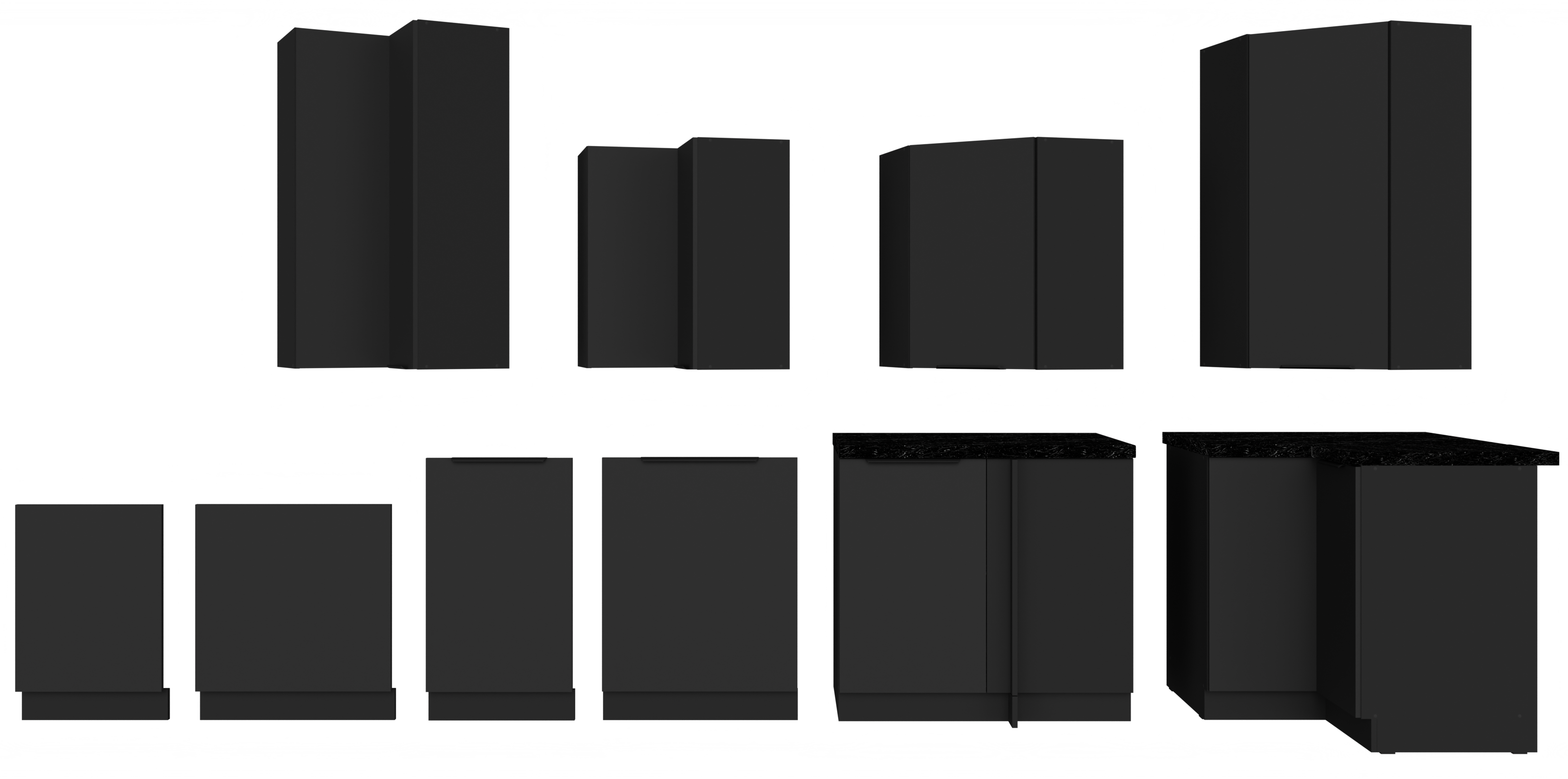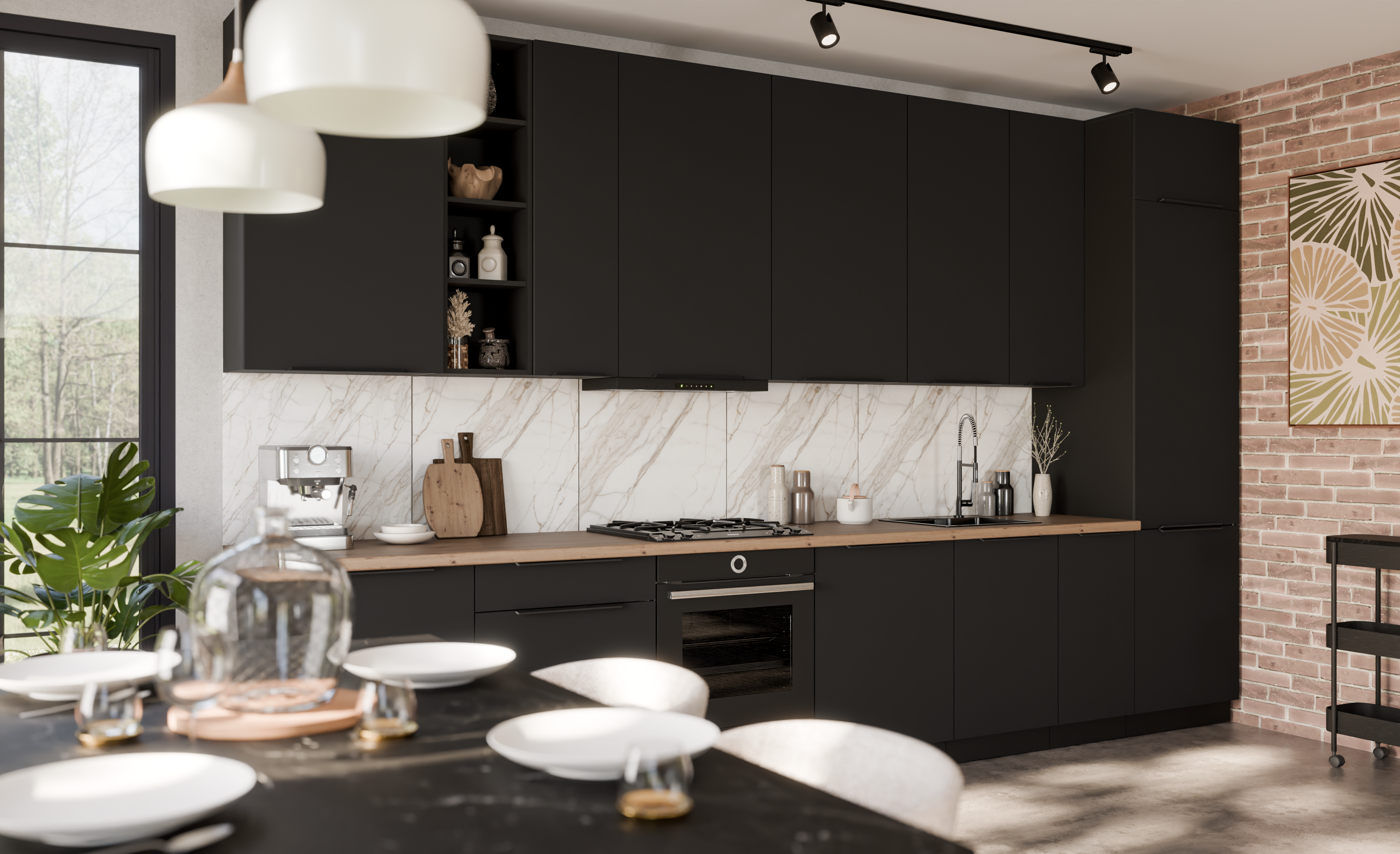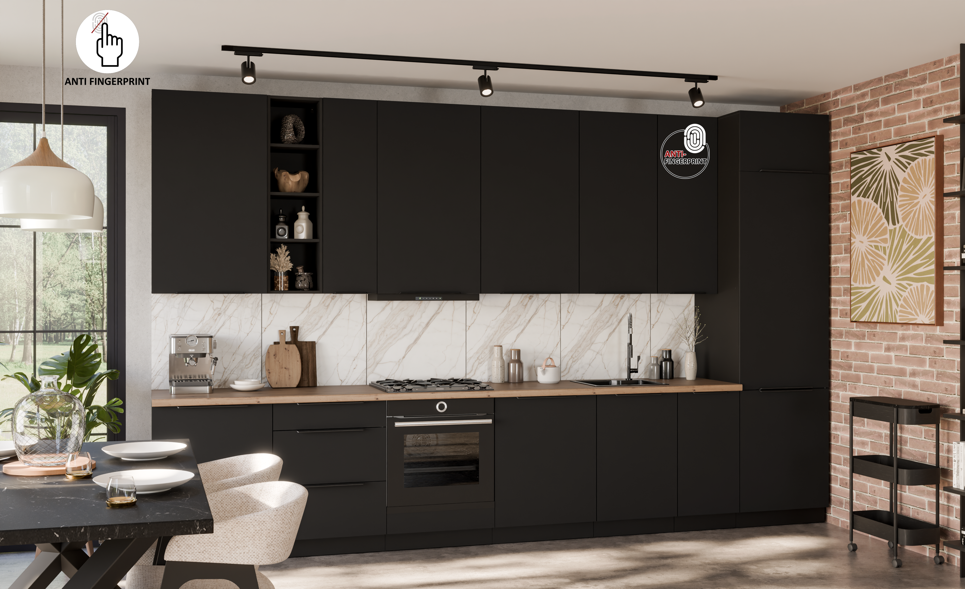 Svaka moderna kuhinja je srce doma – prostor gdje se susreću obitelj, prijatelji i ukusne ideje. Ovaj kuhinjski set u profinjenoj crnoj boji savršen je izbor za sve koji cijene modernu estetiku, kvalitetne materijale i promišljen dizajn. S preciznom izradom od 16 mm laminirane ploče osigurava dug vijek trajanja, a istovremeno zadržava elegantan izgled koji se lako uklapa u različite interijerske stilove. Dizajn kuhinje temelji se na minimalističkoj liniji i bezvremenskoj kombinaciji boja. Crna boja korpusa i fronti naglašava moderan karakter prostora, dok crno-aluminijski ručkice Edge UA-HEXA dodaju dašak sofisticiranosti. Sve zajedno stvara harmoničnu cjelinu koja odiše elegancijom i profinjenim ukusom.
