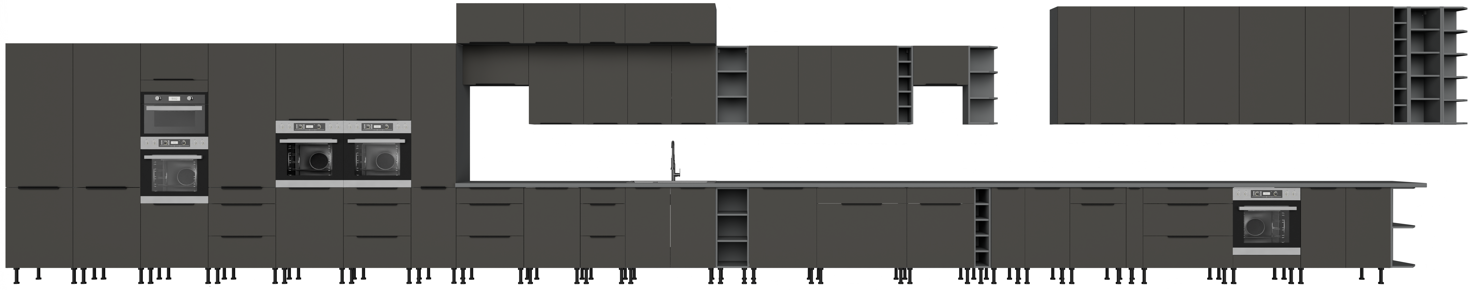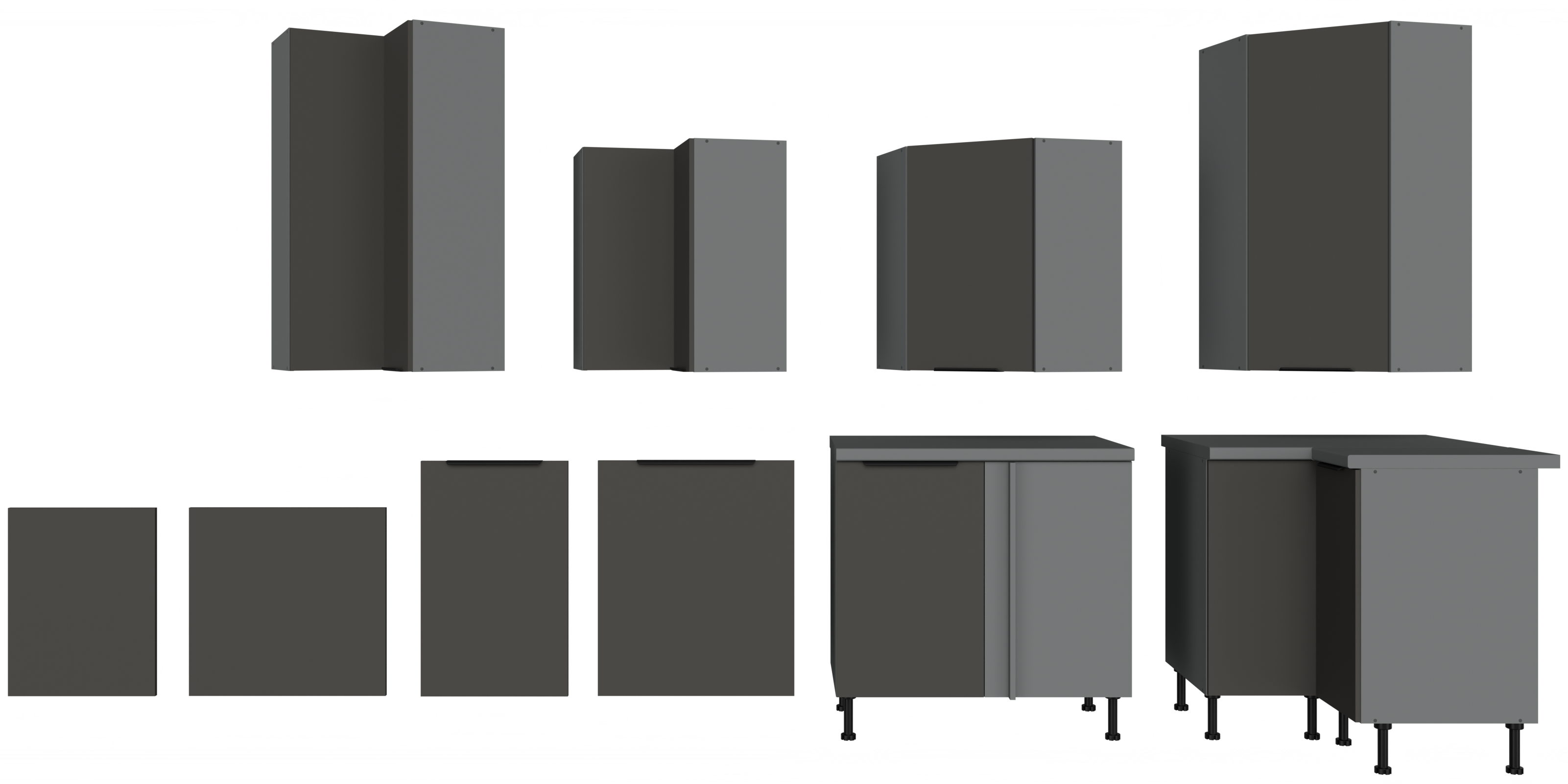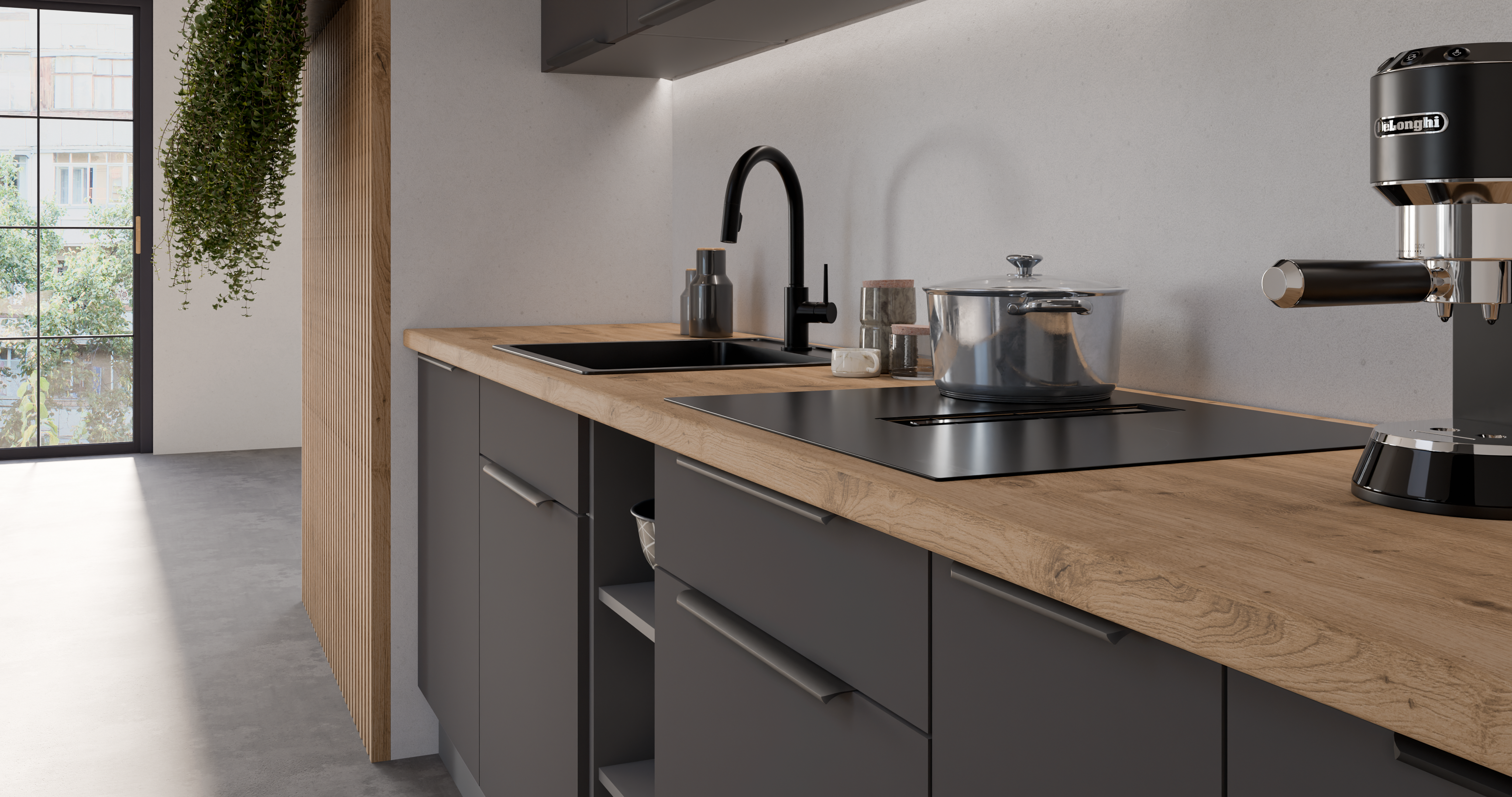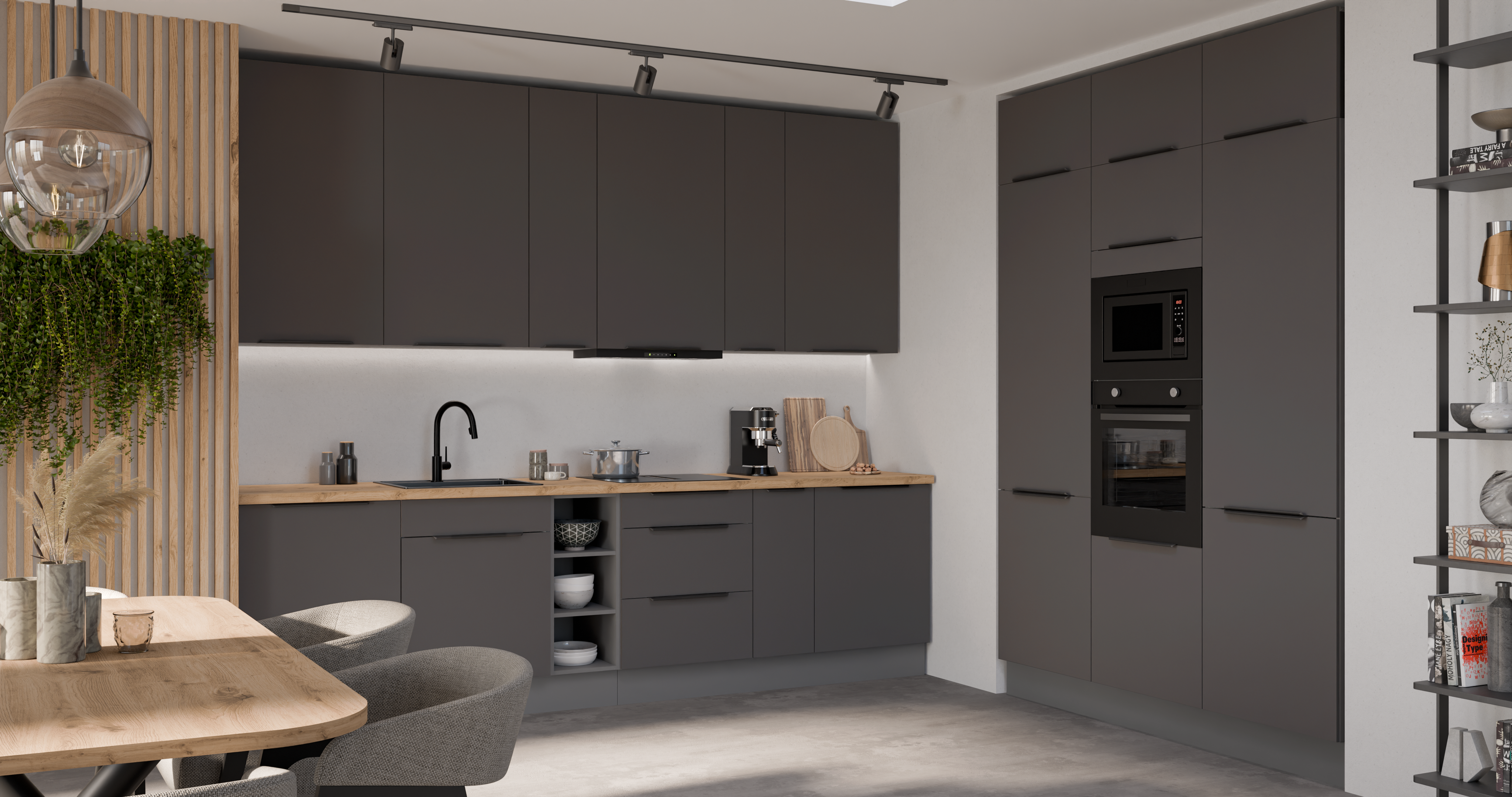 Svaki element kuhinjskog sastava promišljeno je oblikovan kako bi ponudio najviše udobnosti i uporabnosti. Kućište i fronte od laminirane ploče debljine 16 mm osiguravaju izvrsnu čvrstoću te otpornost na vlagu i habanje – što znači da će vaša kuhinja dugo zadržati svoj izvorni izgled. Crno-aluminijski ručkice Edge UA-HEXA s razmakom između 64 mm i 320 mm dodaju moderan metalni dodir i omogućuju udobno otvaranje vrata i ladica. Njihov elegantan oblik savršeno se uklapa s kontrastom između sivih i antracitnih površina te naglašava suvremeni karakter cijelog prostora.