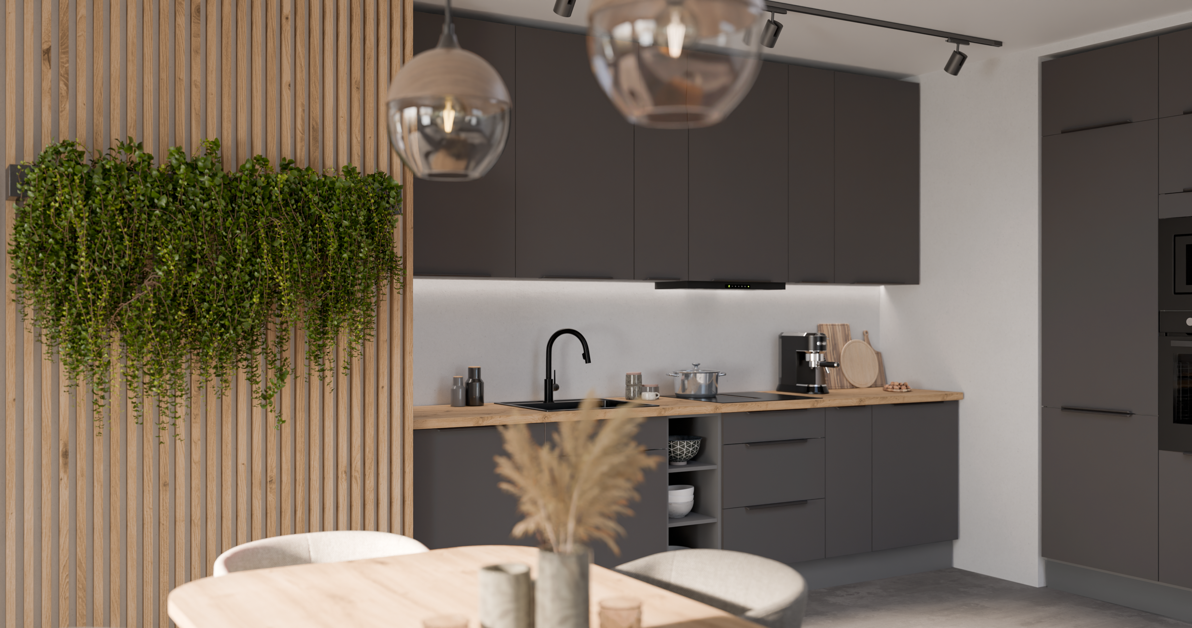 Kuhinjski sastav Aria u profinjenoj kombinaciji sive i antracit boje predstavlja savršenu ravnotežu između modernog izgleda, funkcionalnosti i kvalitete. Njegova minimalistička, a istovremeno topla estetika unosi u svaki dom dašak suvremenog luksuza, koji se bez poteškoća uklapa s najrazličitijim unutarnjim stilovima – od urbanog industrijskog do elegantno skandinavskog. Ova kuhinja stvorena je za ljude koji cijene estetiku, red i praktičnost u svakodnevnom životu.