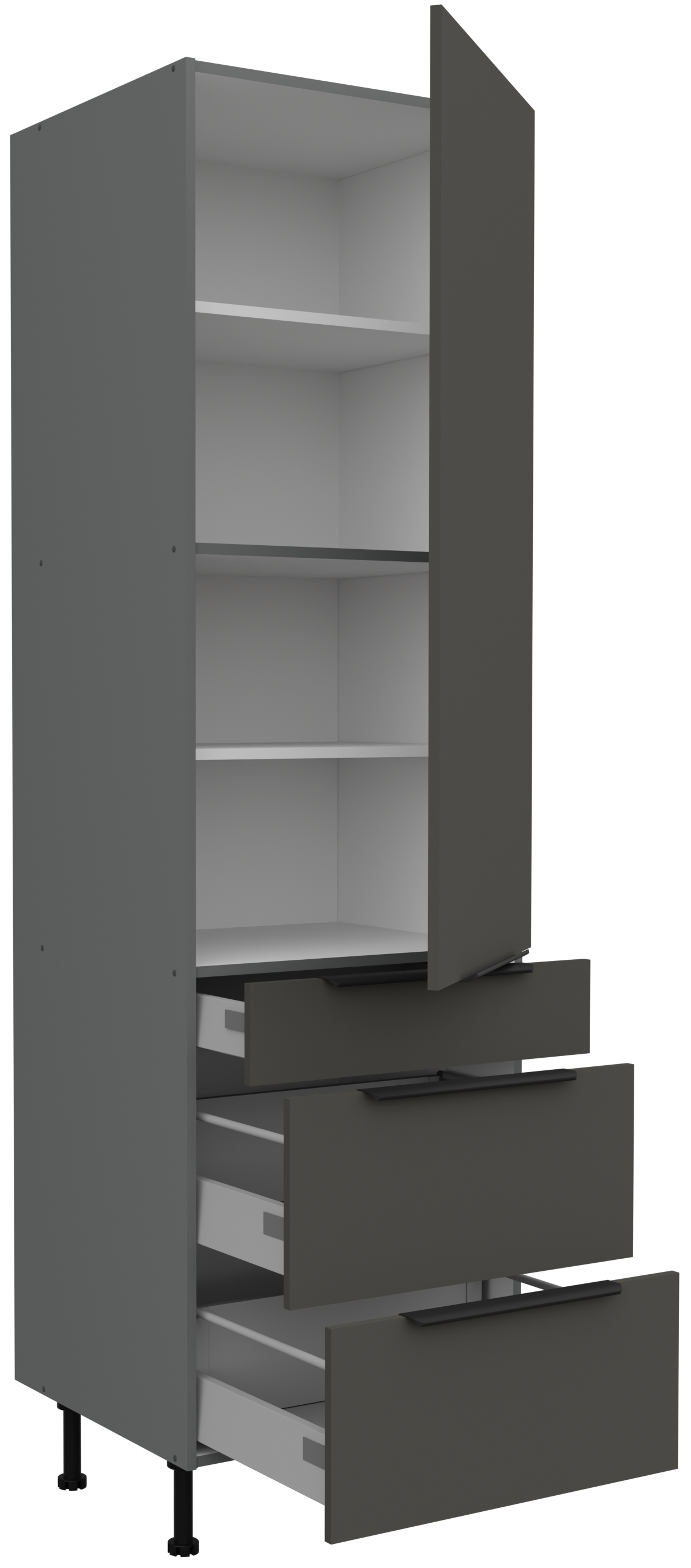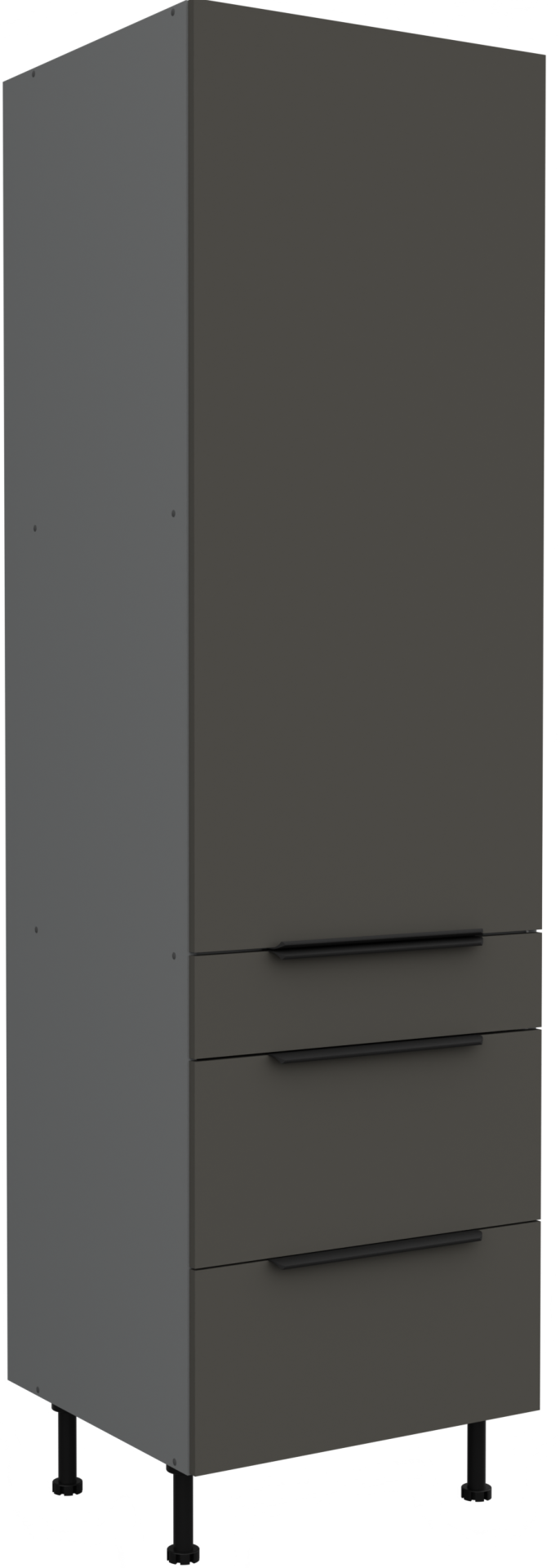 Svaki element kuhinjskog sastava promišljeno je oblikovan kako bi ponudio najviše udobnosti i uporabnosti. Kućište i fronte od laminirane ploče debljine 16 mm osiguravaju izvrsnu čvrstoću te otpornost na vlagu i habanje – što znači da će vaša kuhinja dugo zadržati svoj izvorni izgled. Crno-aluminijski ručkice Edge UA-HEXA s razmakom između 64 mm i 320 mm dodaju moderan metalni dodir i omogućuju udobno otvaranje vrata i ladica. Njihov elegantan oblik savršeno se slaže s kontrastom između sivih i antracitnih površina te naglašava suvremeni karakter cijelog prostora.