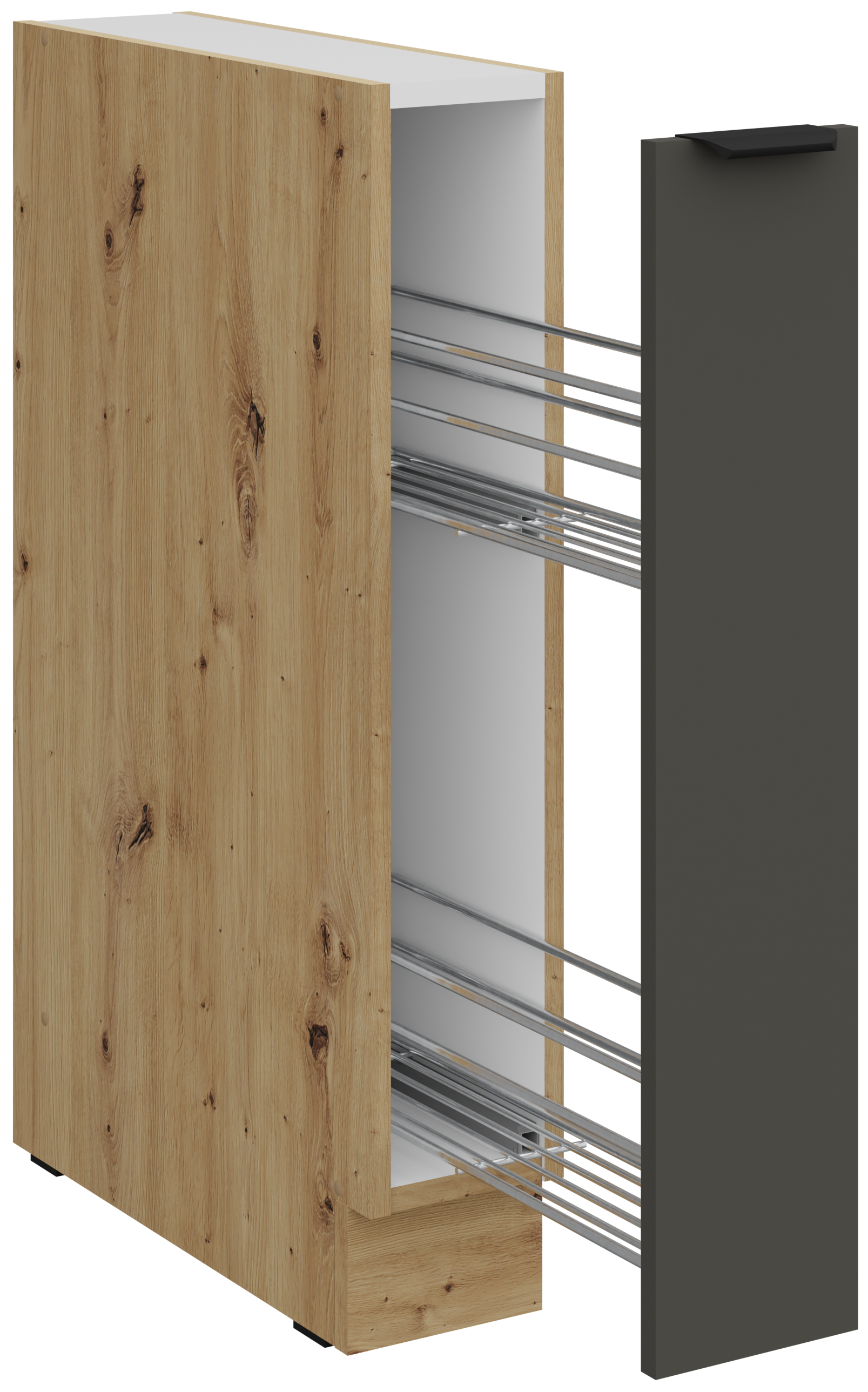 Kuhinjski sastav u kombinaciji sive boje i artisan hrasta predstavlja savršenu ravnotežu između topline prirodnog drva i suvremene minimalističke estetike. Ovaj prekrasno dizajniran kuhinjski komplet namijenjen je svima koji cijene kvalitetu, praktičnost i elegantan izgled prostora. S preciznom izradom od laminirane ploče debljine 16 mm osigurava dug vijek trajanja i otpornost na svakodnevna opterećenja, a pritom zadržava profinjen izgled koji će oduševiti svakog posjetitelja.