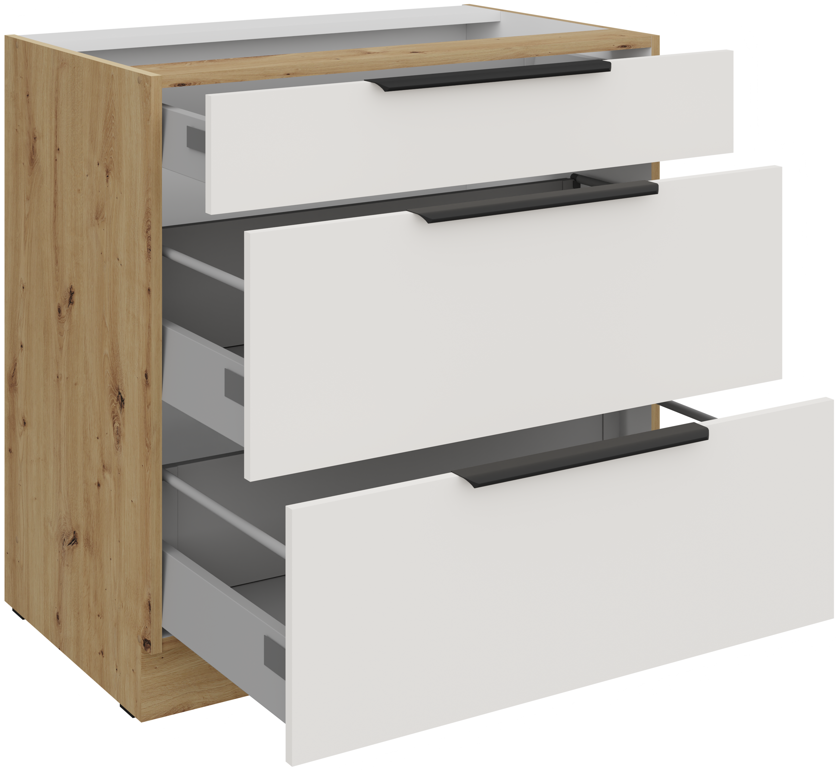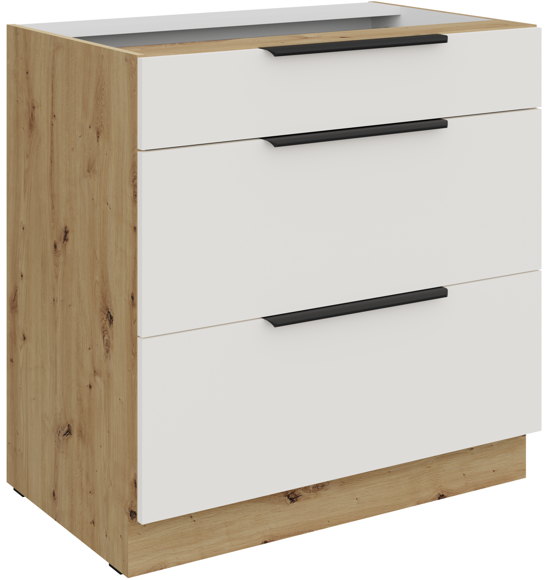 Osnova kuhinjskog sastava Aria je okvir od iverala, što znači stabilnu konstrukciju i dobru otpornost na opterećenja. Površine su obrađene kvalitetnom laminacijom, koja štiti od vlage i mehaničkih oštećenja. Kombinacija bijele boje i nijanse artisan hrasta stvara ugodan kontrast između svijetlih i prirodnih tonova, što prostoru dodaje osjećaj topline i prozračnosti.