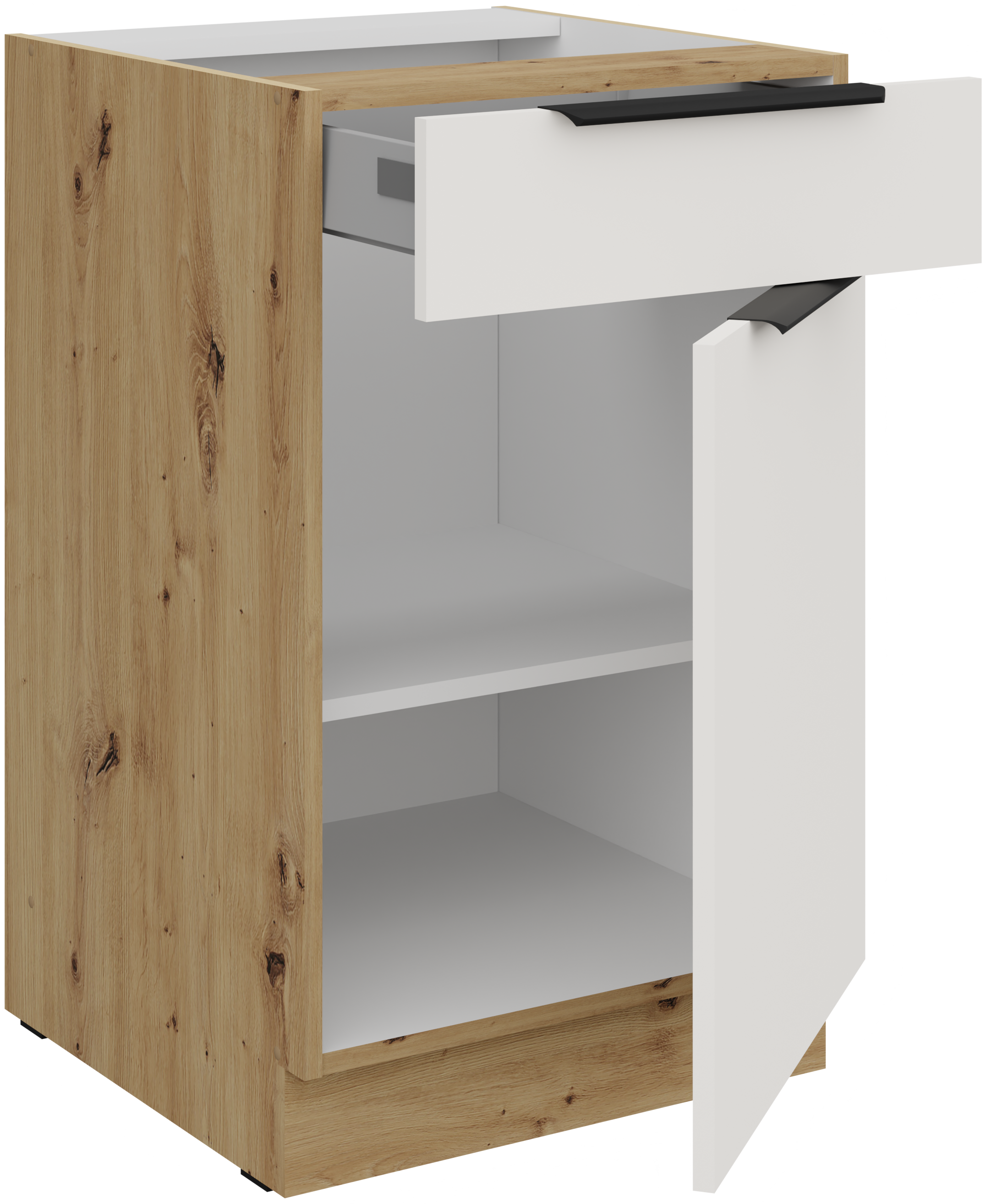 Osnova kuhinjskog seta Aria je okvir od iverala, što znači stabilnu konstrukciju i dobru otpornost na opterećenja. Površine su obrađene kvalitetnom laminacijom koja štiti od vlage i mehaničkih oštećenja. Kombinacija bijele boje i nijanse artisan hrast stvara ugodan kontrast između svijetlih i prirodnih tonova, što prostoru dodaje osjećaj topline i prozračnosti.