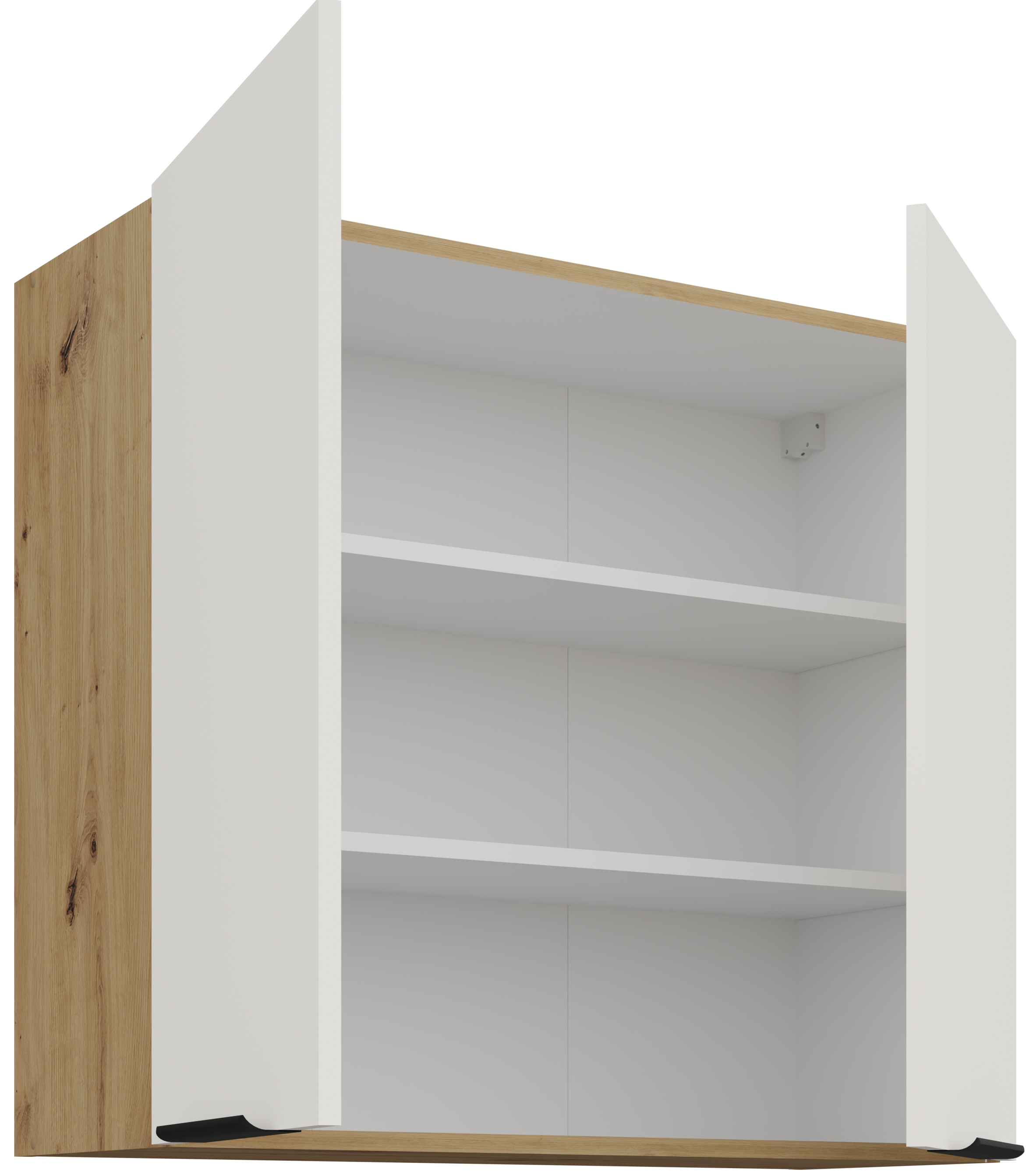 Osnova kuhinjskog sastava Aria je okvir od iverala, što znači stabilnu konstrukciju i dobru otpornost na opterećenja. Površine su obrađene kvalitetnom laminacijom koja štiti od vlage i mehaničkih oštećenja. Kombinacija bijele boje i nijanse artisan hrasta stvara ugodan kontrast između svijetlih i prirodnih tonova, što prostoru dodaje osjećaj topline i prozračnosti.