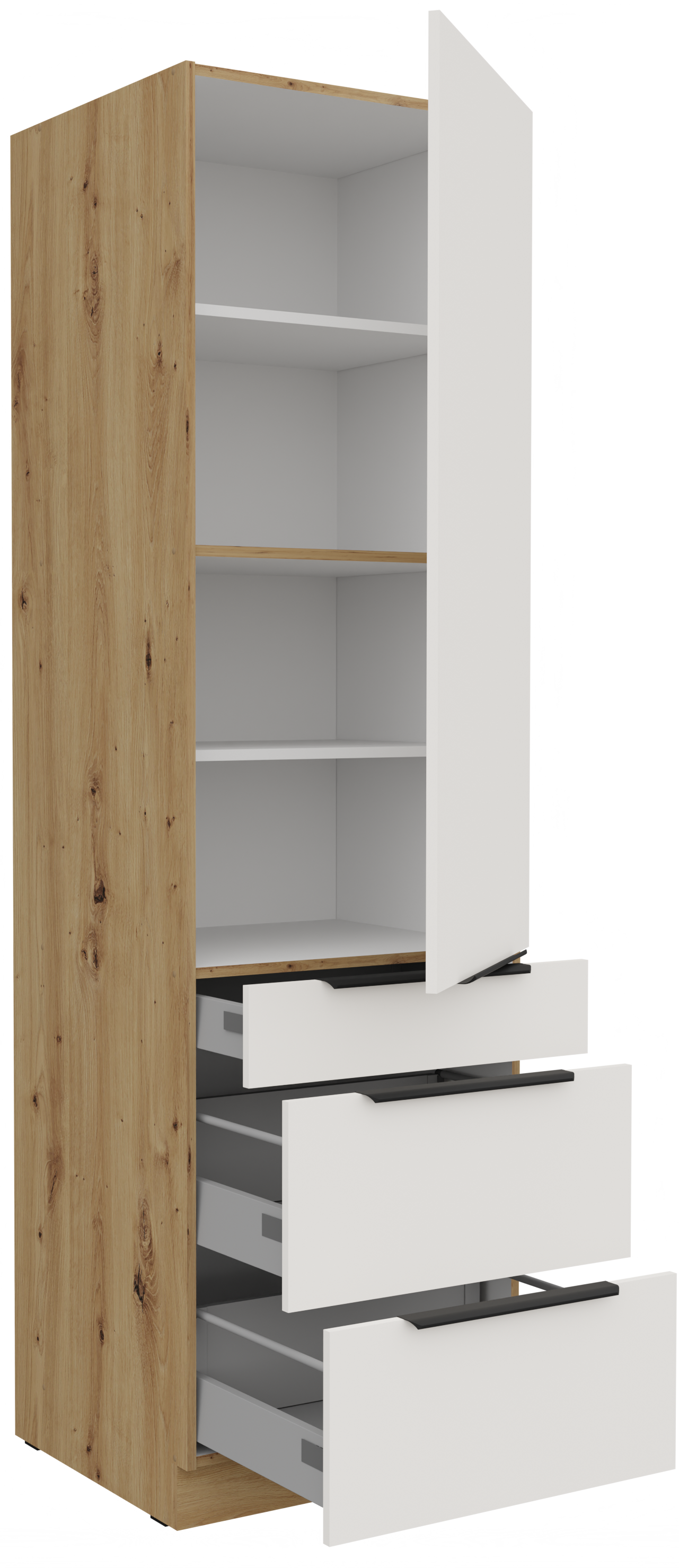 Osnova kuhinjskog sastava Aria je okvir od iverala, što znači stabilnu konstrukciju i dobru otpornost na opterećenja. Površine su obrađene kvalitetnom laminacijom koja štiti od vlage i mehaničkih oštećenja. Kombinacija bijele boje i nijanse artisan hrasta stvara ugodan kontrast između svijetlih i prirodnih tonova, što prostoru daje osjećaj topline i prozračnosti.