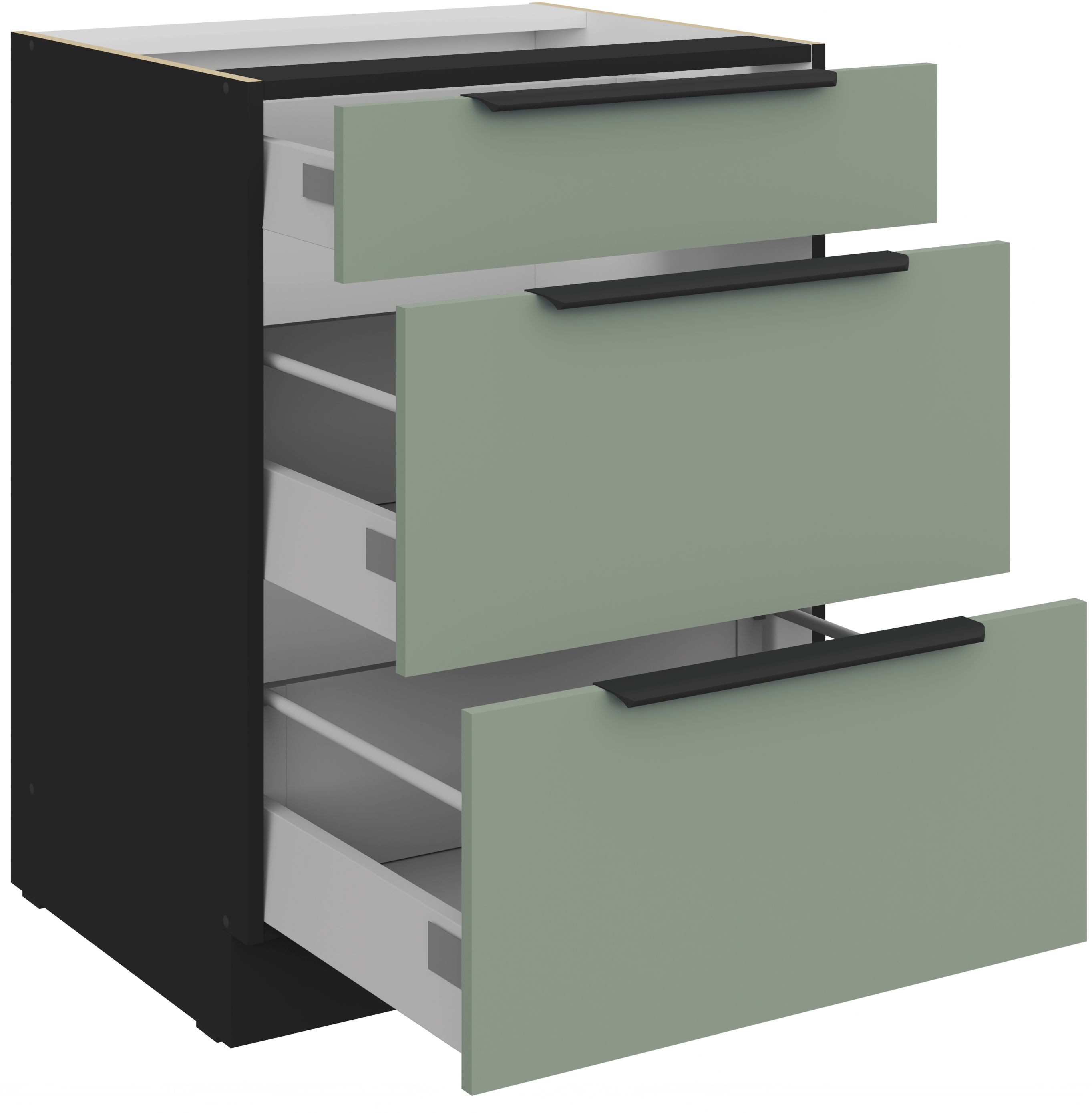 Radna ploča s oznakom 38‑6499 marmor roma osigurava elegantan završetak cjeline. Uzorak mramora lijepo se uklapa s kolor frontama i dodaje dašak prestiža. Površina je otporna na vlagu i jednostavna za čišćenje, što omogućuje bezbrižnu pripremu hrane. Kuhinjski elementi opremljeni su estetski i praktično oblikovanim ručkama edge UA‑HEXA od crno‑aluminijske legure. Ručkice su dostupne u različitim razmacima – od 64 mm do 320 mm – što omogućuje usklađenost s različitim veličinama vrata i ladica.