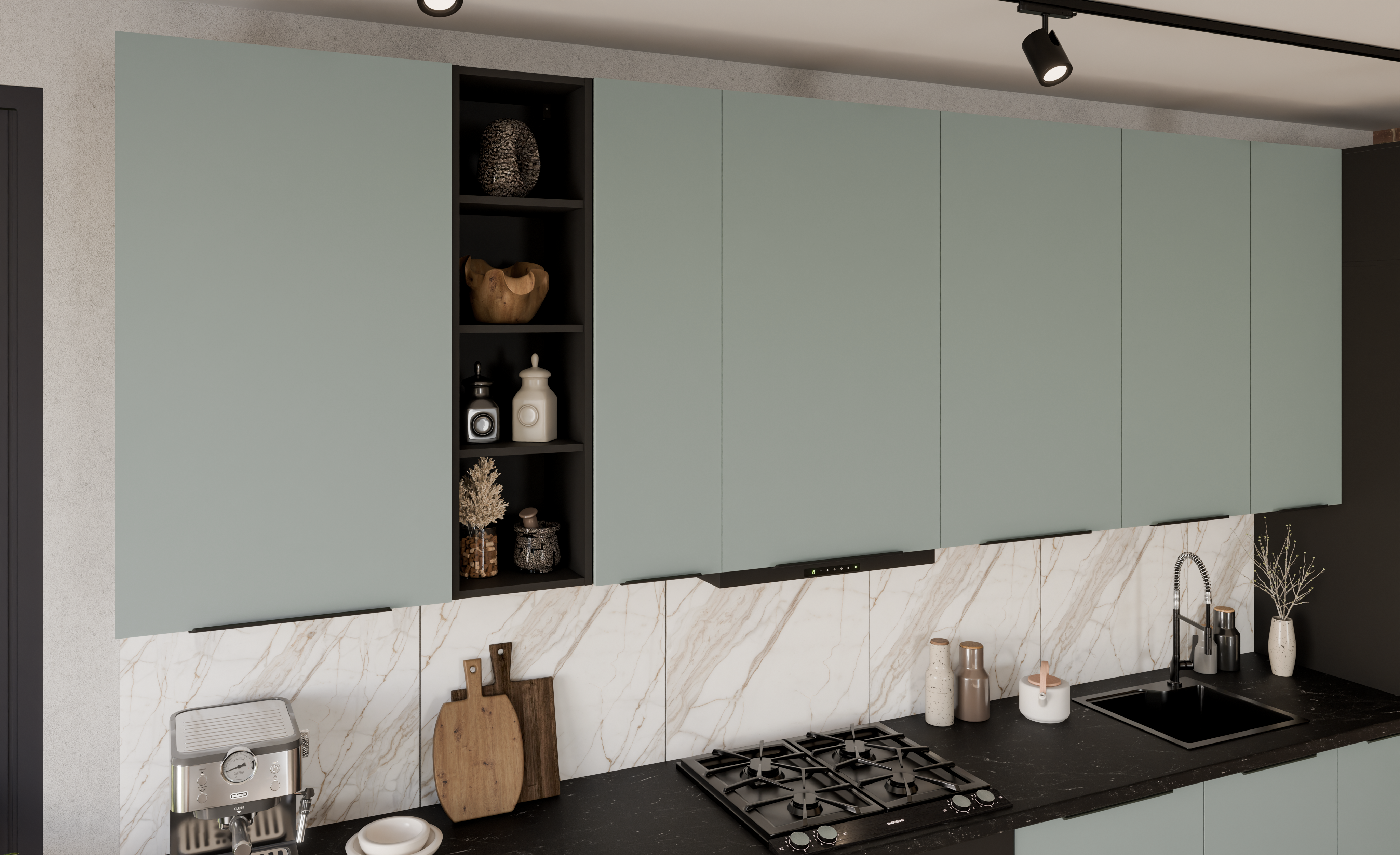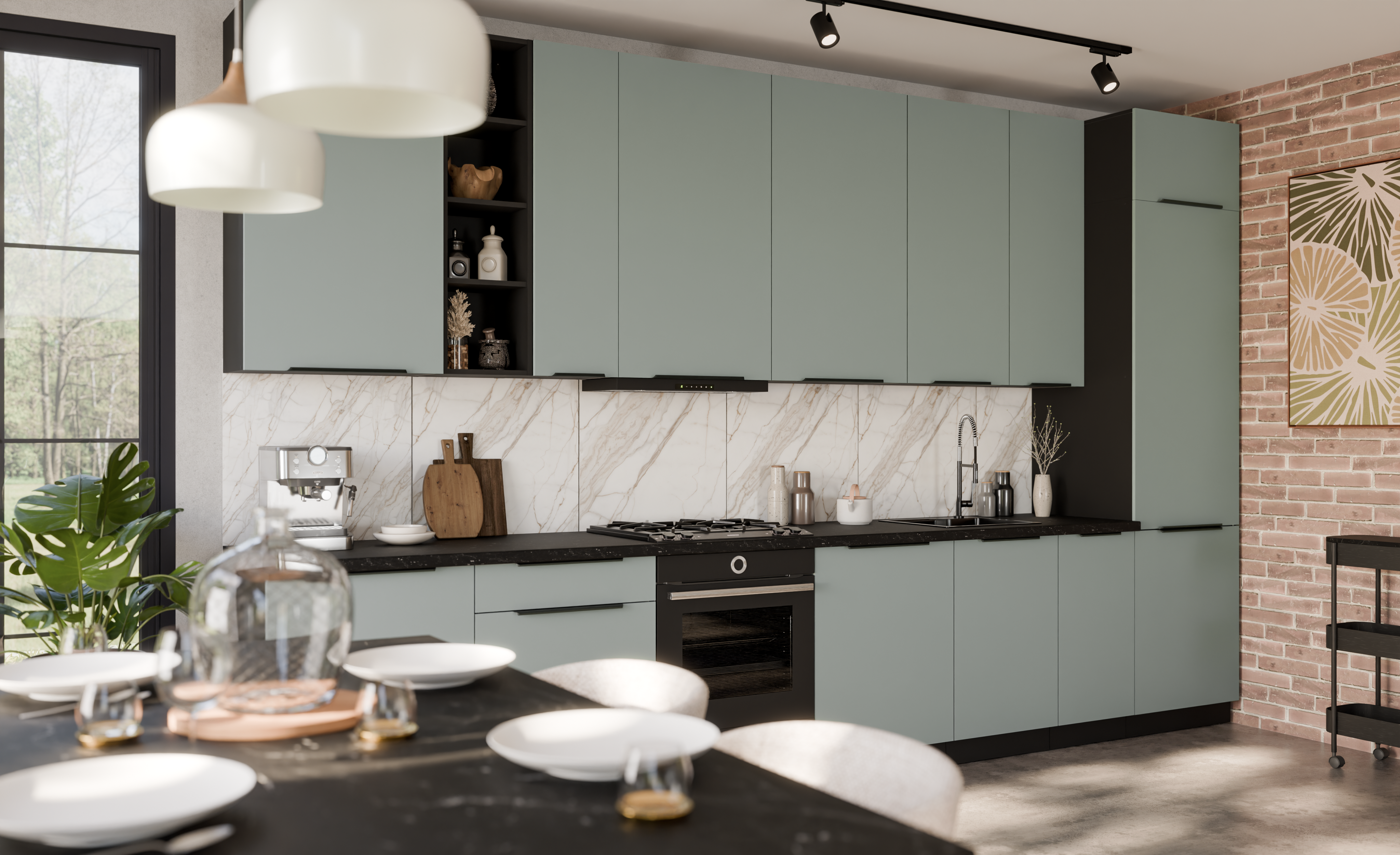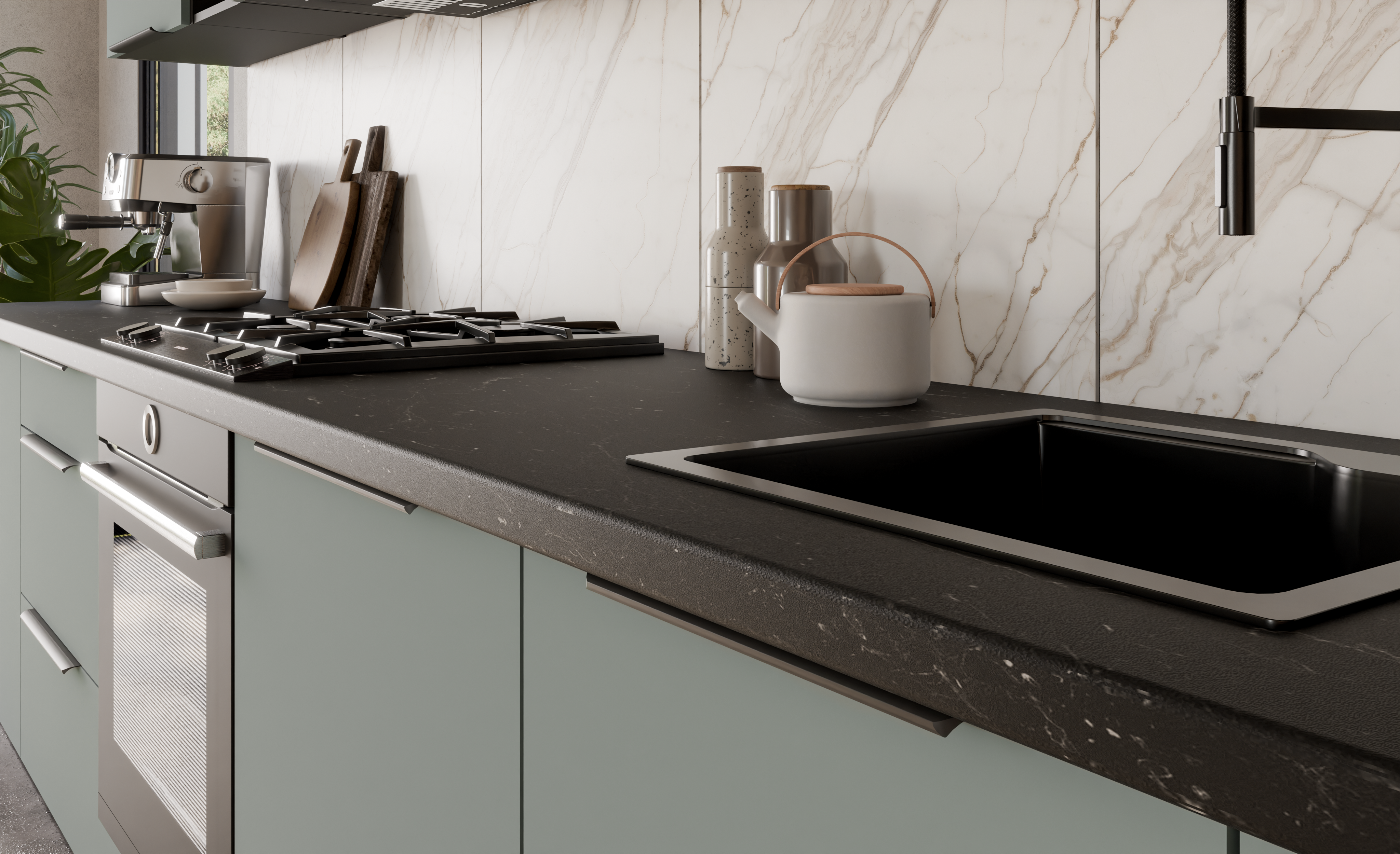 Radna ploča s oznakom 38‑6499 marmor roma osigurava elegantan završetak cjeline. Uzorak mramora lijepo se slaže s kolor frontama i dodaje dašak prestiža. Površina je otporna na vlagu i jednostavna za čišćenje, što omogućuje bezbrižnu pripremu hrane. Kuhinjski elementi opremljeni su estetski i praktično oblikovanim ručkama edge UA‑HEXA od crno‑aluminijske legure. Ručke su dostupne u različitim razmacima – od 64 mm do 320 mm – što omogućuje usklađenost s različitim veličinama vrata i ladica.