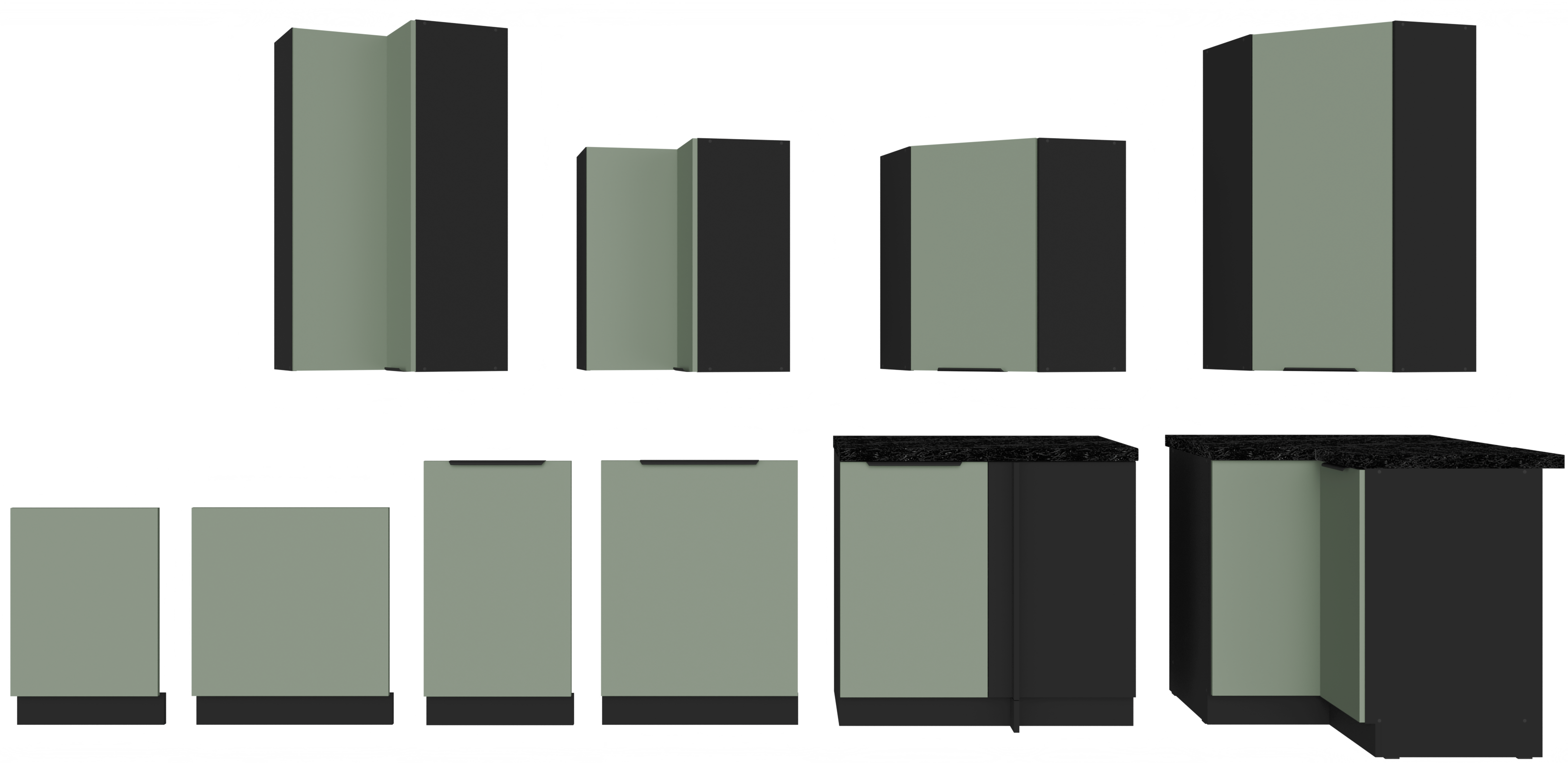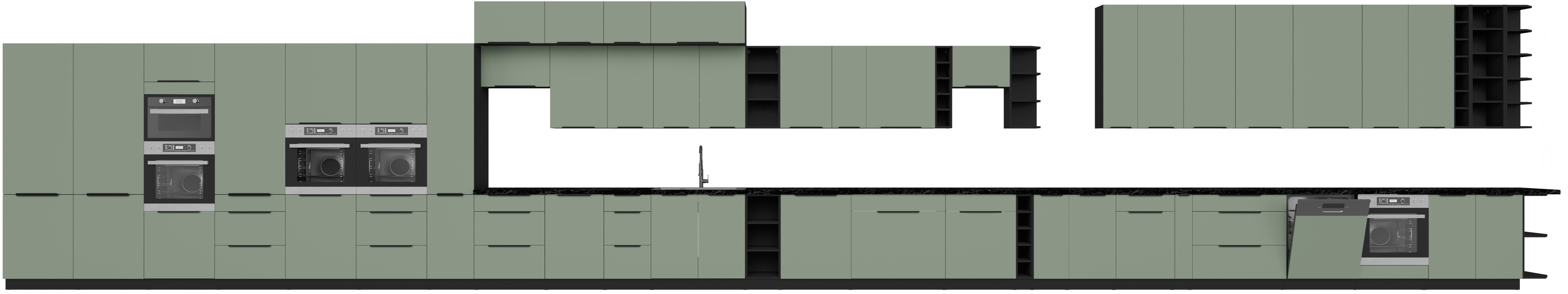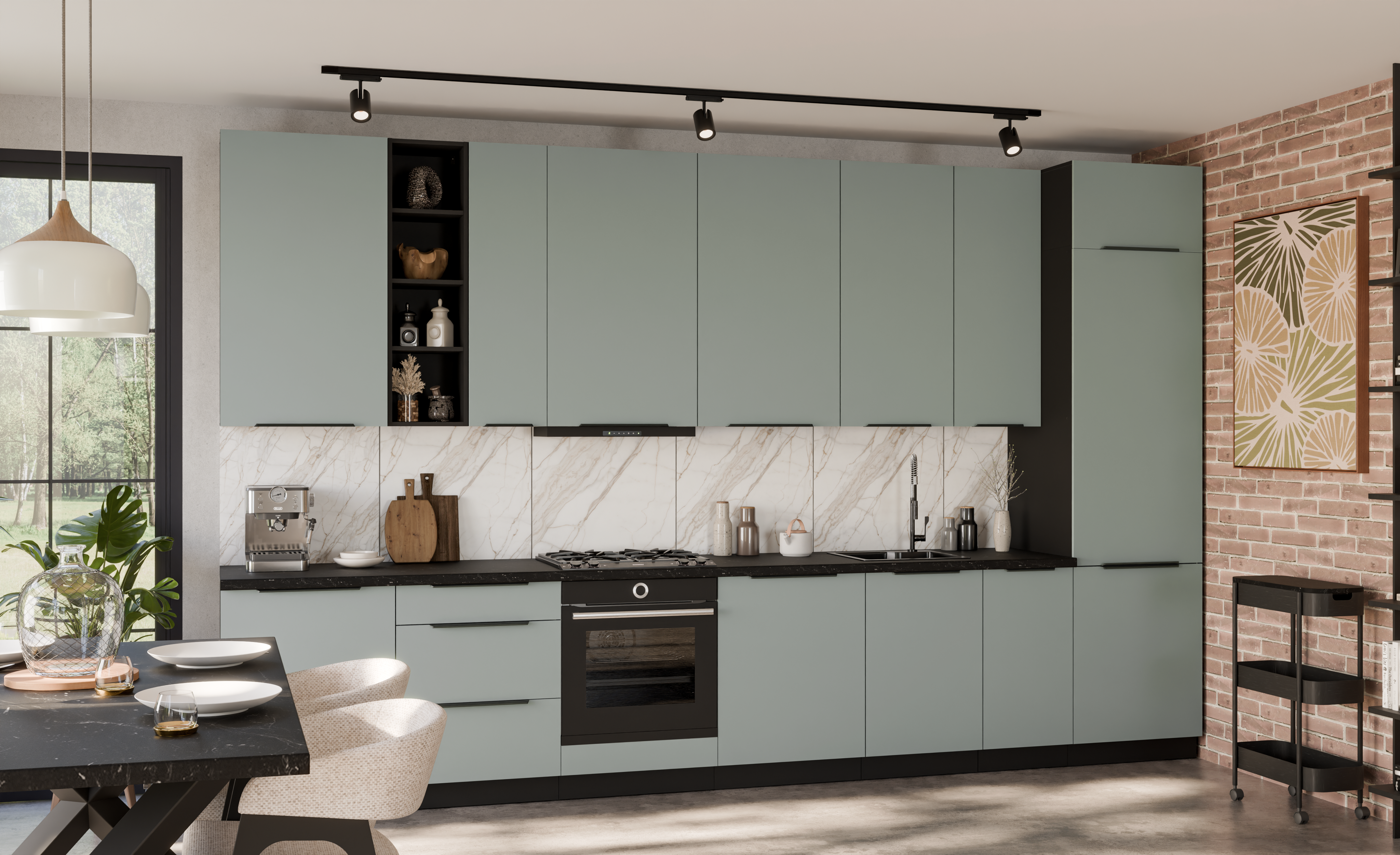 Radna ploča s oznakom 38‑6499 marmor roma osigurava elegantan završetak cjeline. Uzorak mramora lijepo se slaže s kolor frontama i dodaje dašak prestiža. Površina je otporna na vlagu i jednostavna za čišćenje, što omogućuje bezbrižnu pripremu hrane. Kuhinjski elementi opremljeni su estetski i praktično oblikovanim ručkama edge UA‑HEXA od crno‑aluminijske legure. Ručke su dostupne u različitim razmacima – od 64 mm do 320 mm – što omogućuje usklađenost s različitim veličinama vrata i ladica.