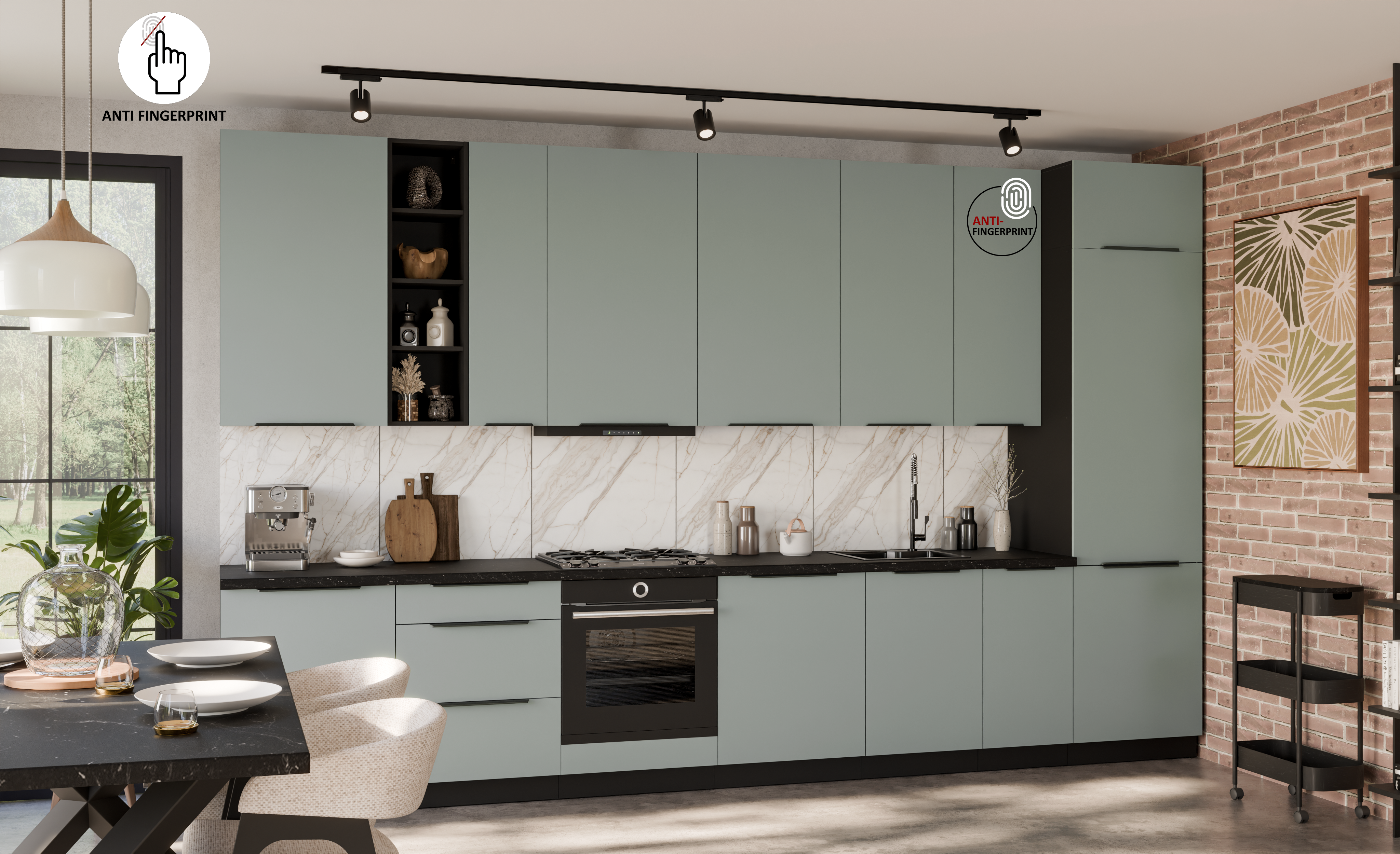 Laminirana površina otporna je na mrlje, vodu i povremena mehanička opterećenja, stoga je kuhinja Aria jednostavna za čišćenje. Dovoljna je meka krpa i blag deterdžent. Rubovi elemenata precizno su obrađeni, što sprječava prodor vlage i produžuje vijek trajanja. Zahvaljujući sustavima za tiho zatvaranje i kvalitetnom okovu kuhinja će dugo zadržati svoju funkcionalnost i izgled, čak i uz svakodnevnu intenzivnu upotrebu.