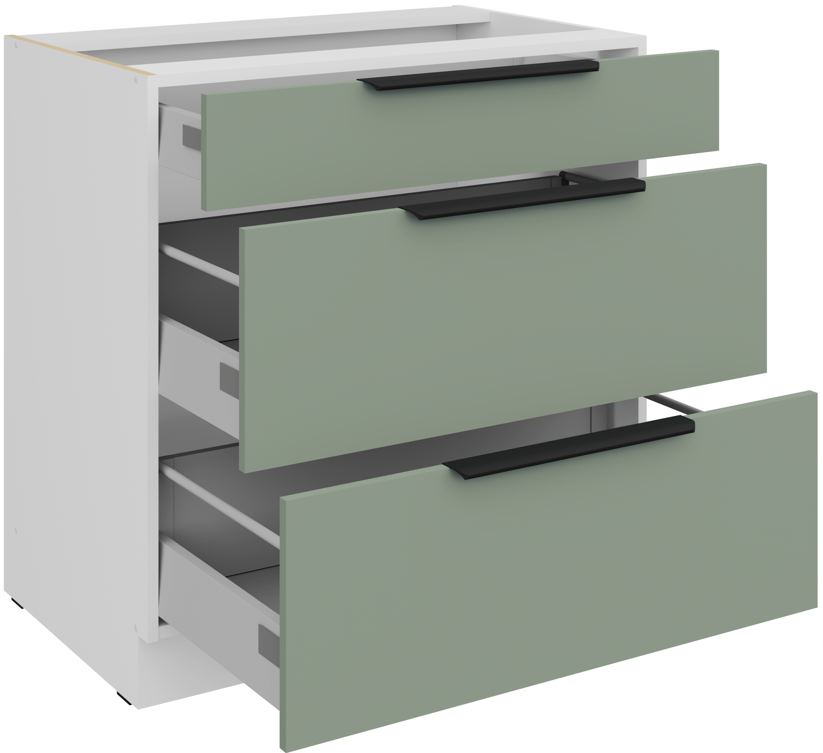 Osnova kuhinjskog sastava je okvir od iverala, što osigurava konstrukcijsku stabilnost i otpornost na svakodnevna opterećenja. Površina od laminirane ploče debljine 16 mm otporna je na ogrebotine, mrlje i toplinu, što je čini prikladnom za intenzivnu kuhinjsku upotrebu. Sve fronte i ladice opremljene su sustavom za tiho zatvaranje, koji sprječava iznenadne udarce i omogućuje meko zatvaranje vrata. Ovaj mehanizam ne doprinosi samo udobnosti, već i dužem vijeku trajanja okova.