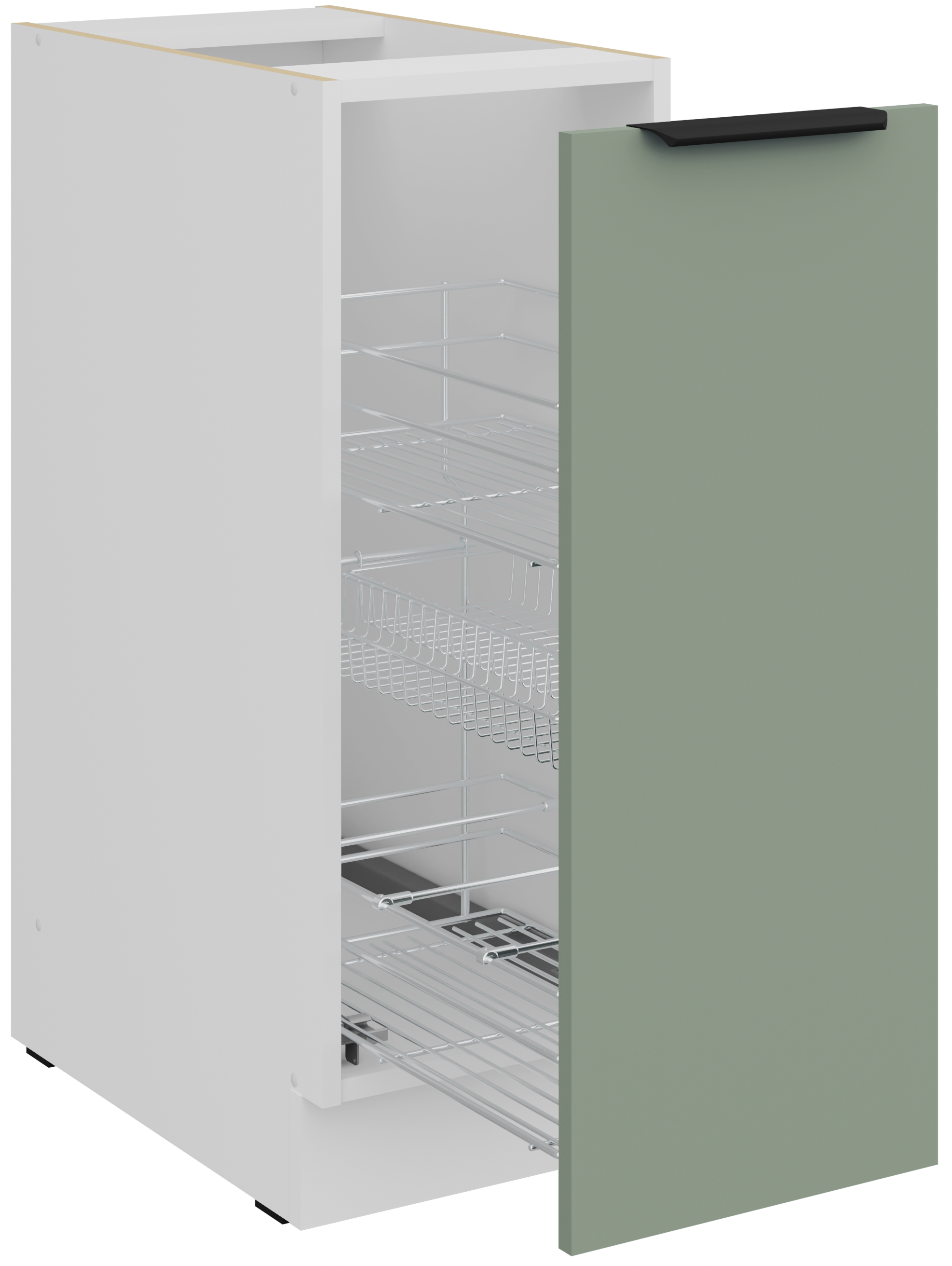 Osnova kuhinjskog seta je okvir od iverala, što osigurava konstrukcijsku stabilnost i otpornost na svakodnevna opterećenja. Površina od laminirane ploče debljine 16 mm otporna je na ogrebotine, mrlje i toplinu, što je čini prikladnom za intenzivnu kuhinjsku upotrebu. Sve fronte i ladice opremljene su sustavom za tiho zatvaranje koji sprječava nagle udarce i omogućuje mekano zatvaranje vratica. Ovaj mehanizam ne doprinosi samo udobnosti, već i duljem vijeku trajanja okova.