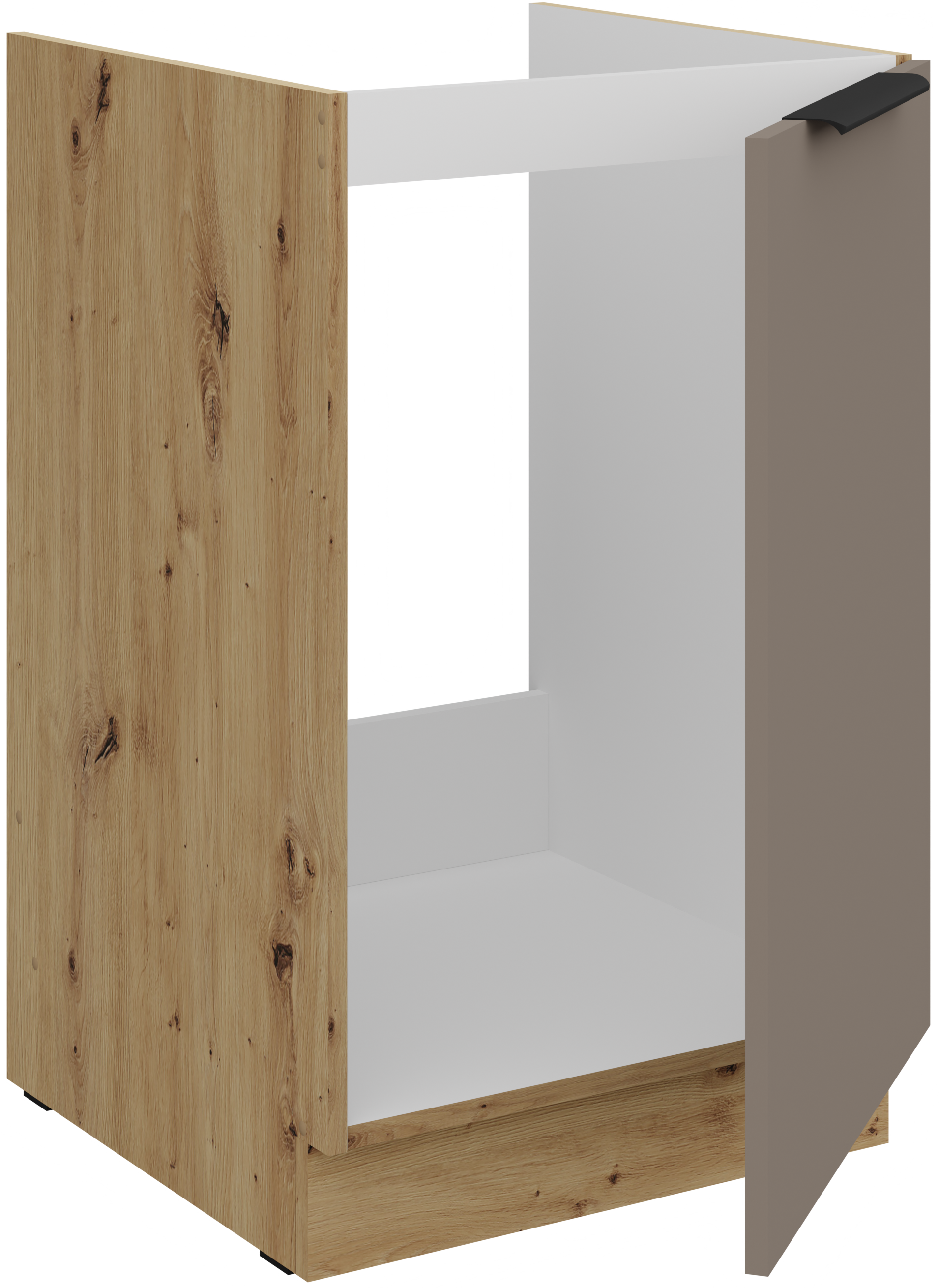 Osnovni materijal kuhinjskog seta Aria je laminirana ploča debljine 16 mm, koja se odlikuje izvrsnom stabilnošću i otpornošću na habanje. Površina u nijansi sandgrau/artisan hrast spaja suvremenu sivinu i toplinu prirodnog drva, što stvara uravnotežen estetski dojam. Rubovi su precizno obrađeni i zaštićeni, što dodatno pridonosi izdržljivosti elemenata. Okvir je izrađen od iverala, koji osigurava strukturnu stabilnost i estetsku cjelovitost.
