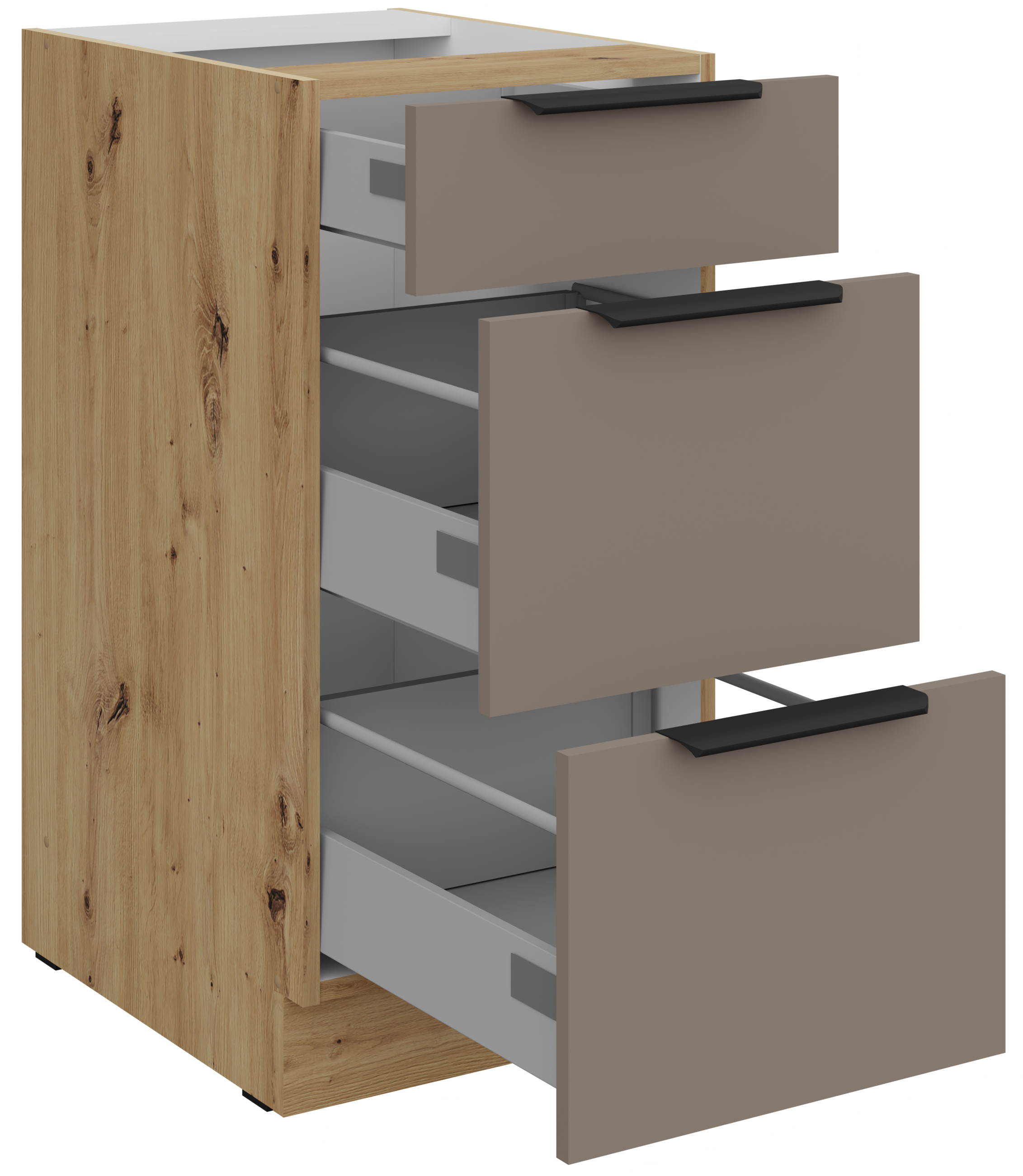 Osnovni materijal kuhinjskog seta Aria je laminirana ploča debljine 16 mm, koja se odlikuje izvrsnom stabilnošću i otpornošću na trošenje. Površina u nijansi sandgrau/artisan hrast spaja suvremenu sivinu i toplinu prirodnog drva, što stvara uravnotežen estetski dojam. Rubovi su precizno obrađeni i zaštićeni, što dodatno doprinosi izdržljivosti elemenata. Okvir je izrađen od iverala, koji osigurava strukturnu stabilnost i estetsku cjelovitost cjeline.
