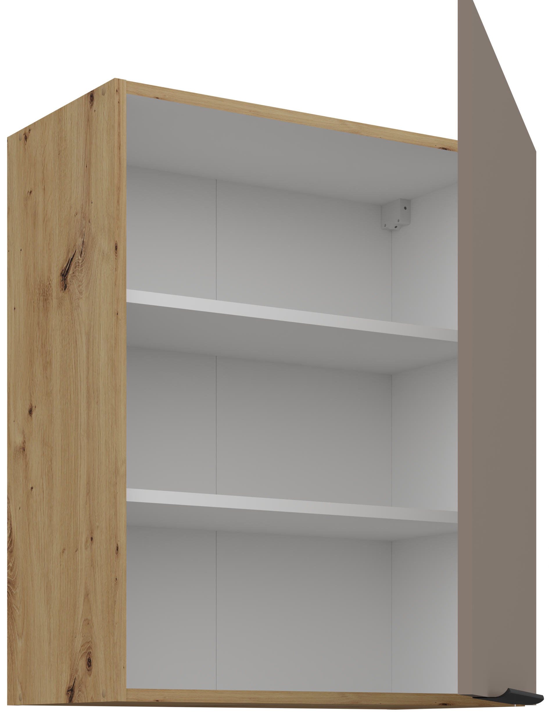 Osnovni materijal kuhinjskog sastava Aria je laminirana ploča debljine 16 mm, koja se odlikuje izvrsnom stabilnošću i otpornošću na habanje. Površina u nijansi sandgrau/artisan hrast spaja suvremenu sivinu i toplinu prirodnog drva, što stvara uravnotežen estetski dojam. Rubovi su precizno obrađeni i zaštićeni, što dodatno doprinosi izdržljivosti elemenata. Okvir je izrađen od iverala, koji osigurava strukturnu stabilnost i estetsku dovršenost cjeline.