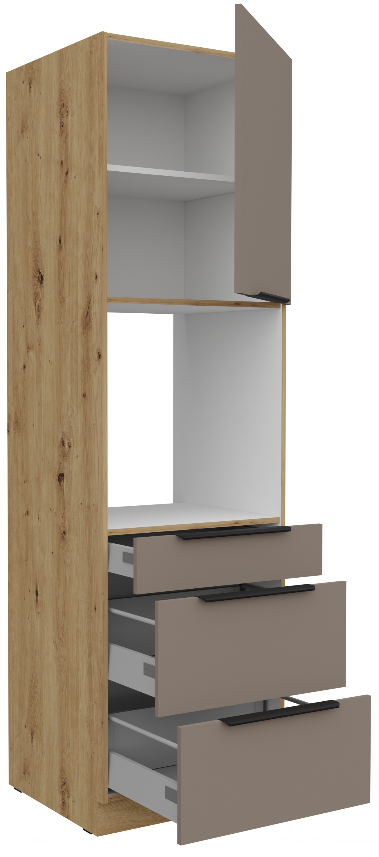 Osnovni materijal kuhinjskog sastava Aria je laminirana ploča debljine 16 mm, koja se odlikuje izvrsnom stabilnošću i otpornošću na trošenje. Površina u nijansi sandgrau/artisan hrast spaja modernu sivinu i toplinu prirodnog drva, što stvara uravnotežen estetski dojam. Rubovi su precizno obrađeni i zaštićeni, što dodatno pridonosi izdržljivosti elemenata. Okvir je izrađen od iverala, koji osigurava strukturnu stabilnost i estetsku cjelovitost cjeline.