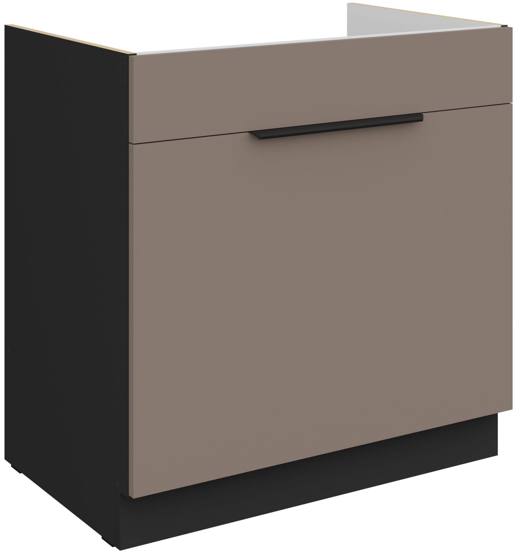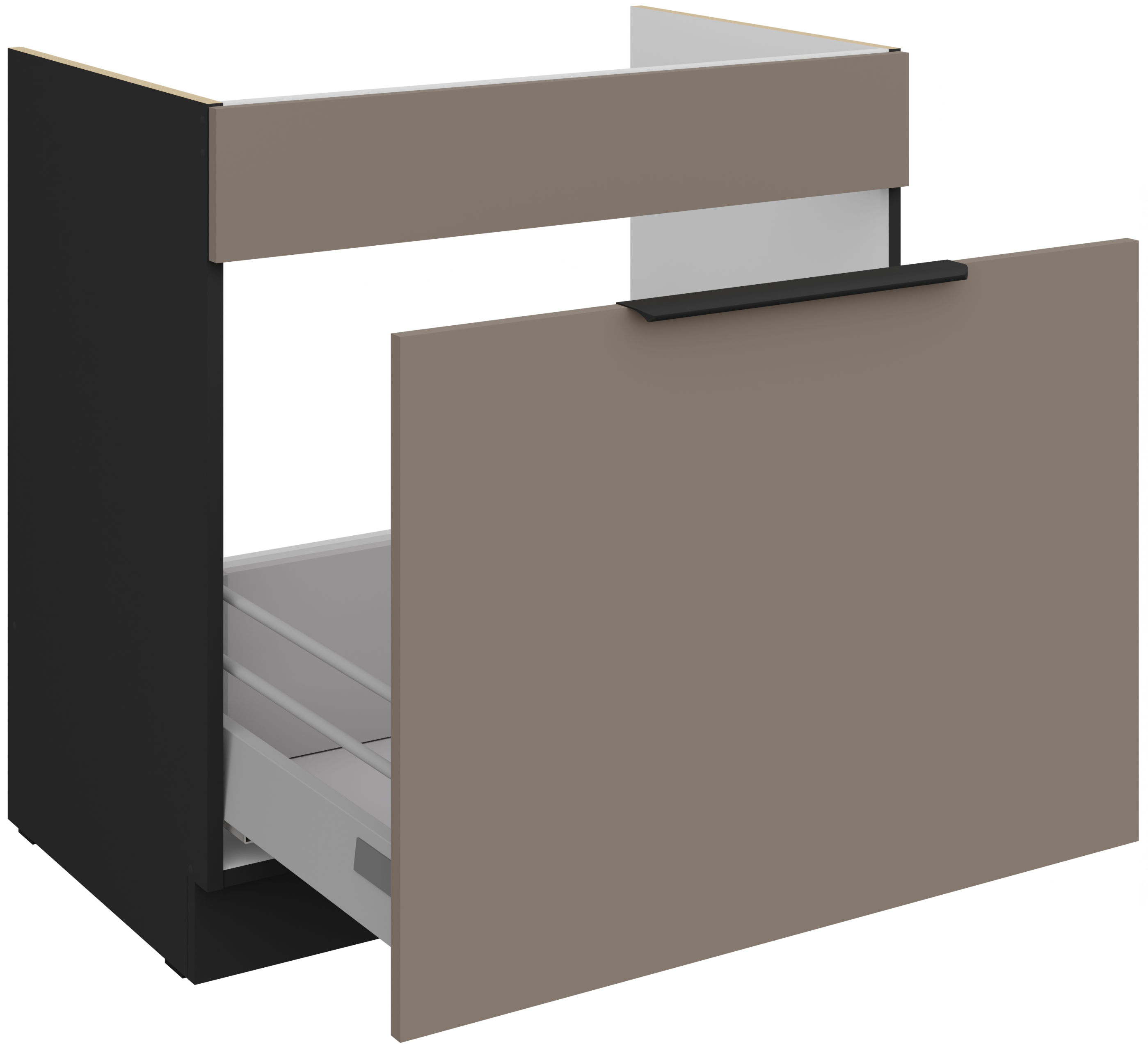 Kolor kombinacija sandgrau/crna stvara moderan, a istovremeno topao izgled kuhinje. Svjetliji ton “sandgrau” donosi osjećaj prostranosti i svježine, dok crni naglasci dodaju profinjen kontrast i eleganciju. Takva kombinacija izvrsno se slaže s različitim vrstama podnih obloga i kuhinjskih dodataka, pa omogućuje širok spektar unutarnjih postavki i osobnih prilagodbi.