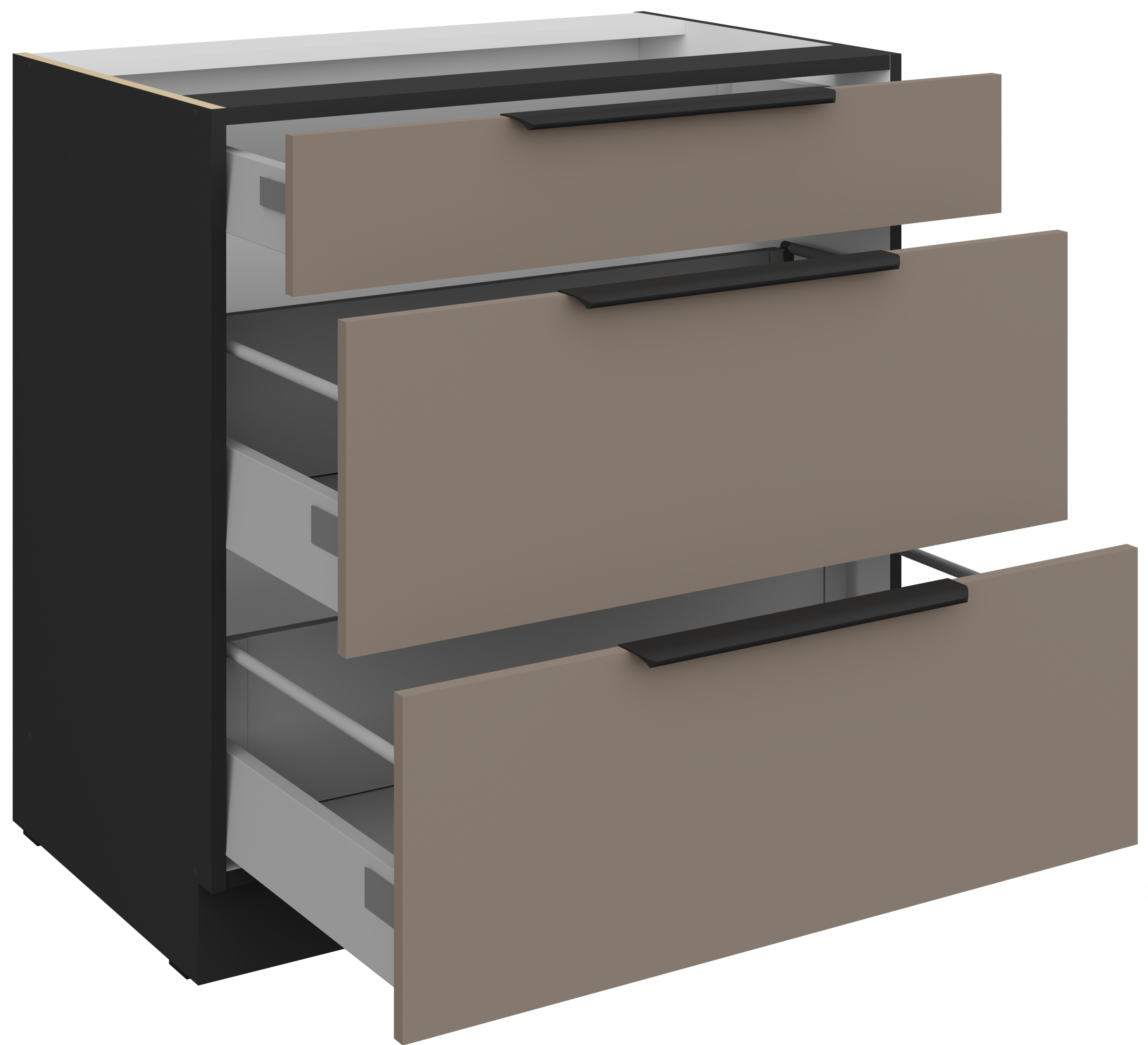 Kolor kombinacija sandgrau/crna stvara moderan, a istodobno topao izgled kuhinje. Svjetlija nijansa “sandgrau” donosi osjećaj prostranosti i svježine, dok crni naglasci dodaju profinjen kontrast i eleganciju. Takva kombinacija izvrsno se slaže s različitim vrstama podnih obloga i kuhinjskih dodataka, omogućujući širok spektar unutarnjih postavki i osobnih prilagodbi.