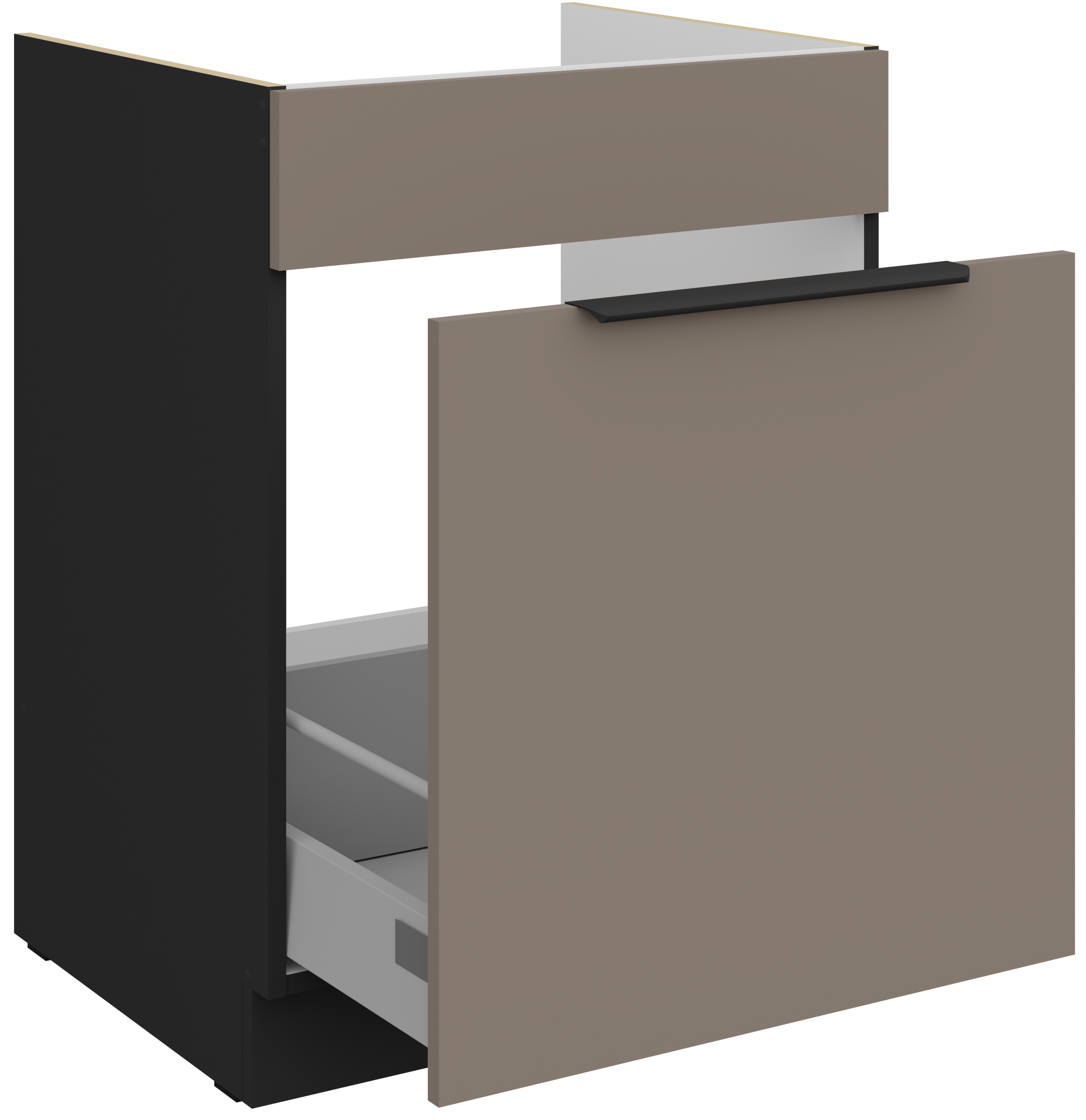 Kolor kombinacija sandgrau/crna stvara moderan, a istovremeno topao izgled kuhinje. Svjetliji ton “sandgrau” donosi osjećaj prostranosti i svježine, dok crni naglasci dodaju profinjen kontrast i eleganciju. Takva kombinacija izvrsno se slaže s različitim vrstama podnih obloga i kuhinjskih dodataka, pa omogućuje širok spektar unutarnjih postavki i osobnih prilagodbi.