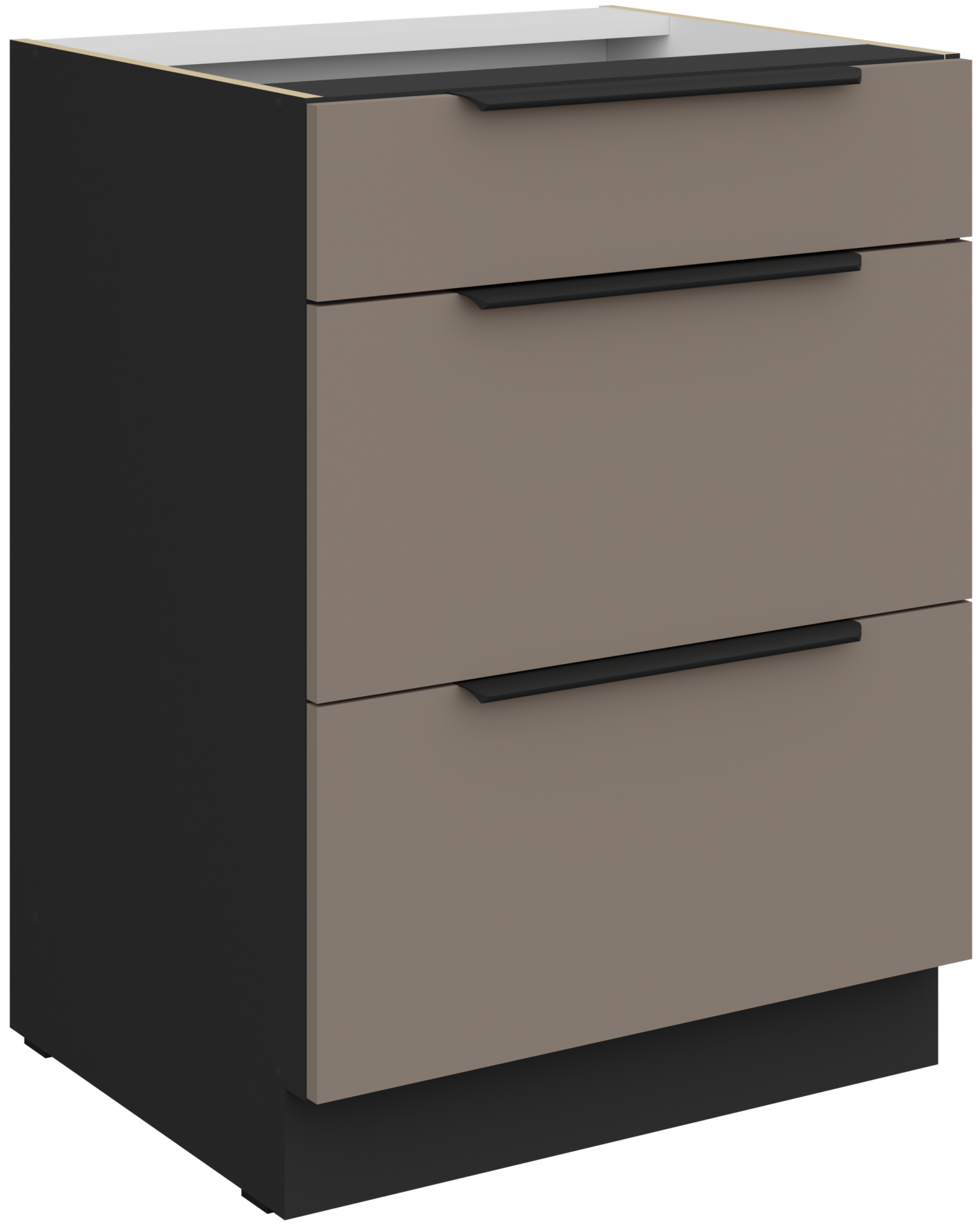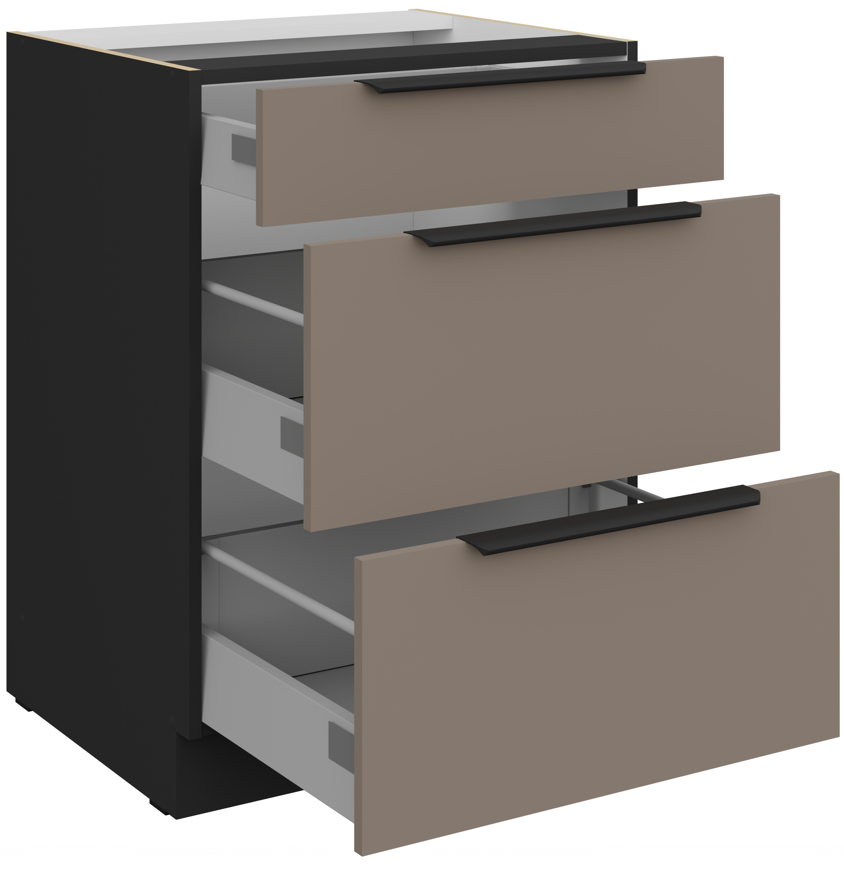Kolor kombinacija sandgrau/crna stvara moderan, a istovremeno topao izgled kuhinje. Svjetlija nijansa “sandgrau” donosi osjećaj prostranosti i svježine, dok crni naglasci dodaju profinjen kontrast i eleganciju. Takva kombinacija odlično se uklapa s različitim vrstama podnih obloga i kuhinjskih dodataka, pa omogućuje širok spektar unutarnjih postavki i osobnih prilagodbi.
