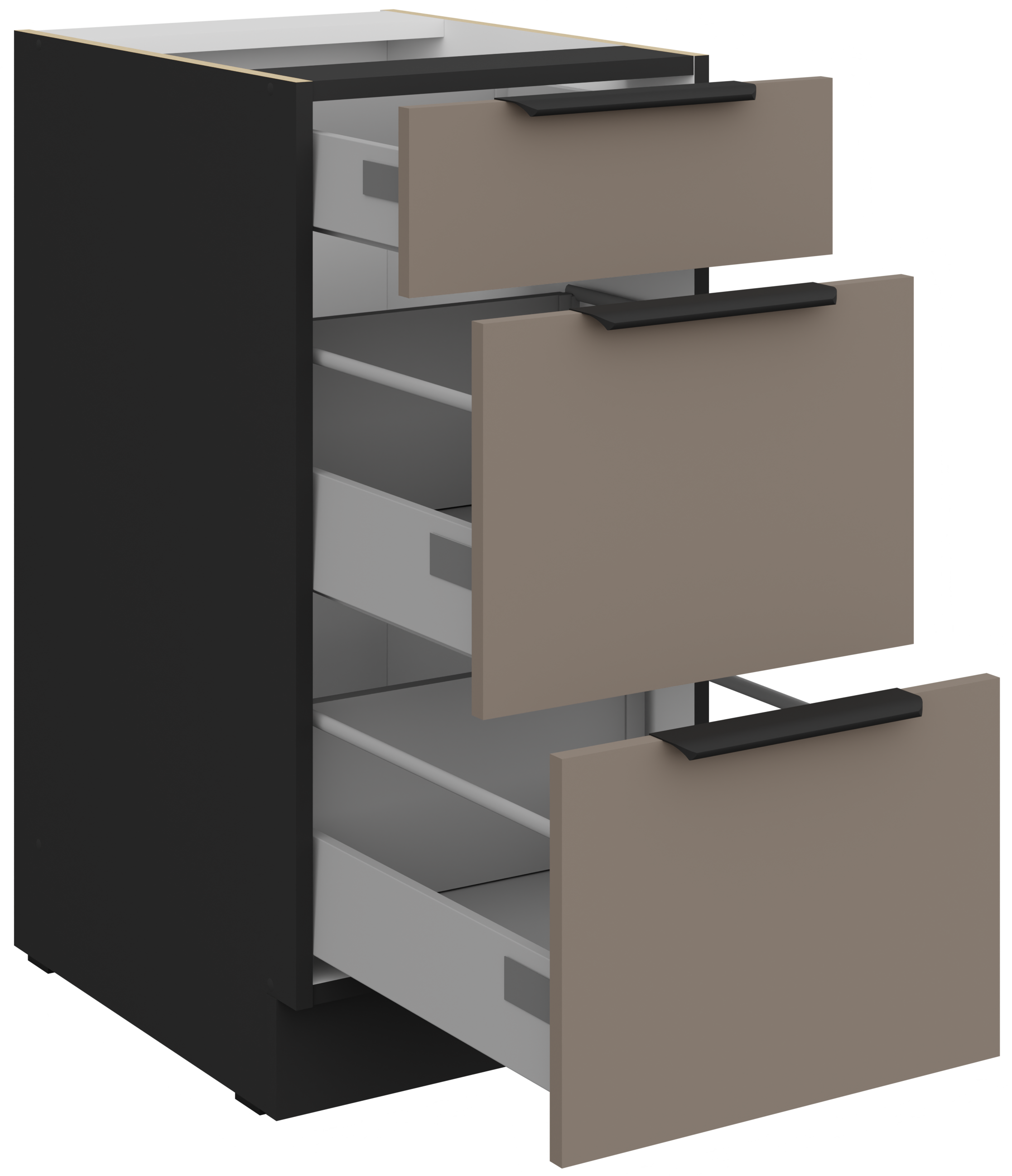 Kolor kombinacija sandgrau/crna stvara moderan, a istovremeno topao izgled kuhinje. Svjetlija nijansa “sandgrau” donosi osjećaj prostranosti i svježine, dok crni naglasci dodaju profinjeni kontrast i eleganciju. Takva kombinacija odlično se slaže s različitim vrstama podnih obloga i kuhinjskih dodataka, pa omogućuje širok spektar unutarnjih postavki i osobnih prilagodbi.