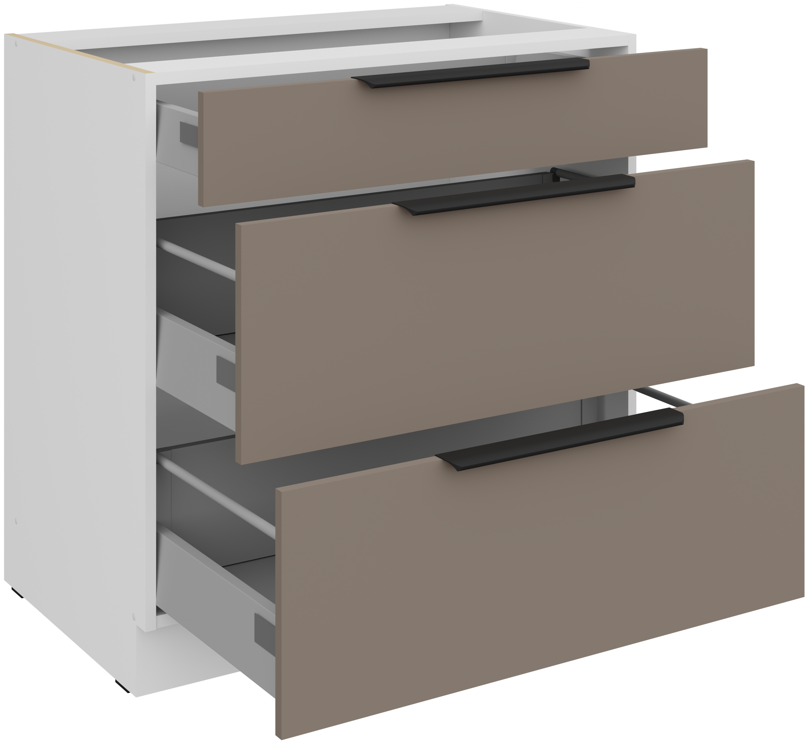 Kombinacija boja sandgrau/bijela (pješčano siva i bijela) stvara svijetao, prozračan dojam, a istovremeno dodaje osjećaj topline i čistoće. Takav dizajn omogućuje jednostavno kombiniranje s različitim vrstama dekora, podnih obloga i dodataka. Bijela boja vizualno povećava prostor i stvara osjećaj urednosti, dok pješčano sivi tonovi dodaju moderan dodir i eleganciju. Ručke edge UA‑HEXA u crno‑aluminijskoj izvedbi minimalističke su, ali istodobno upečatljive jer spajaju estetiku i praktičnost. Razmak ručki iznosi od 64 mm do 320 mm, što omogućuje udobno korištenje svih vrata i ladica.