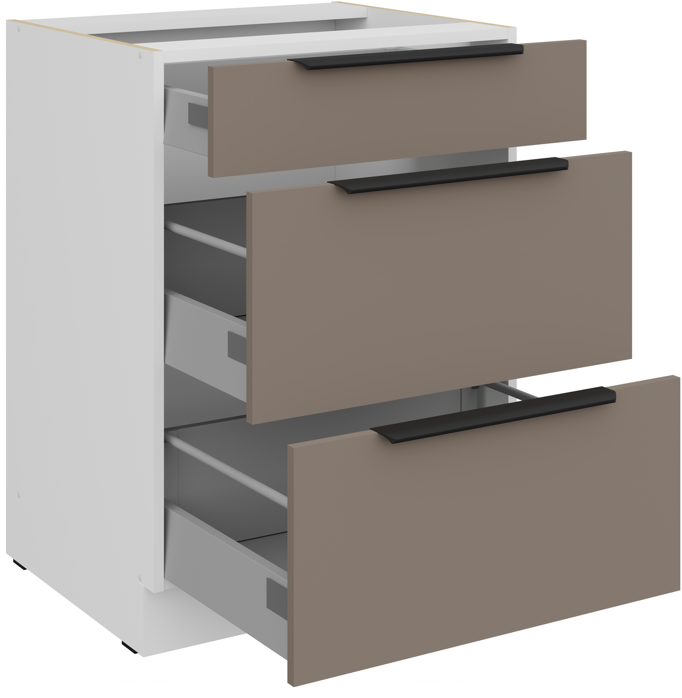 Kombinacija boja sandgrau/bijela (pješčano siva i bijela) stvara svijetao, prozračan dojam, a ujedno dodaje osjećaj topline i čistoće. Takav dizajn omogućuje jednostavno kombiniranje s različitim vrstama dekora, podnih obloga i dodataka. Bijela boja vizualno povećava prostor i stvara osjećaj urednosti, dok pješčano sivi tonovi dodaju moderan dodir i eleganciju. Ručke edge UA‑HEXA u crno‑aluminijskoj izvedbi minimalističke su, a istovremeno upečatljive, jer spajaju estetiku i praktičnost. Razmak ručki iznosi od 64 mm do 320 mm, što omogućuje udobno korištenje svih vrata i ladica.