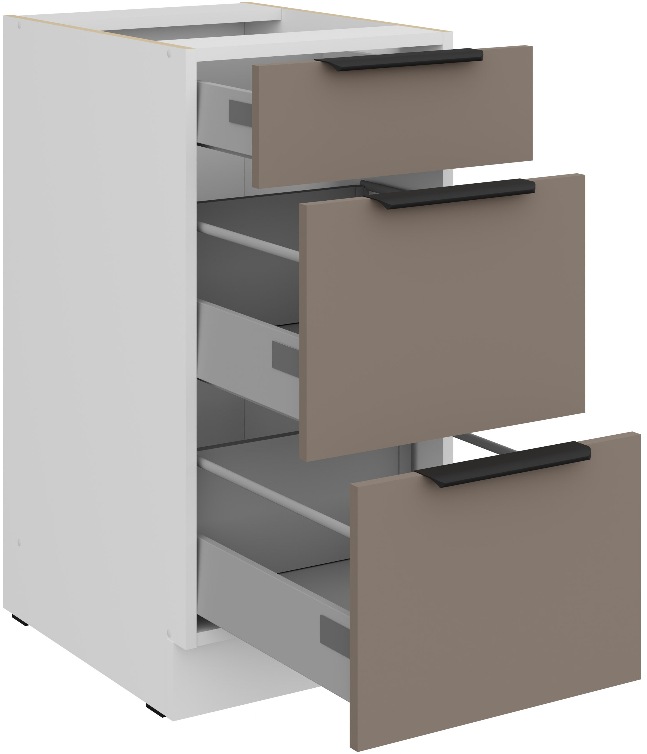 Kombinacija boja sandgrau/bijela (pješčano siva i bijela) stvara svijetao, prozračan dojam, a istovremeno dodaje osjećaj topline i čistoće. Takav dizajn omogućuje jednostavno kombiniranje s različitim vrstama dekora, podnih obloga i dodataka. Bijela boja vizualno povećava prostor i stvara osjećaj urednosti, dok pješčano sivi tonovi dodaju moderan dodir i eleganciju. Ručke edge UA‑HEXA u crno‑aluminijskoj izvedbi minimalističke su, ali istovremeno upečatljive jer spajaju estetiku i praktičnost. Razmak ručki iznosi od 64 mm do 320 mm, što omogućuje udobnu upotrebu svih vrata i ladica.