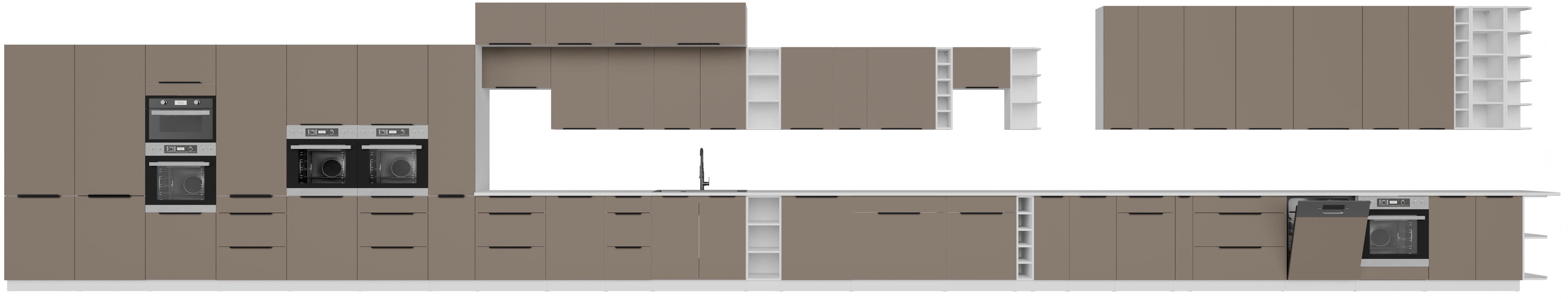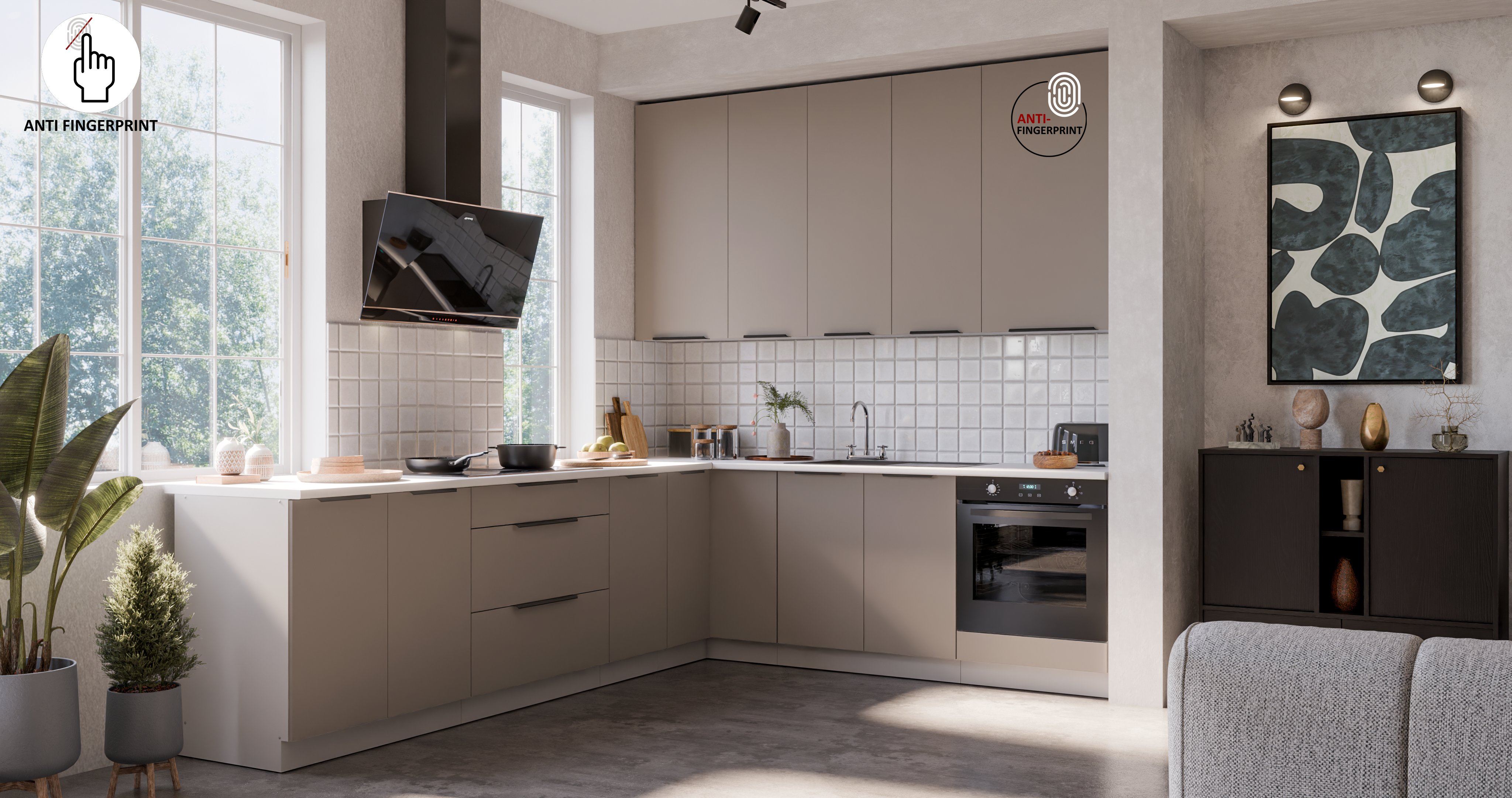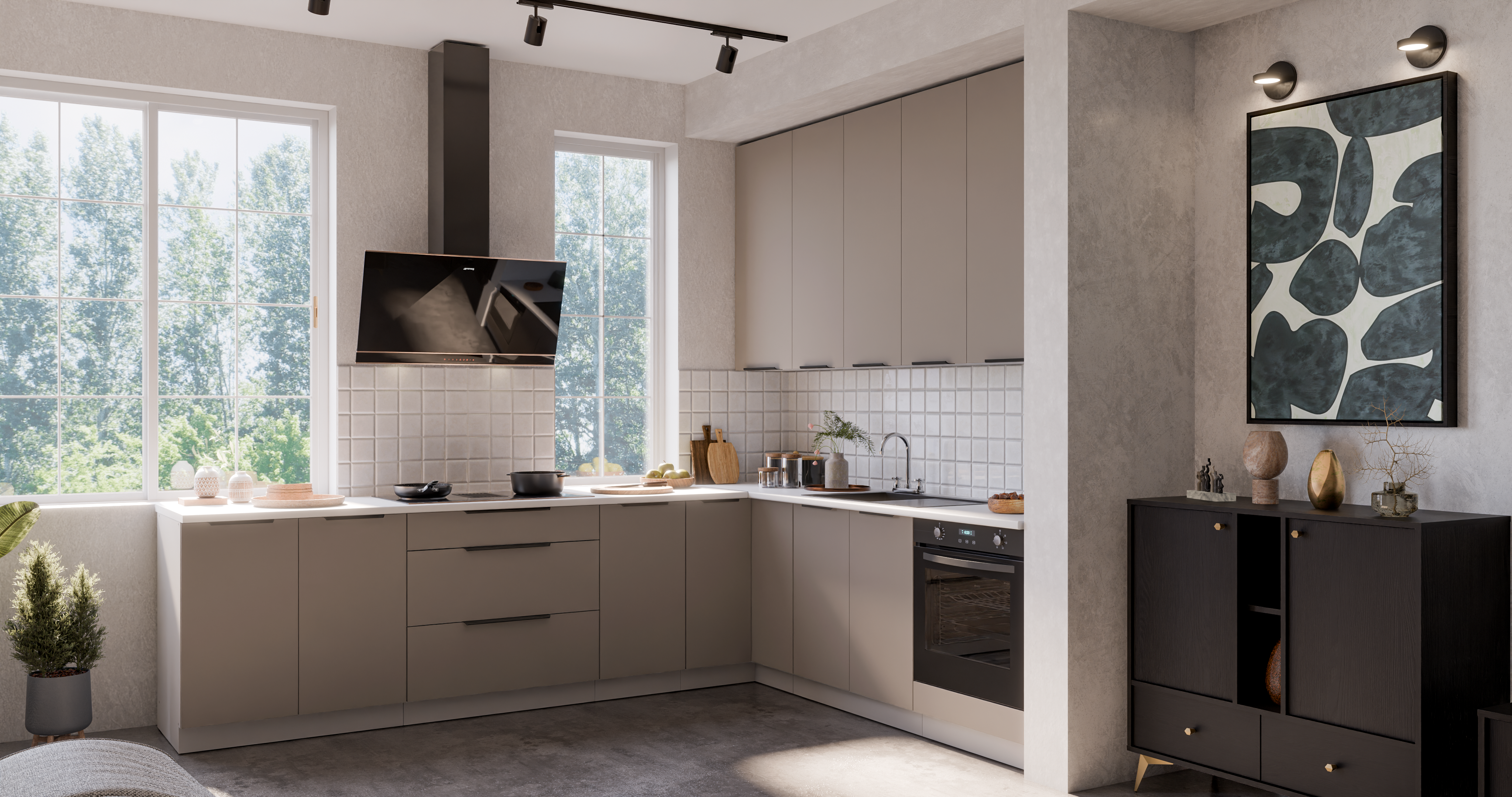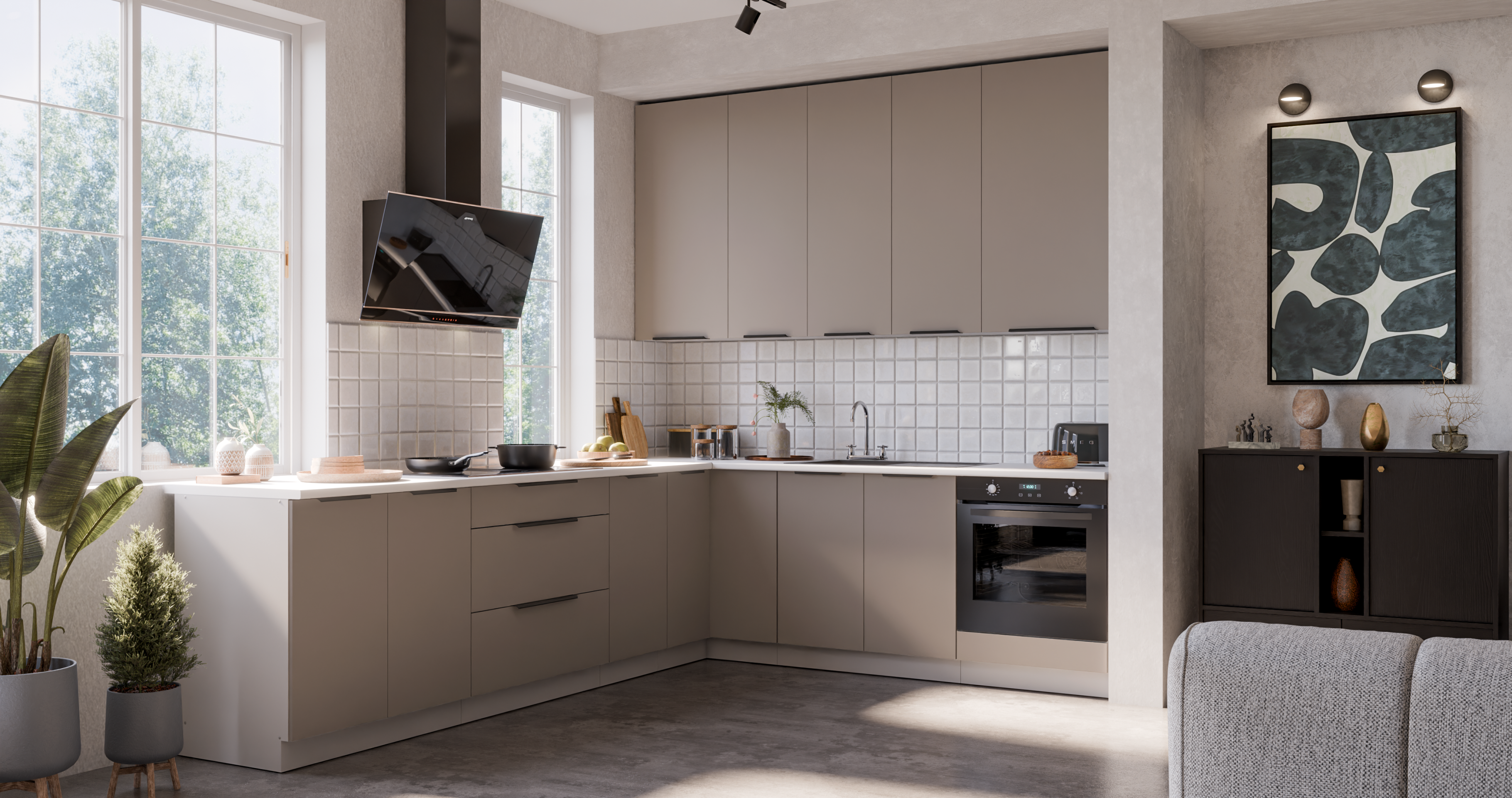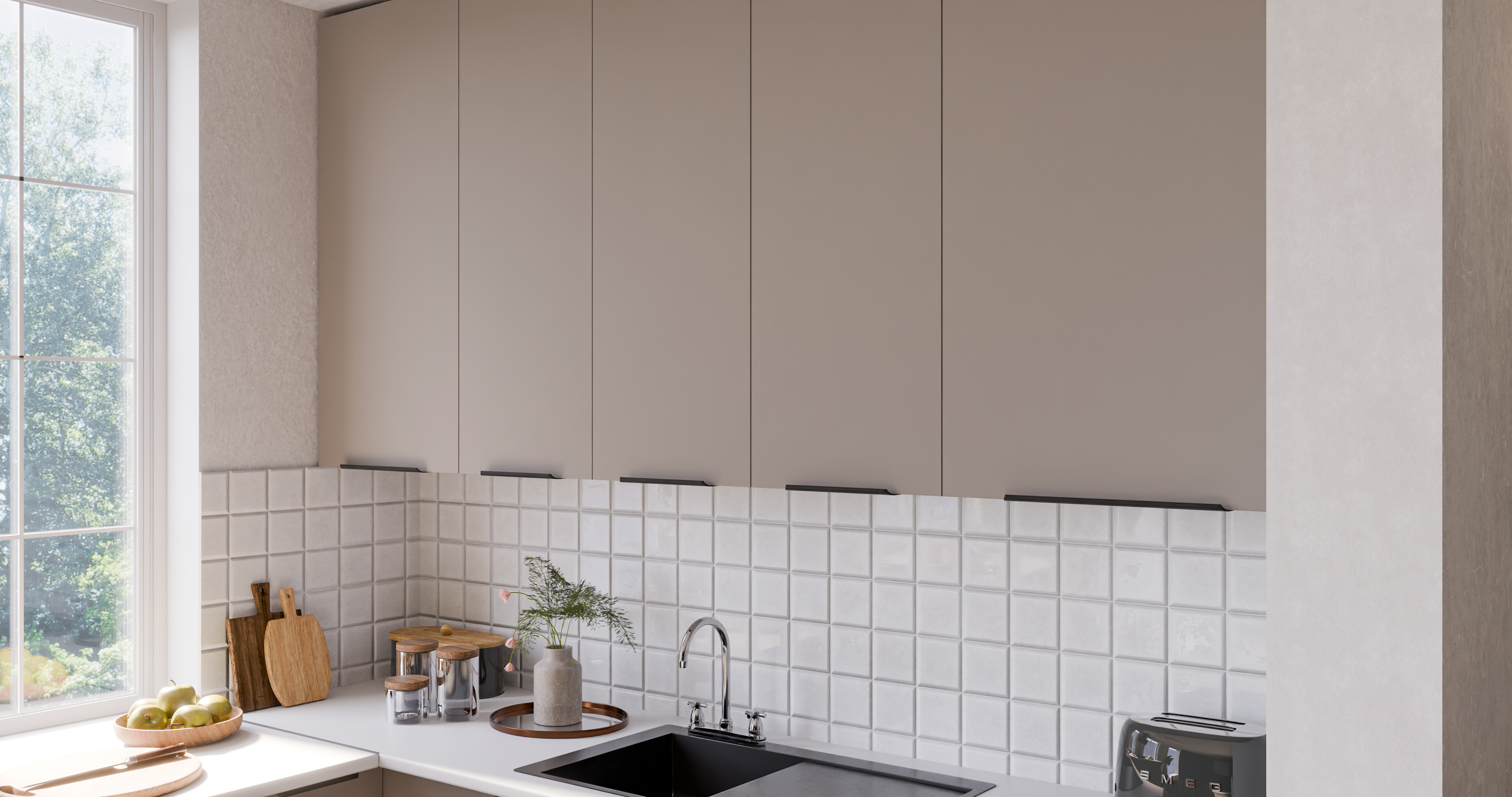 Kombinacija boja sandgrau/bijela (pješčano siva i bijela) stvara svijetao, prozračan dojam, a istovremeno dodaje osjećaj topline i čistoće. Takav dizajn omogućuje jednostavno kombiniranje s različitim vrstama dekora, podnih obloga i dodataka. Bijela boja vizualno povećava prostor i stvara dojam urednosti, dok pješčano sivi tonovi dodaju moderan štih i eleganciju. Ručke edge UA‑HEXA u crno‑aluminijskoj izvedbi minimalističke su, ali istodobno upečatljive jer spajaju estetiku i praktičnost. Razmak ručki iznosi od 64 mm do 320 mm, što omogućuje udobnu upotrebu svih vrata i ladica.