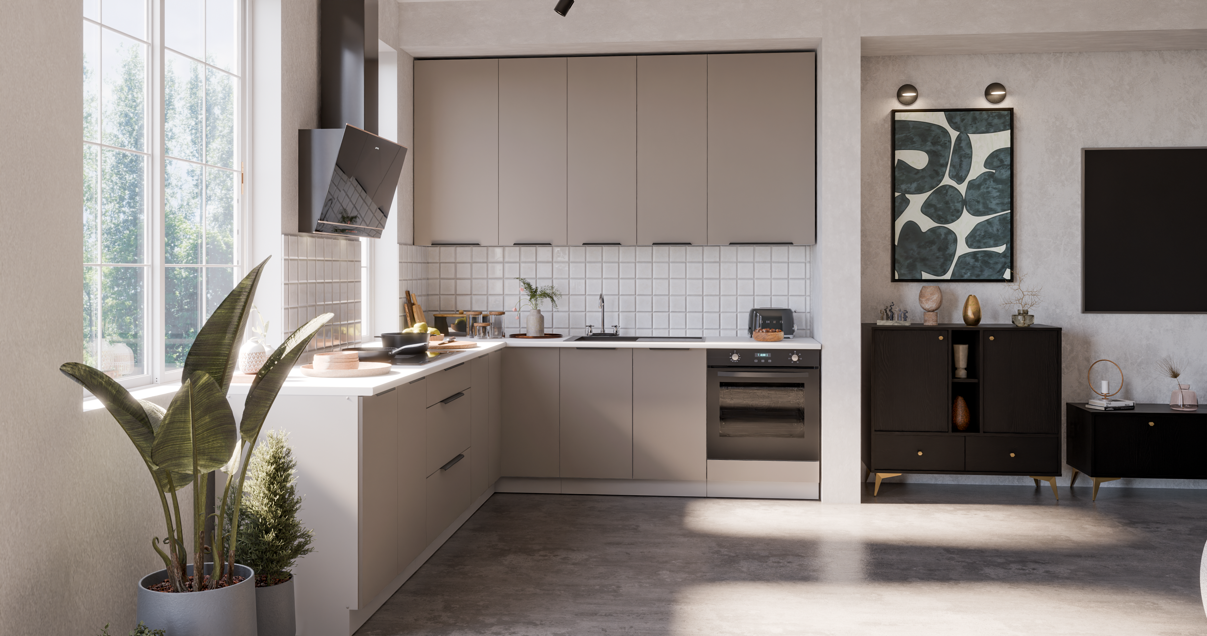 Kuhinjski sastav Aria u kolor kombinaciji sandgrau/bijela spaja moderan izgled, funkcionalnost i kvalitetnu izradu. Izrađen je od izdržljive laminirane ploče debljine 16 mm, koja osigurava otpornost na svakodnevnu upotrebu i jednostavno čišćenje. Dizajn kuhinje promišljen je tako da omogućuje učinkovito raspoređivanje elemenata te optimalno iskorištavanje prostora u manjim i većim kuhinjskim ambijentima. Zahvaljujući vrhunskoj izvedbi i neutralnim tonovima boja, sastav Aria lijepo se uklapa u moderne unutarnje trendove i različite boje zidova ili podnih obloga.