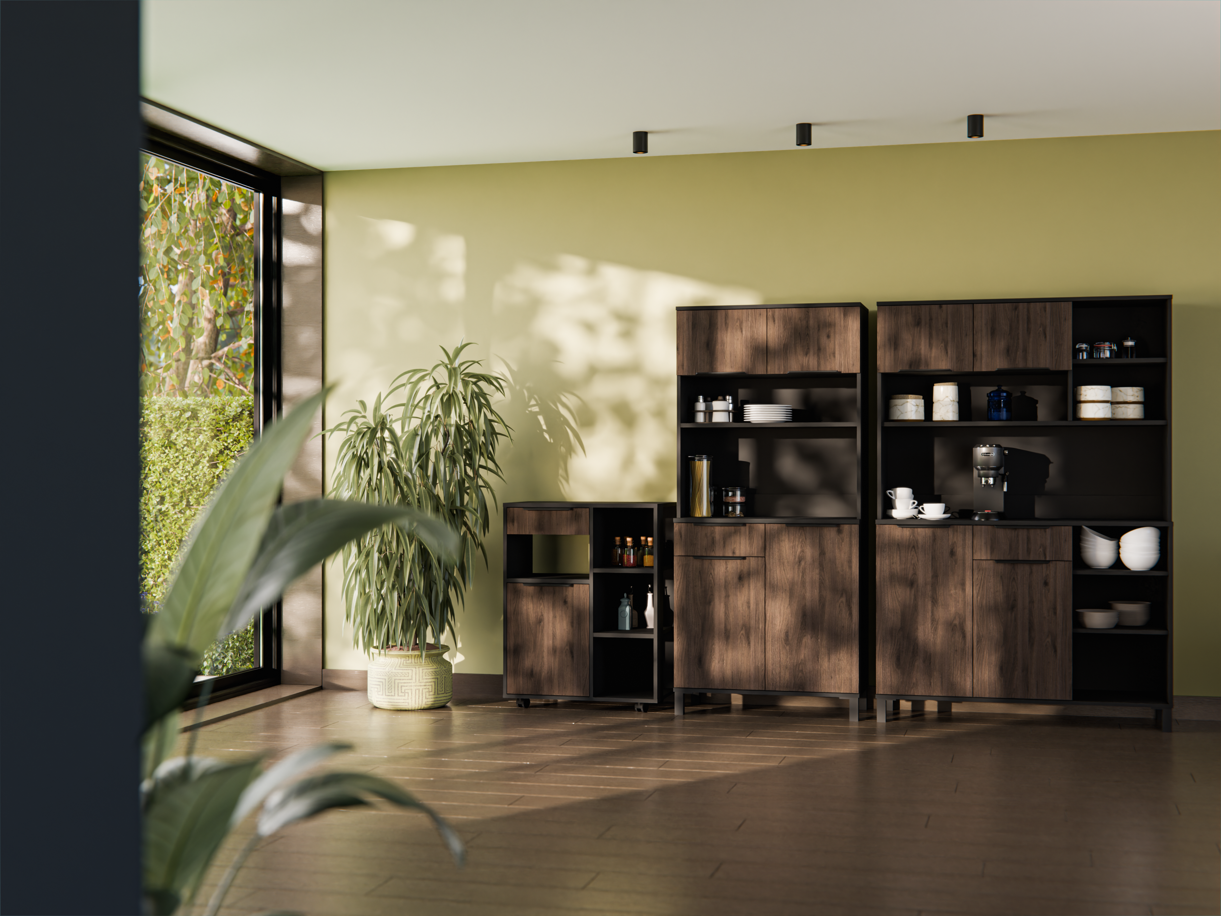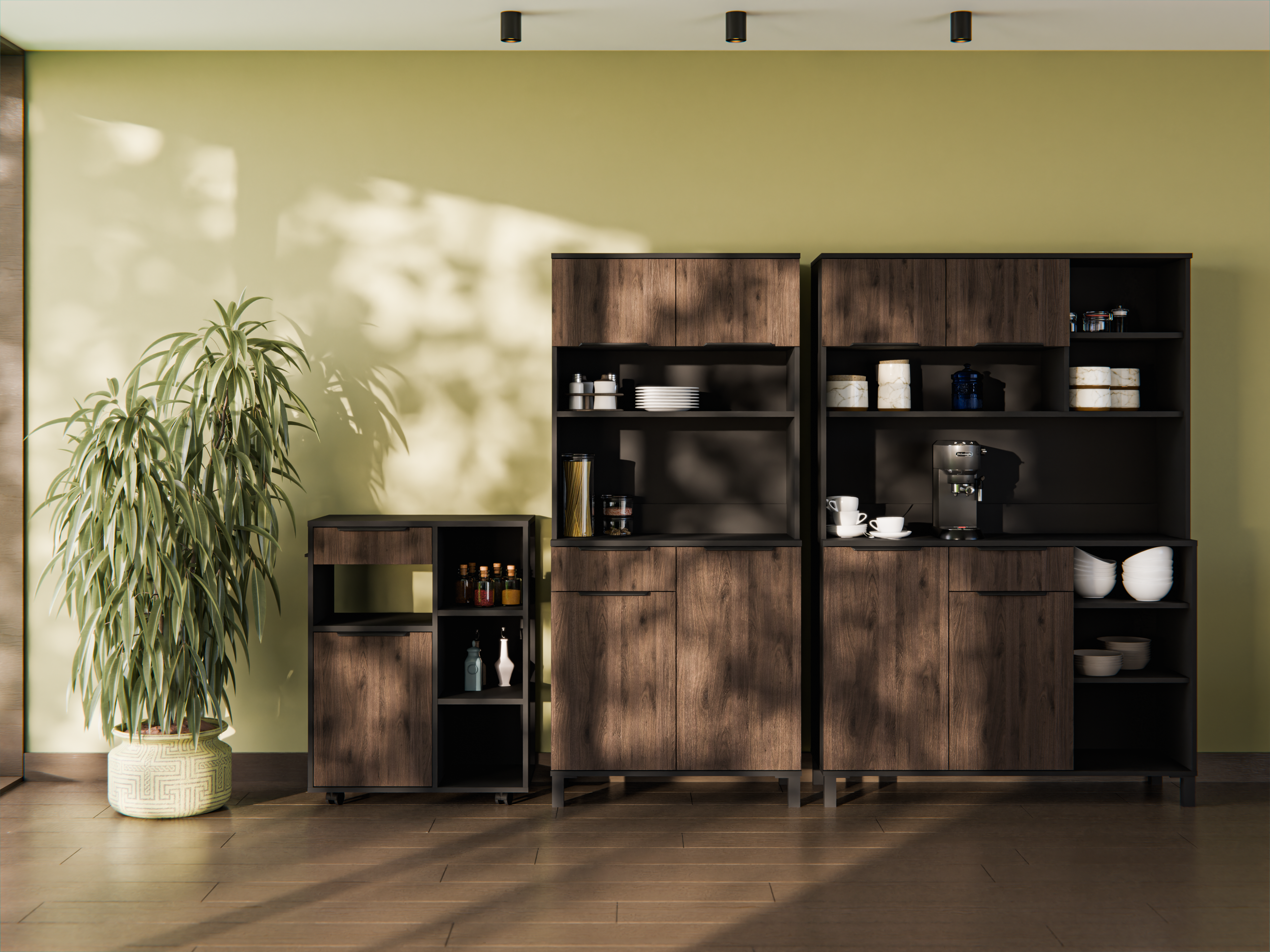 Kombinacija boja u nijansama orah okapi i crna osigurava topao, a istovremeno elegantan izgled. Uzorak oraha donosi prirodnu teksturu drveta, dok crna površina dodaje dašak minimalizma i profinjenosti. Ova kombinacija omogućuje da se sastav Monza lijepo uklopi s različitim zidnim i podnim oblogama te drugim kuhinjskim elementima. Boja proizvoda označena je kao antracit, što daje dodatnu dubinu i moderan dojam prostoru.