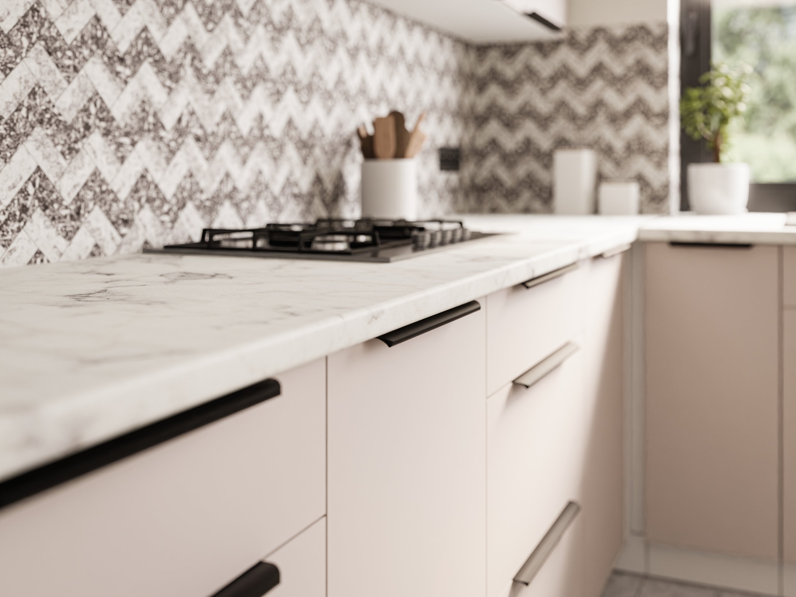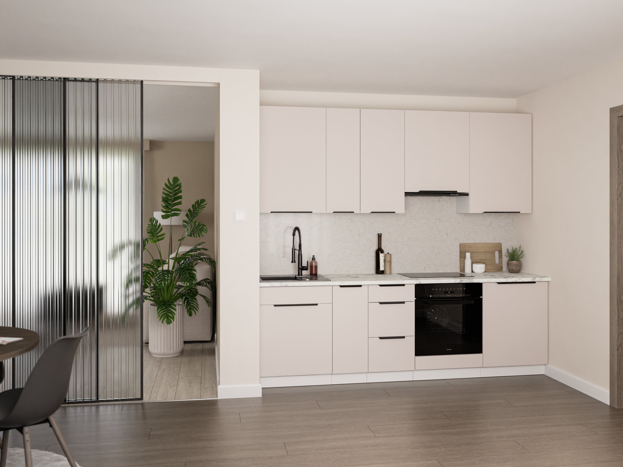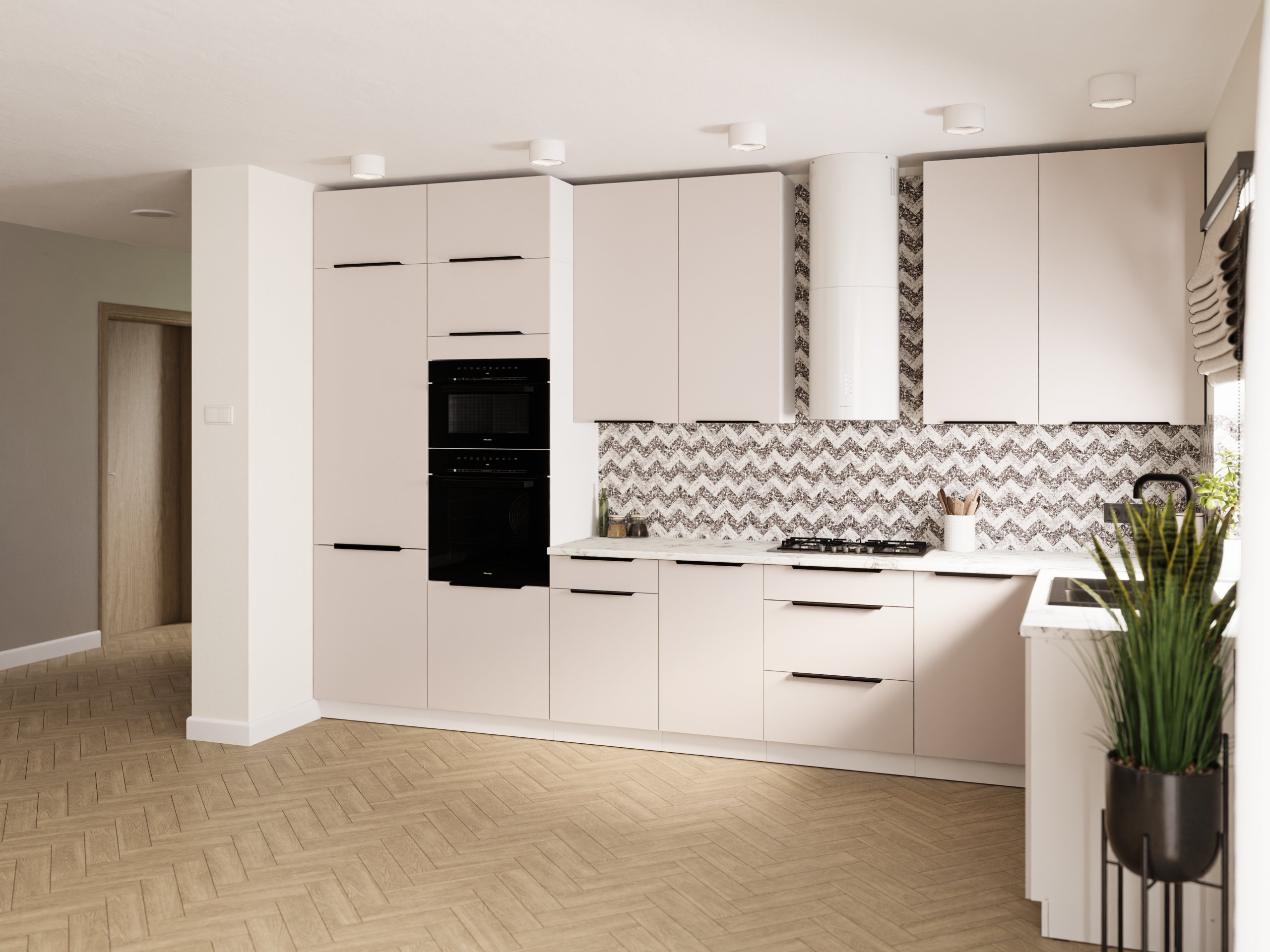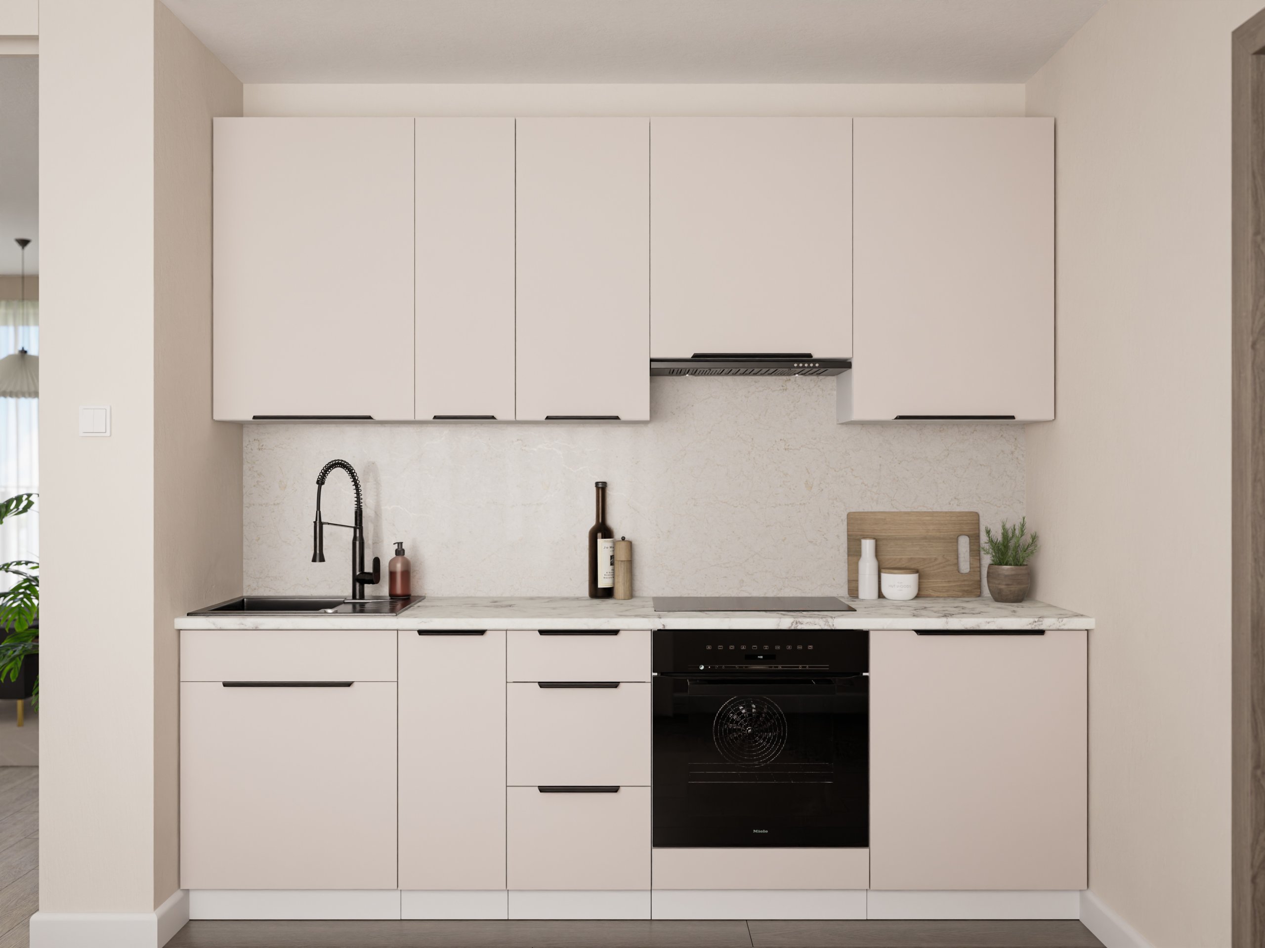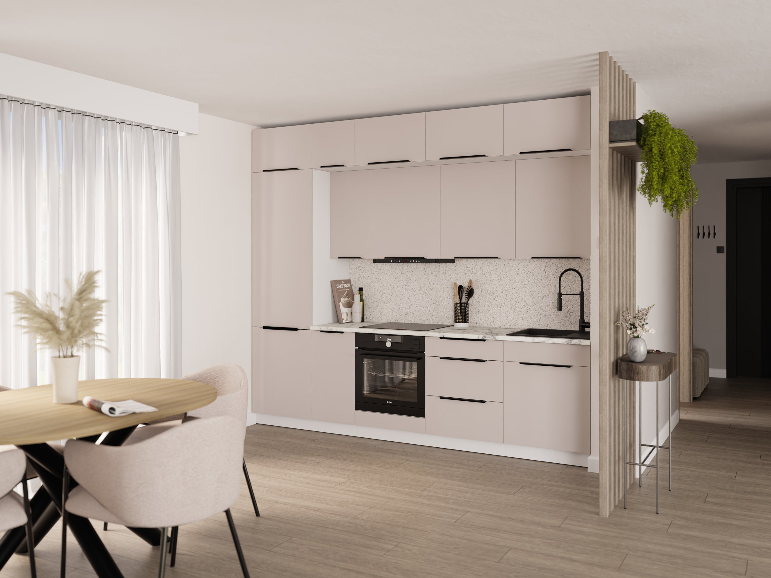 Frontu u toploj boji kašmira nadopunjuje snježno bijeli korpus, što kuhinji daje dojam prozračnosti i prostranosti. Laminirana površina otporna je na ogrebotine i jednostavna za čišćenje, pa je idealna za svakodnevnu upotrebu. Površine zadržavaju svoj izgled i nakon više godina korištenja, jer materijal ne gubi boju i ne deformira se pri uobičajenim temperaturnim promjenama u kuhinji.