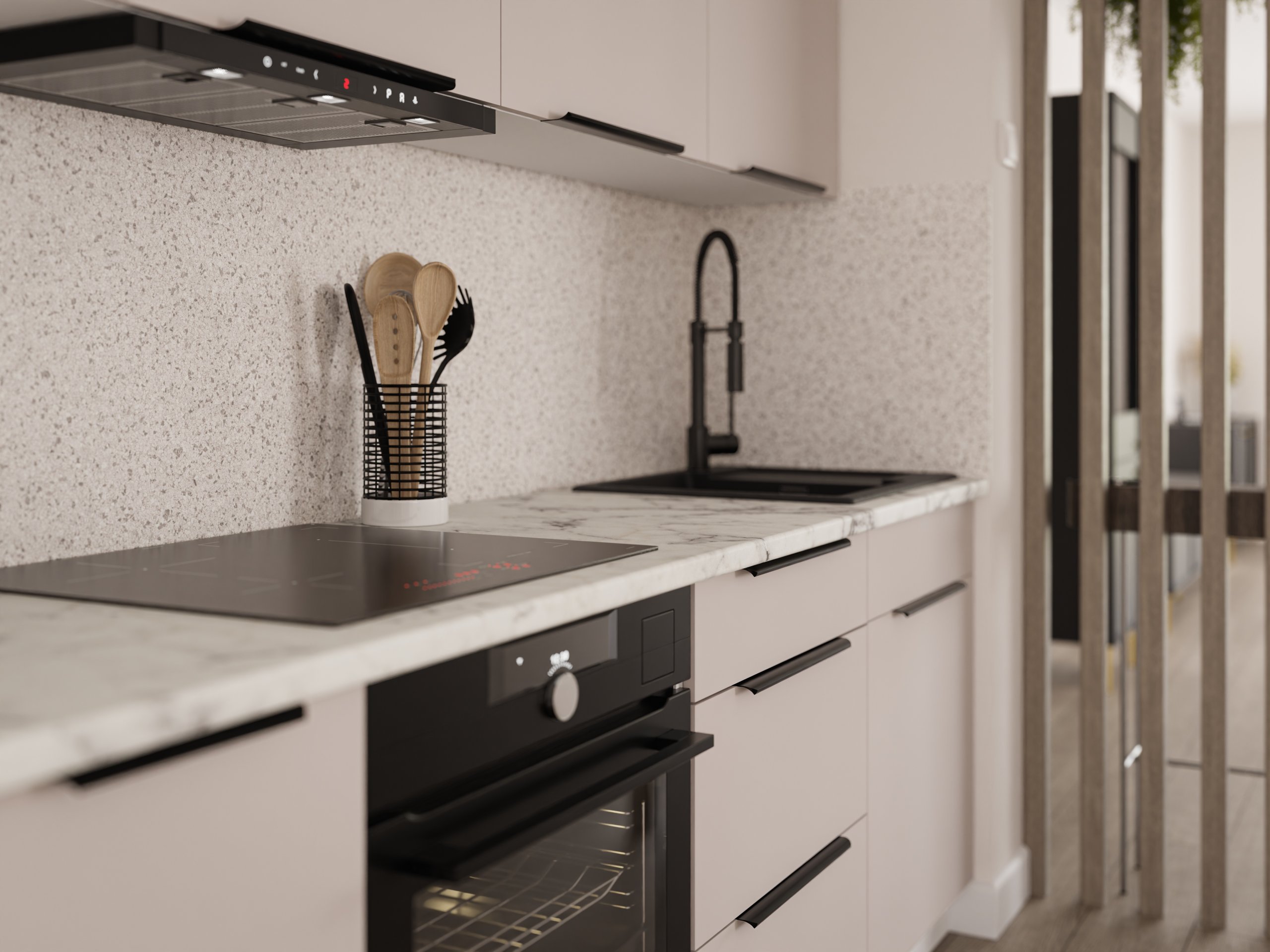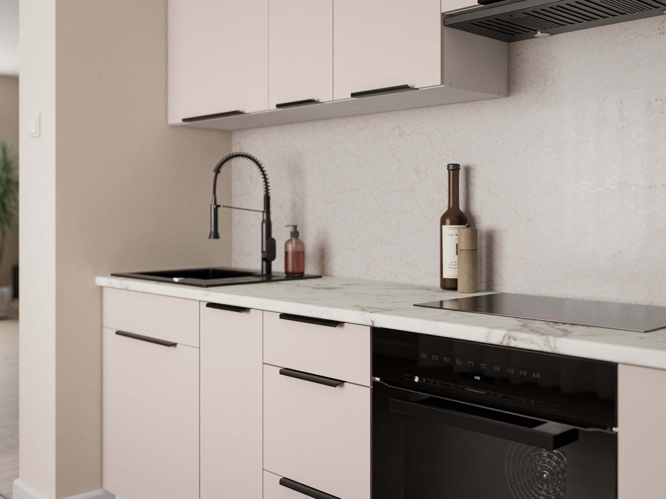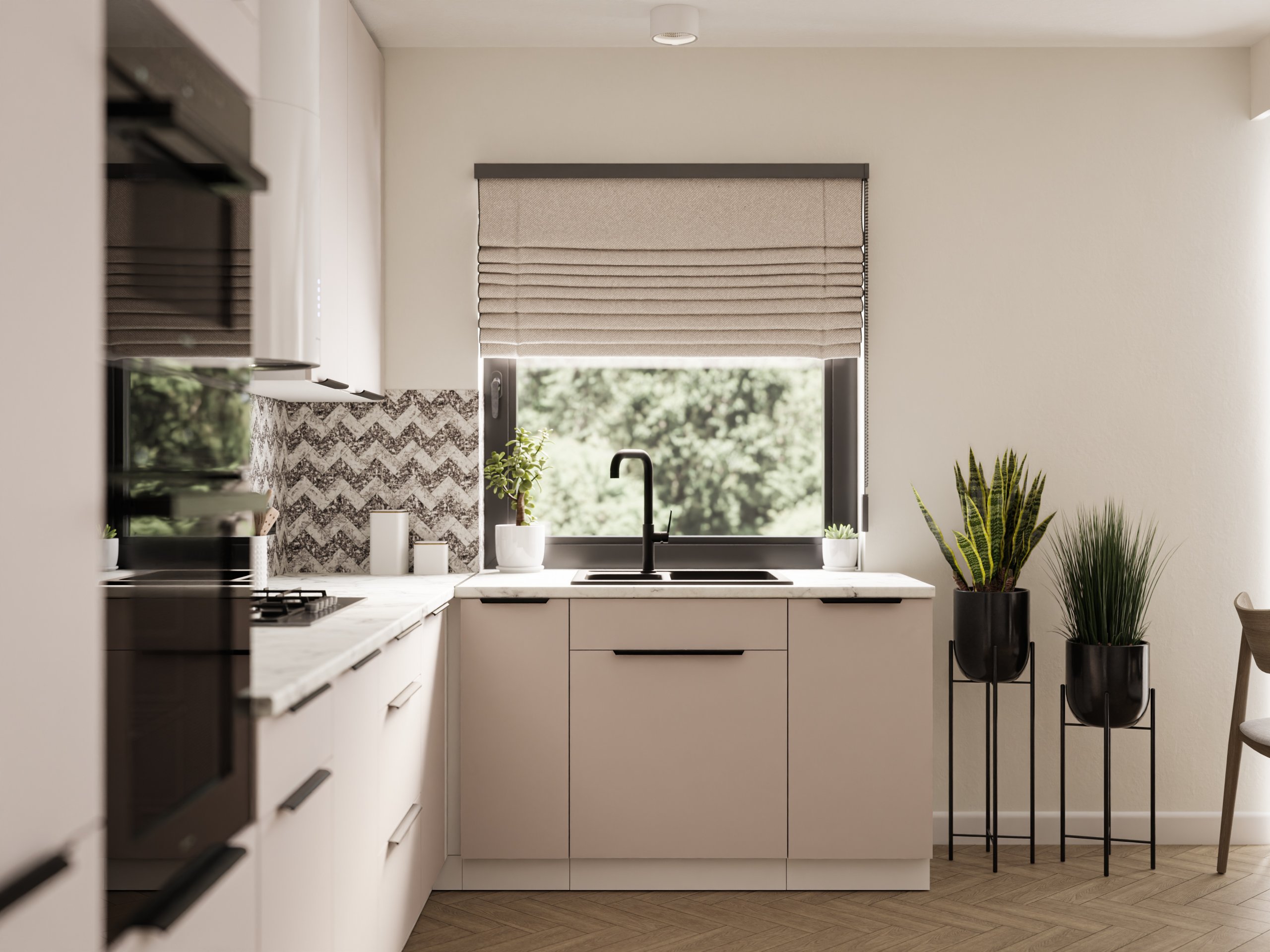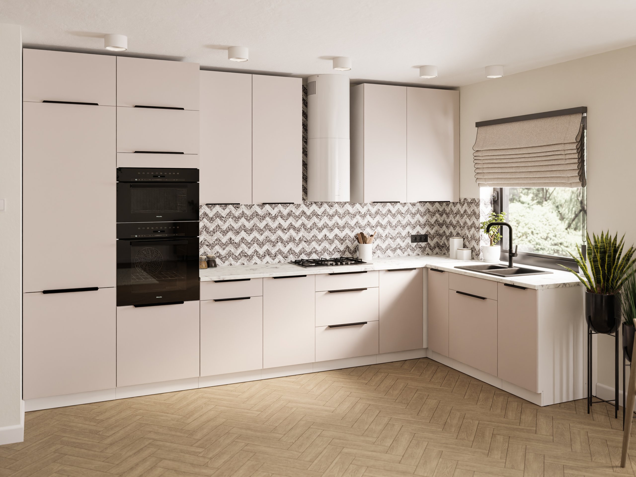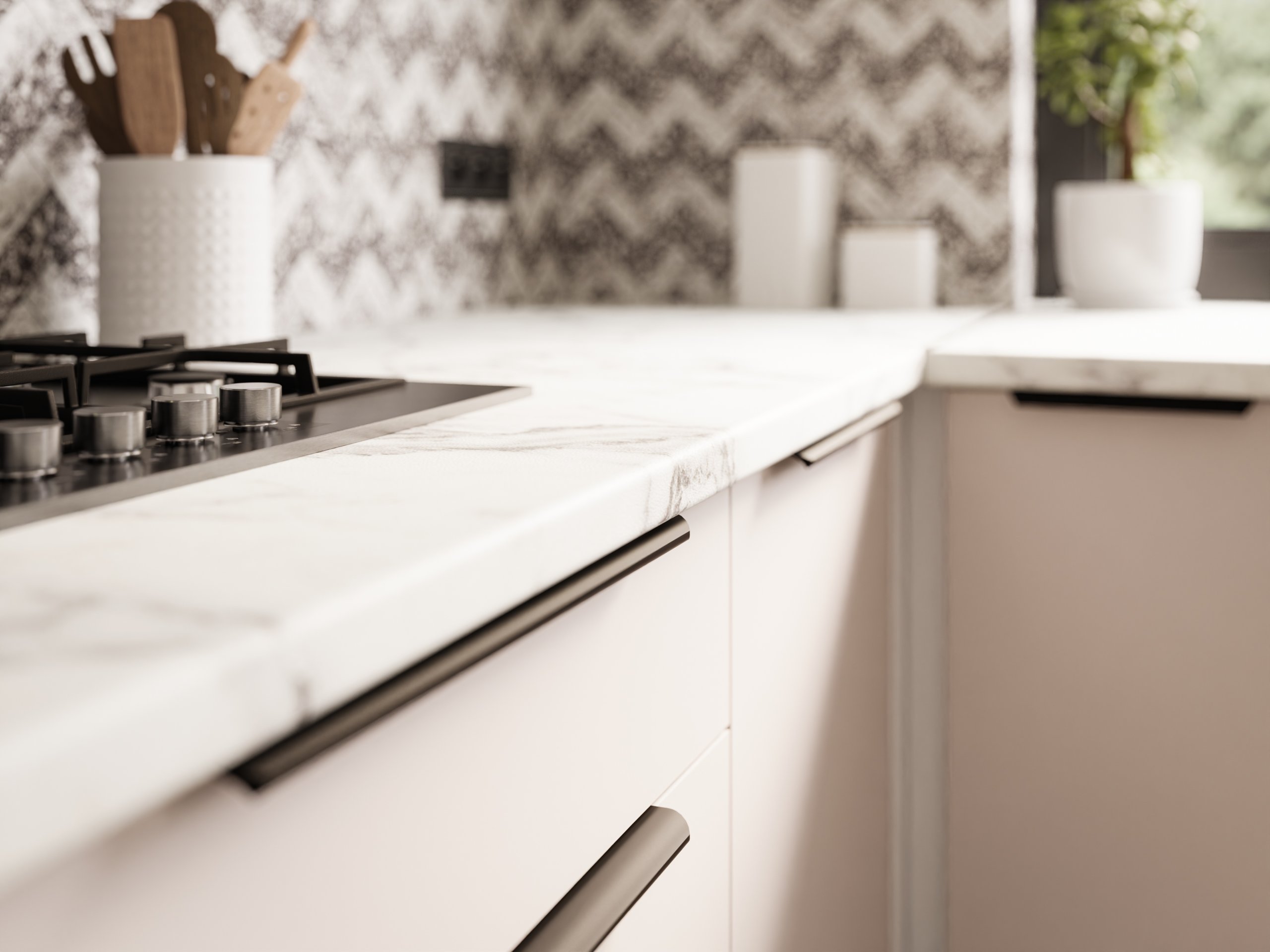 Frontu u toploj boji kašmira nadopunjuje snježno bijeli korpus, što kuhinji daje dojam prozračnosti i prostranosti. Laminirana površina otporna je na ogrebotine i jednostavna za čišćenje, pa je idealna za svakodnevnu upotrebu. Površine zadržavaju svoj izgled i nakon više godina korištenja, jer materijal ne gubi boju i ne deformira se pri uobičajenim temperaturnim promjenama u kuhinji.