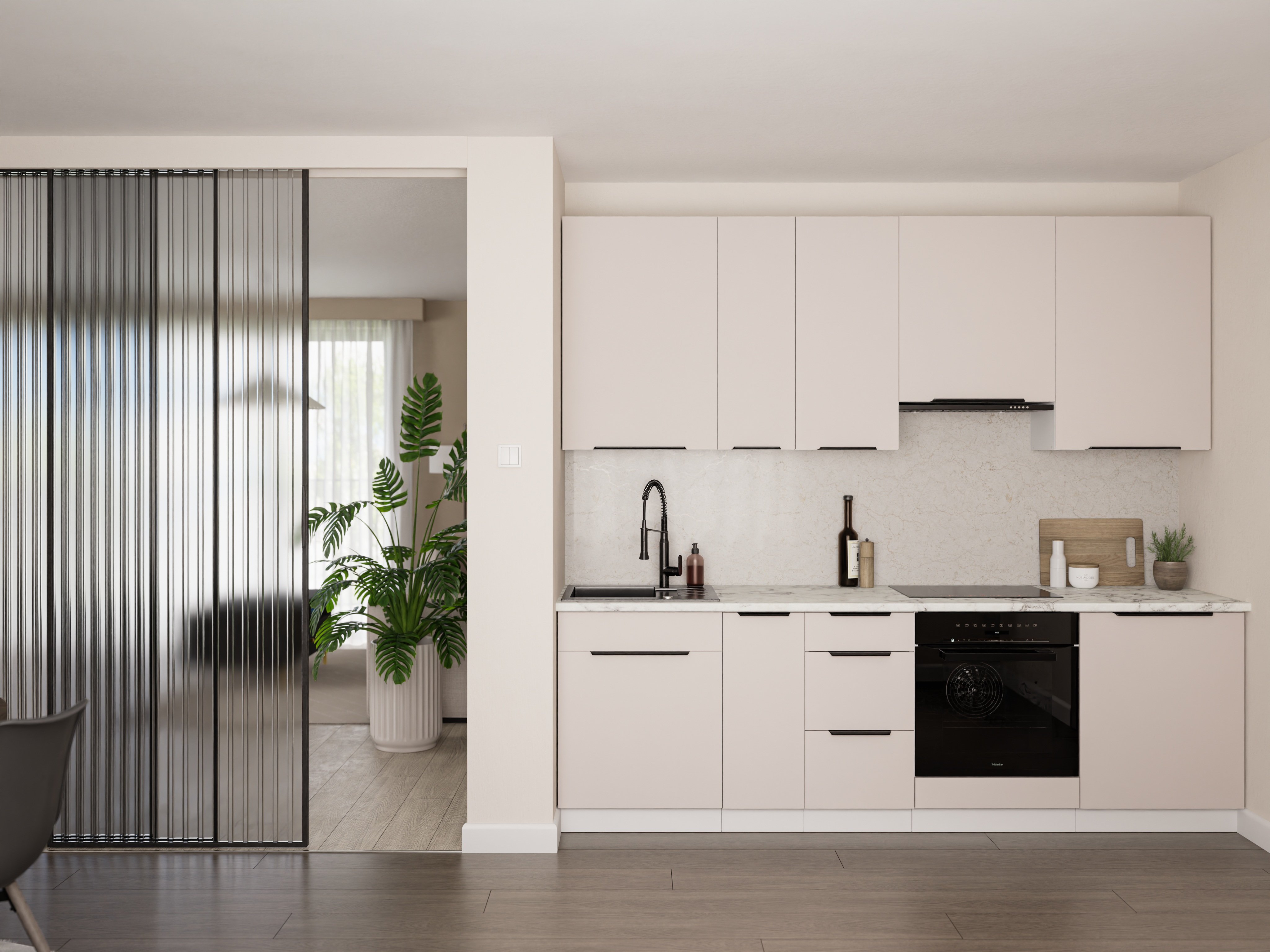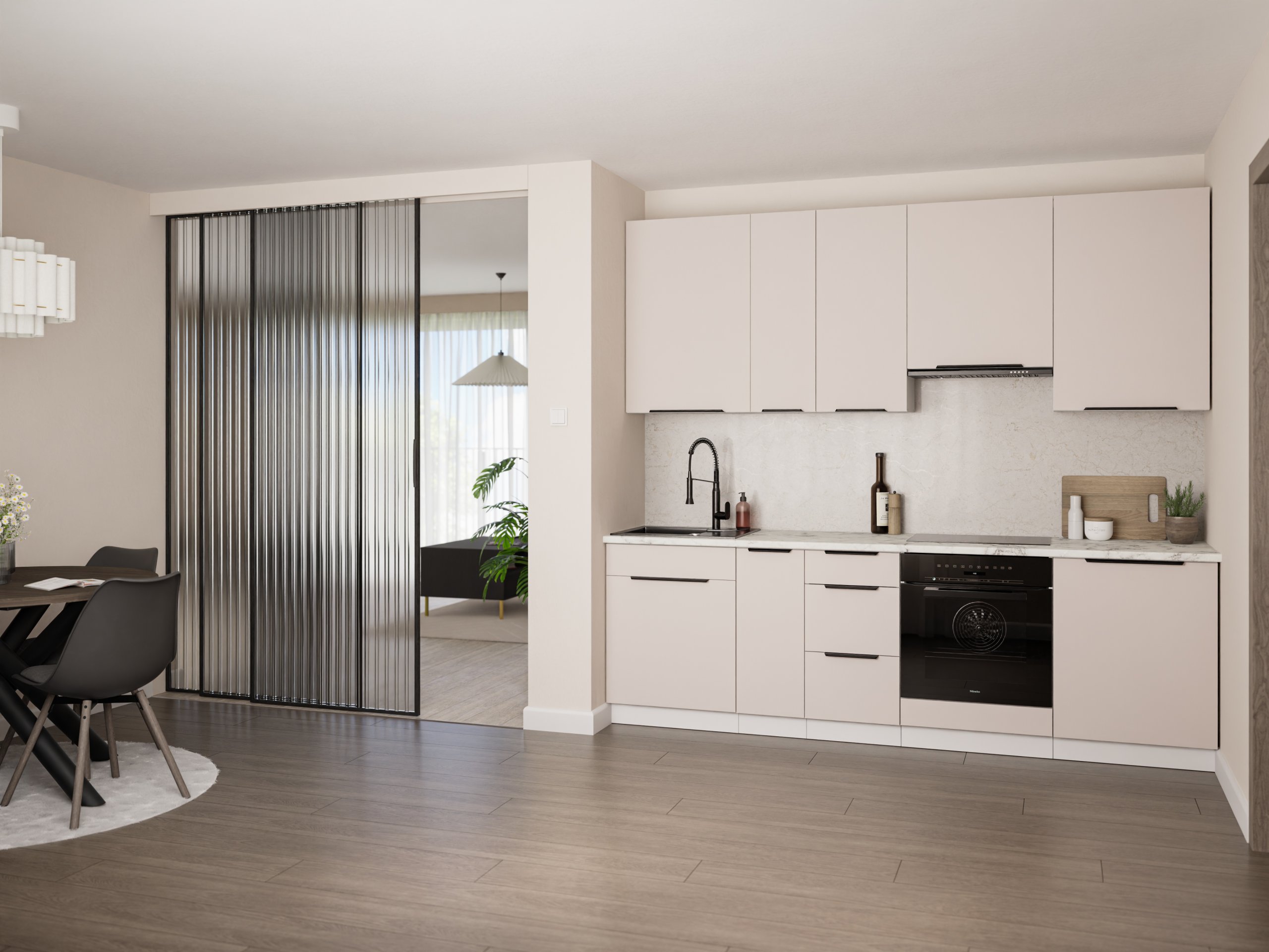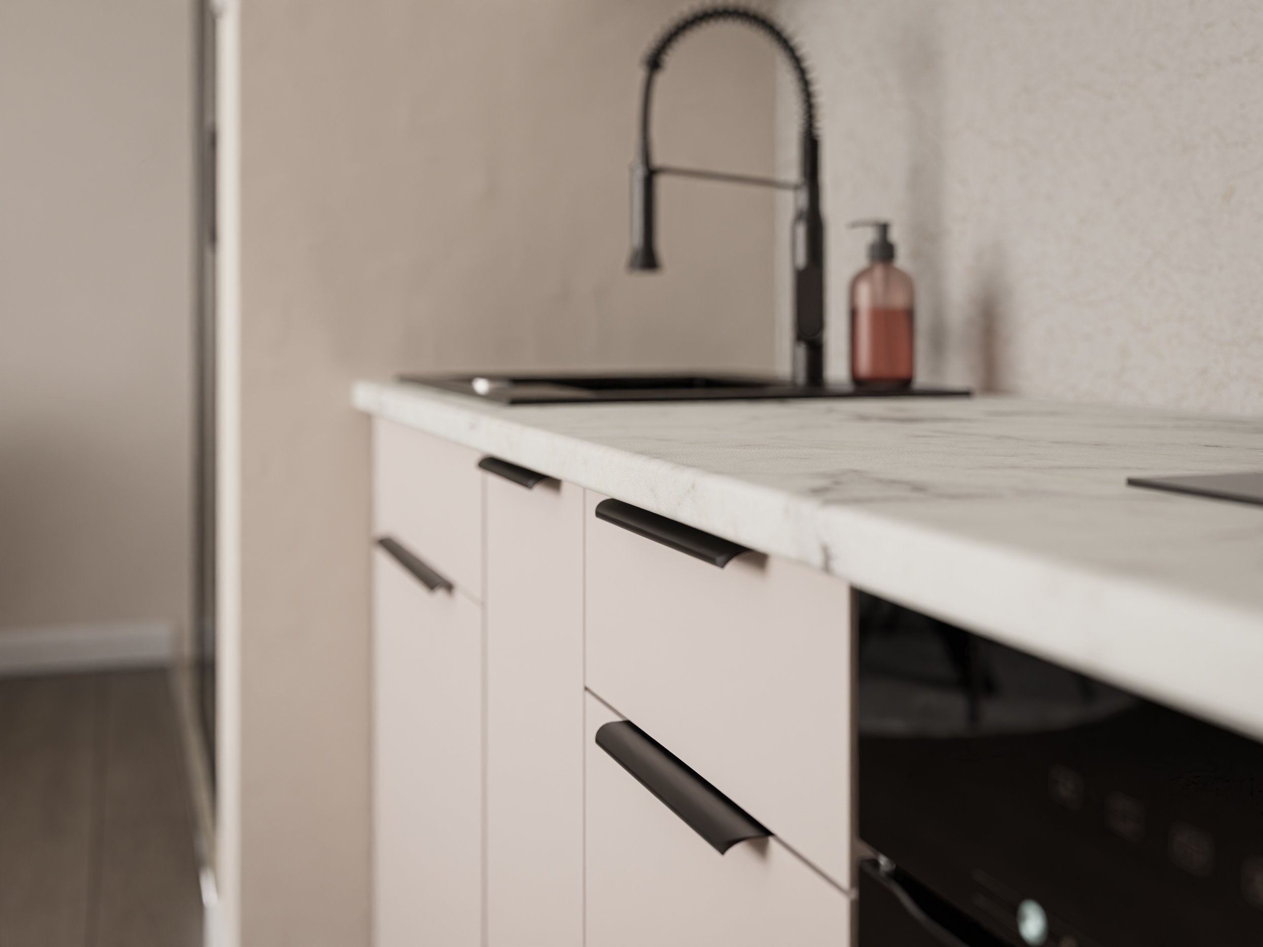 Posebna pažnja posvećena je i ručkama. Ugrađene su ručke edge UA-HEXA u crno-aluminijskoj izvedbi koje svojom minimalističkom formom nadopunjuju moderan karakter kuhinje. Razmak između ručki iznosi od 64 mm do 320 mm, što omogućuje ergonomsku upotrebu i prilagodbu različitim elementima sastava. Takve ručke su istovremeno izdržljive i estetski dovršene, a njihova mat crna površina lijepo se uklapa s neutralnim tonovima fronti.