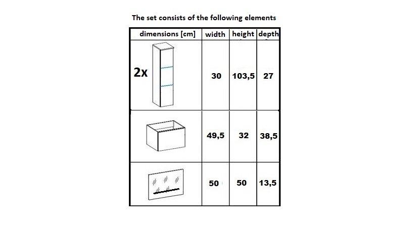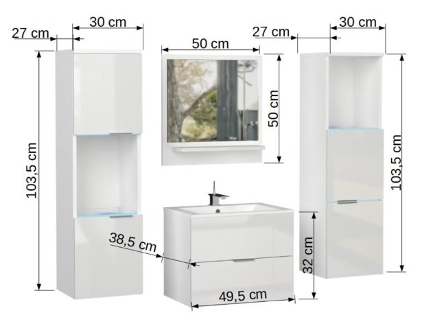 • 1x element ispod umivaonika: širina: 49,5 cm; visina: 32 cm; dužina: 38,5 cm;