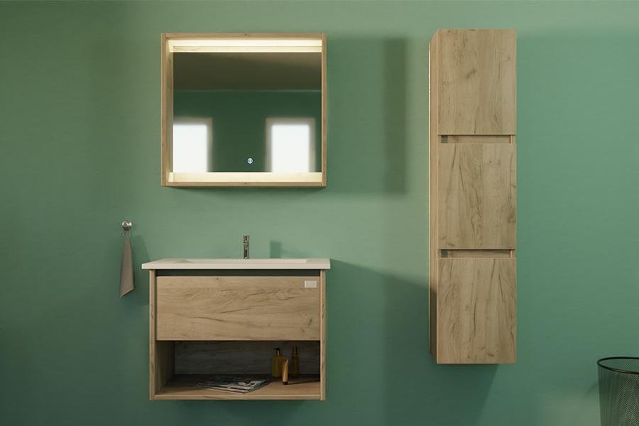 Rustikalna boja hrasta savršeno se kombinira s prirodnim materijalima, keramičkim pločicama ili modernim kontrastnim elementima u crnoj i bijeloj boji. Bez obzira na to obnavljate li kupaonicu ili samo tražite novi središnji komad prostora, ova komoda bit će pravi izbor.