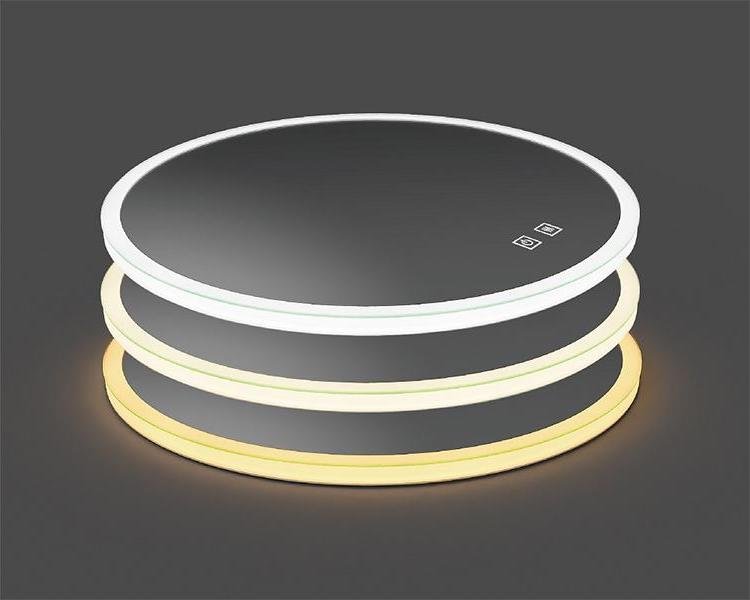 Minimalistički oblik s prestižnim zlatnim detaljem omogućuje da se ogledalo bez poteškoća prilagodi različitim stilovima unutarnjeg uređenja – od moderne kupaonice do klasičnijih ambijenata. Ugrađeno LED osvjetljenje u tri boje svjetla (6500K, 4000K i 3000K) osigurava optimalnu svjetlost kako za jutarnju rutinu, tako i za opuštajuće večeri. Jednim dodirom na senzorski prekidač možete birati između hladne, neutralne ili tople svjetlosti, koja uvijek stvara pravi ugođaj.