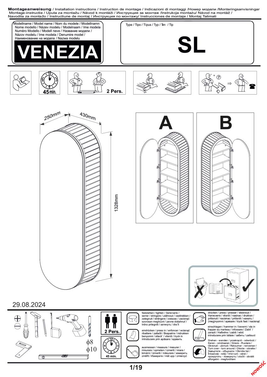 Ormar Venezia 1D uključuje podesive nosače za vješanje koji omogućuju jednostavno podešavanje visine i položaja u skladu s dostupnim prostorom ili visinom korisnika. Montaža na zid je jednostavna i sigurna, što omogućuje brzu instalaciju čak i u manjim kupaonicama. Zbog kompaktne konstrukcije i mogućnosti individualnog podešavanja, ormar je prikladan kako za suvremeno tako i za klasično oblikovane kupaonske interijere.