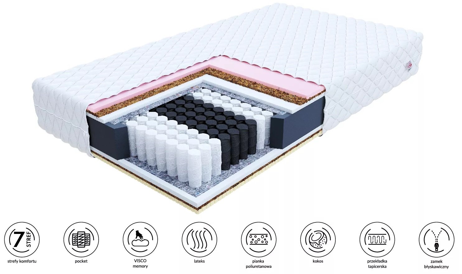 • Sastav: kokosova vlakna, perforiran lateks, poliuretanska pjena T25, termoplastična pjena Visco