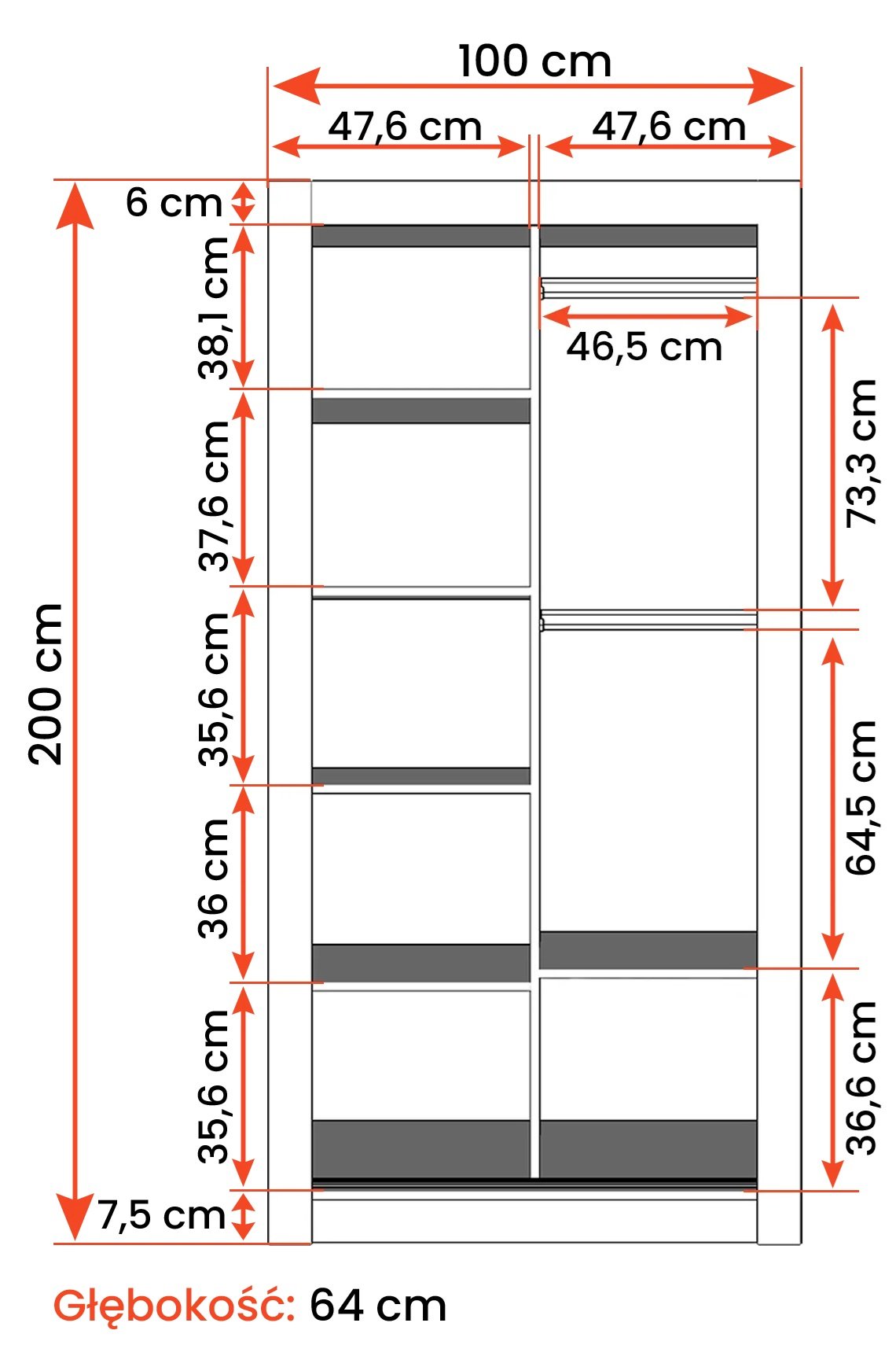 Iako ormar Milan mjeri samo 100 cm u širinu, nudi dovoljno prostora za uredno pohranjivanje odjeće i dodataka. Unutrašnjost je osmišljena tako da omogućuje kombinaciju polica i prostora za vješanje. Tako korisnik može pospremiti složene majice, pulovere i hlače, ali i dužu odjeću poput kaputa ili haljina. Uređenost i preglednost su zajamčene, što olakšava svakodnevnu upotrebu.