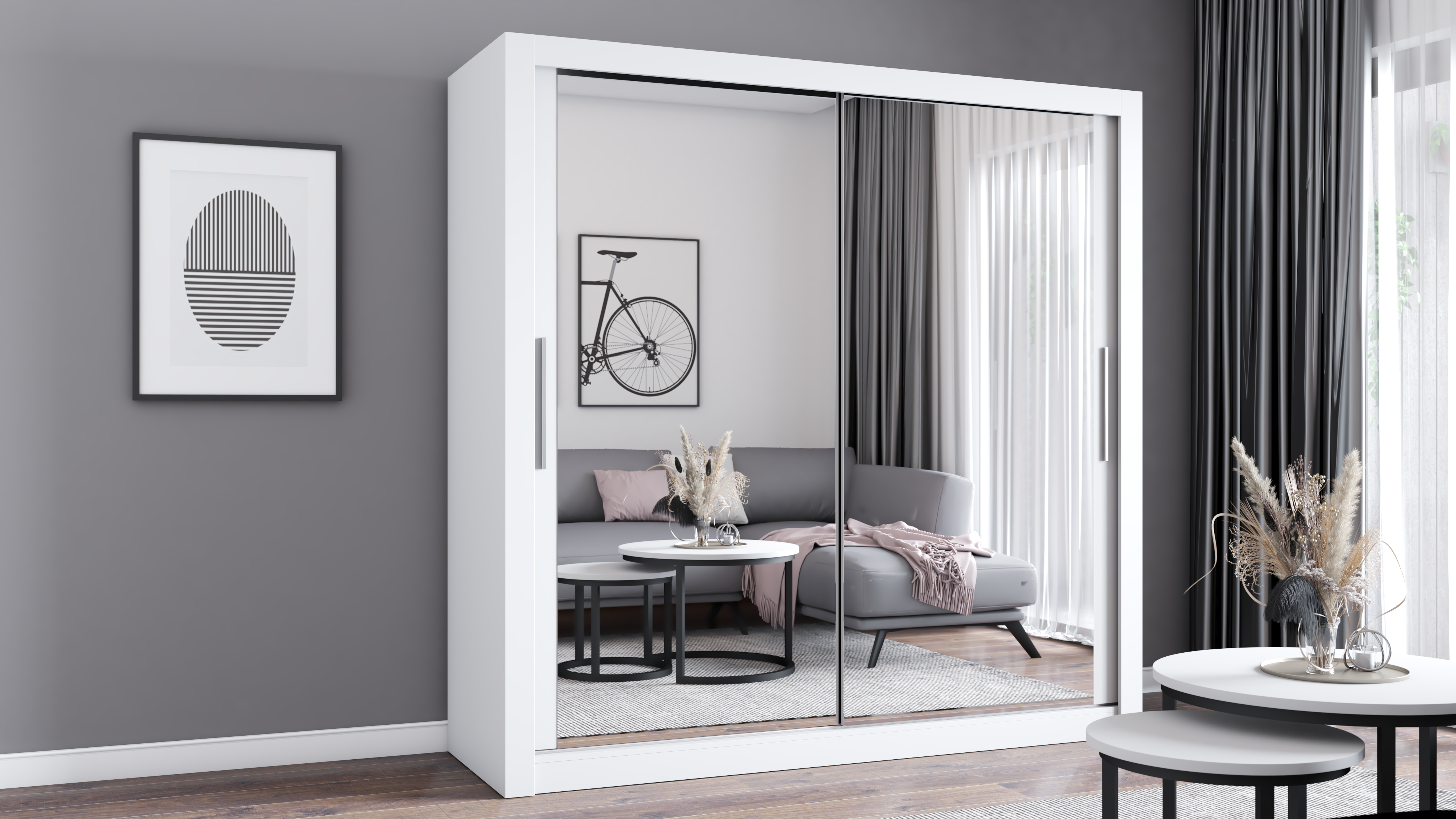 Ormar Milan – Idżczak Meble dizajniran je s mišlju na preglednost i organizaciju. Unutrašnjost nudi dovoljno prostora za pohranu odjeće, posteljine ili dodataka. Prostrani unutarnji raspored omogućuje kombinaciju polica i dijela za vješanje, što pomaže održati red i preglednost. Zahvaljujući kliznim vratima pristup sadržaju je brz i jednostavan, a površina vrata ostaje glatka i moderna.