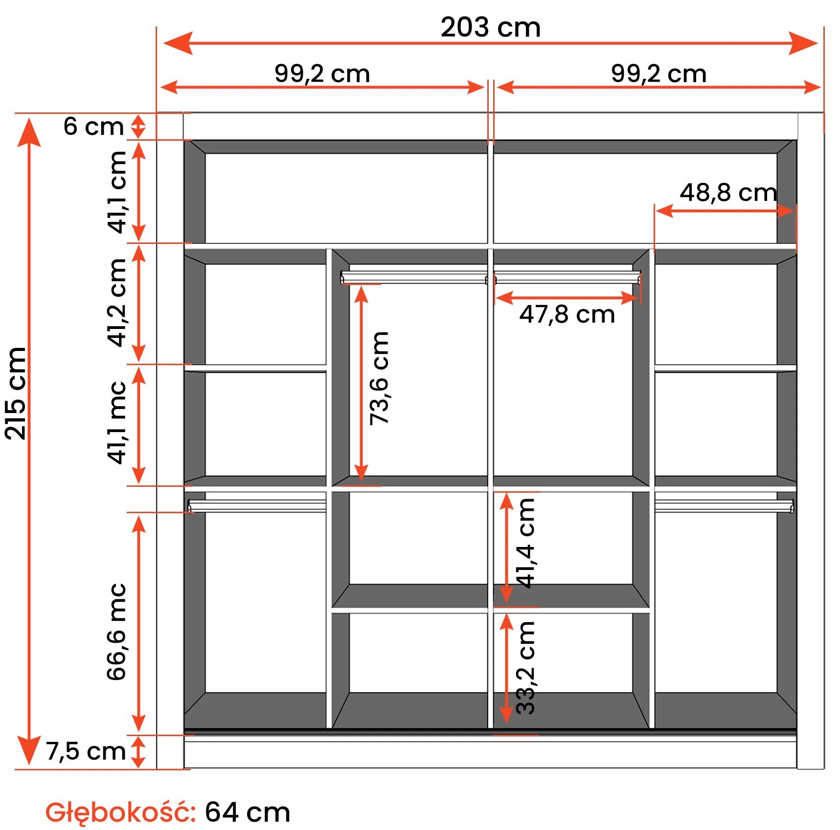 Iako ormar Milan mjeri samo 203 cm u širinu, nudi dovoljno prostora za uredno pohranjivanje odjeće i dodataka. Unutrašnjost je osmišljena tako da omogućuje kombinaciju polica i prostora za vješanje. Tako korisnik može pospremiti složene majice, pulovere i hlače, kao i dužu odjeću poput kaputa ili haljina. Uređenost i preglednost su zajamčene, što olakšava svakodnevnu upotrebu.