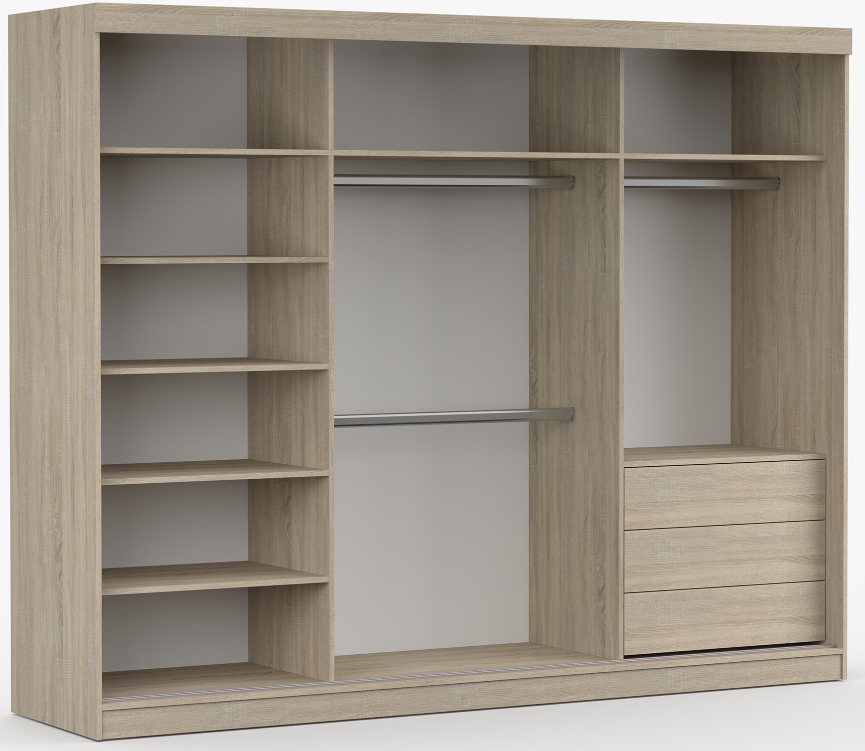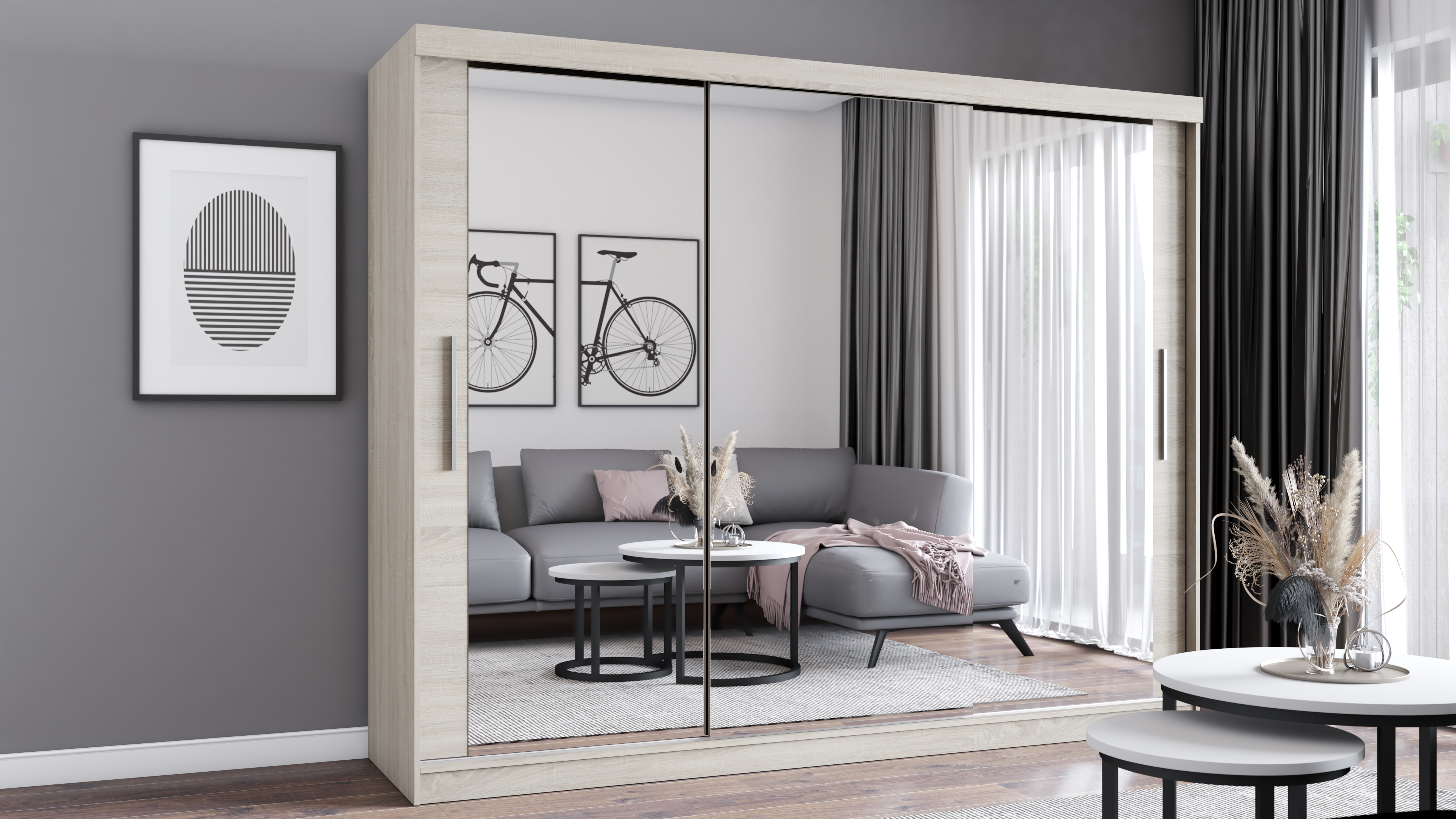 Iako ormar Milan mjeri samo 250 cm u širinu, nudi dovoljno prostora za uredno pohranjivanje odjeće i dodataka. Unutrašnjost je dizajnirana tako da omogućuje kombinaciju polica i prostora za vješalice. Tako korisnik može pospremiti složene majice, pulovere i hlače, kao i dužu odjeću poput kaputa ili haljina. Uređenost i preglednost su zajamčeni, što olakšava svakodnevnu upotrebu.
