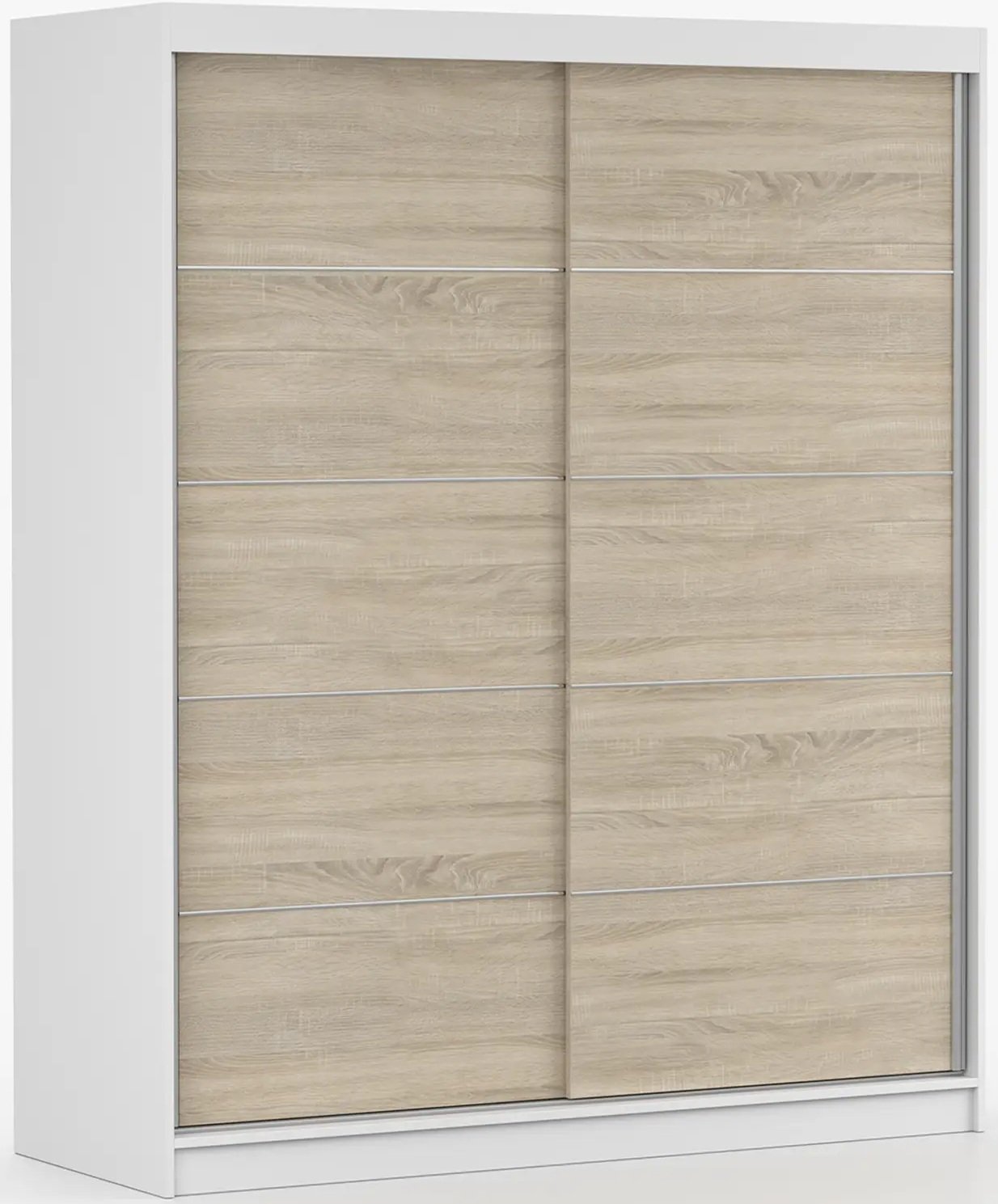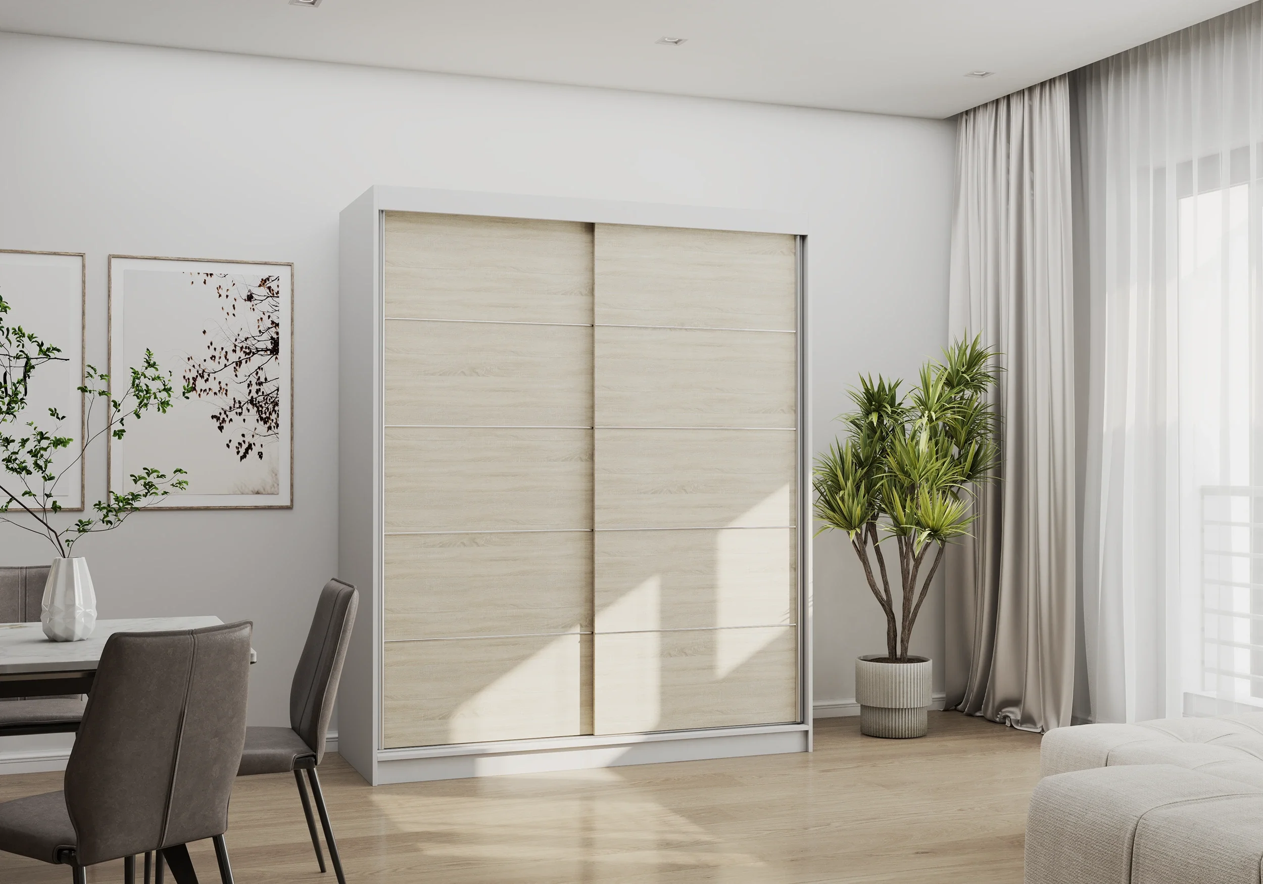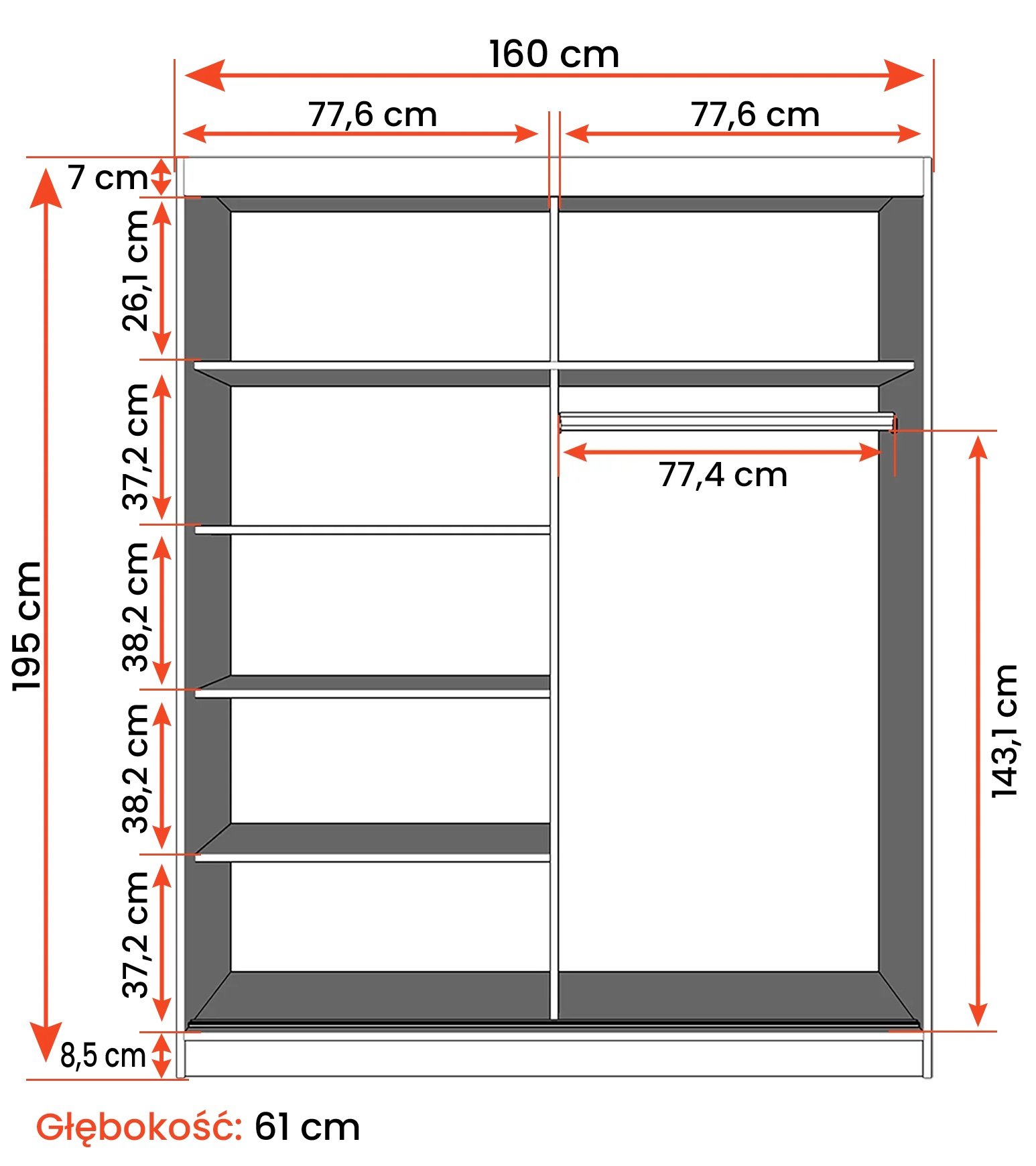 Ormar mjeri 160 cm u širinu, 61 cm u dubinu i 195 cm u visinu. Ove dimenzije predstavljaju optimalan omjer između kompaktnosti i prostranosti. Unutrašnjost nudi dovoljno prostora za vješanje odjeće, slaganje rublja ili pohranu dodataka. Klizna vrata omogućuju jednostavan pristup sadržaju bez potrebe za dodatnim prostorom za otvaranje, što je posebno praktično u manjim sobama ili uskim hodnicima. Ovaj mehanizam također doprinosi elegantnom izgledu jer održava ravne linije i minimalistički oblik.