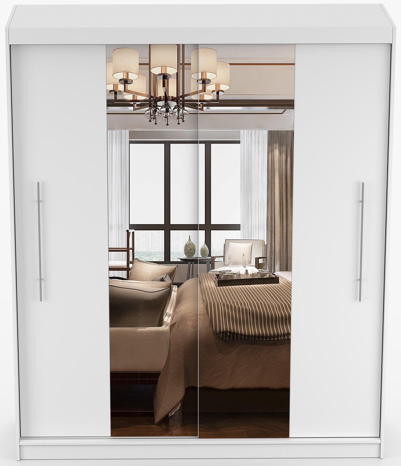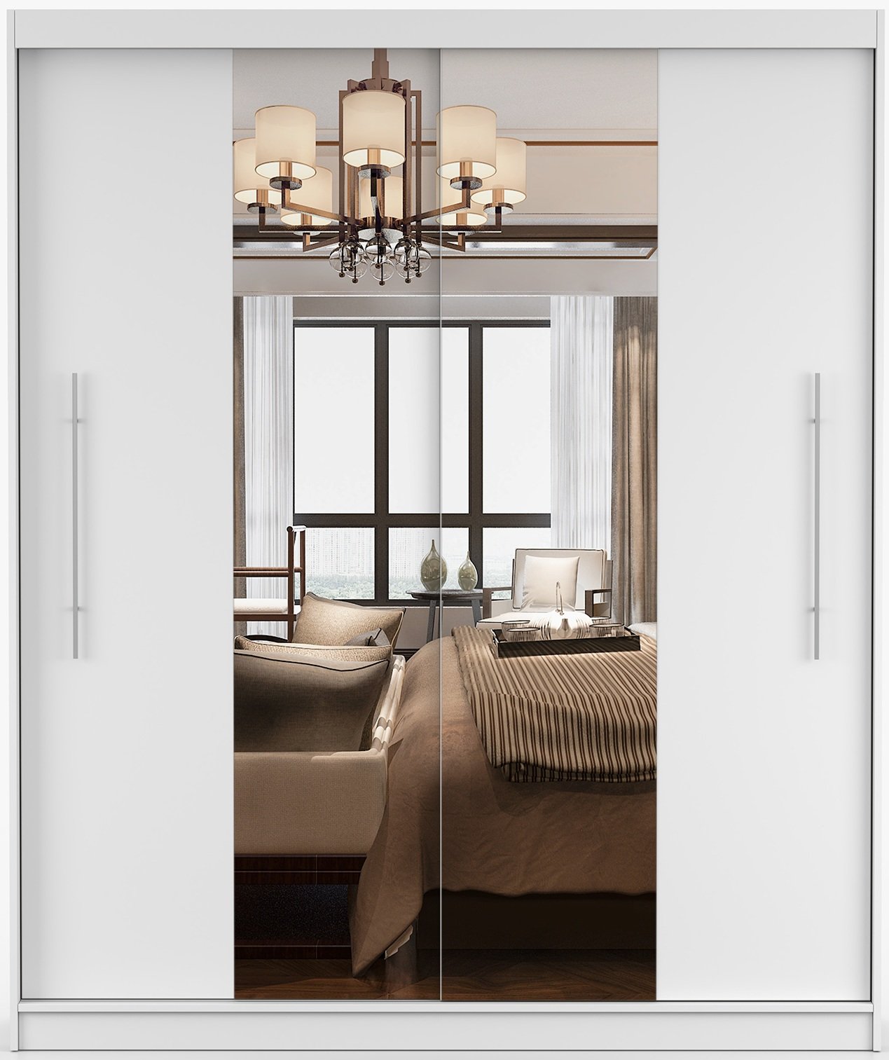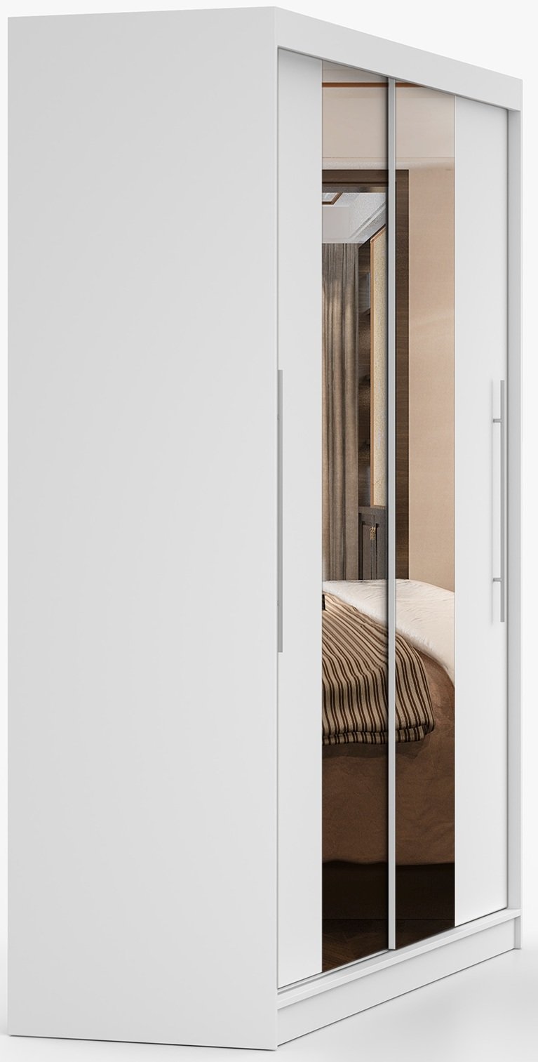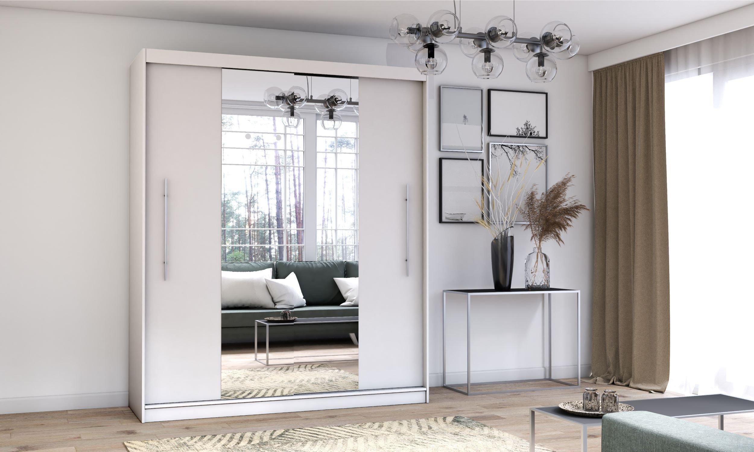 Garderobni ormar Torino s ogledalom predstavlja elegantno i funkcionalno rješenje za moderan dom. Dizajniran je tako da nudi mnogo prostora za pohranu odjeće, obuće i dodataka, a svojim čistim, bijelim izgledom vizualno povećava prostor. Izrađen je od kvalitetne laminirane ploče koja osigurava čvrstoću, stabilnost i jednostavno održavanje. Ovaj model s kliznim vratima omogućuje jednostavan pristup unutrašnjosti, bez potrebe za dodatnim prostorom za otvaranje, što je posebno praktično u manjim spavaćim sobama ili hodnicima.