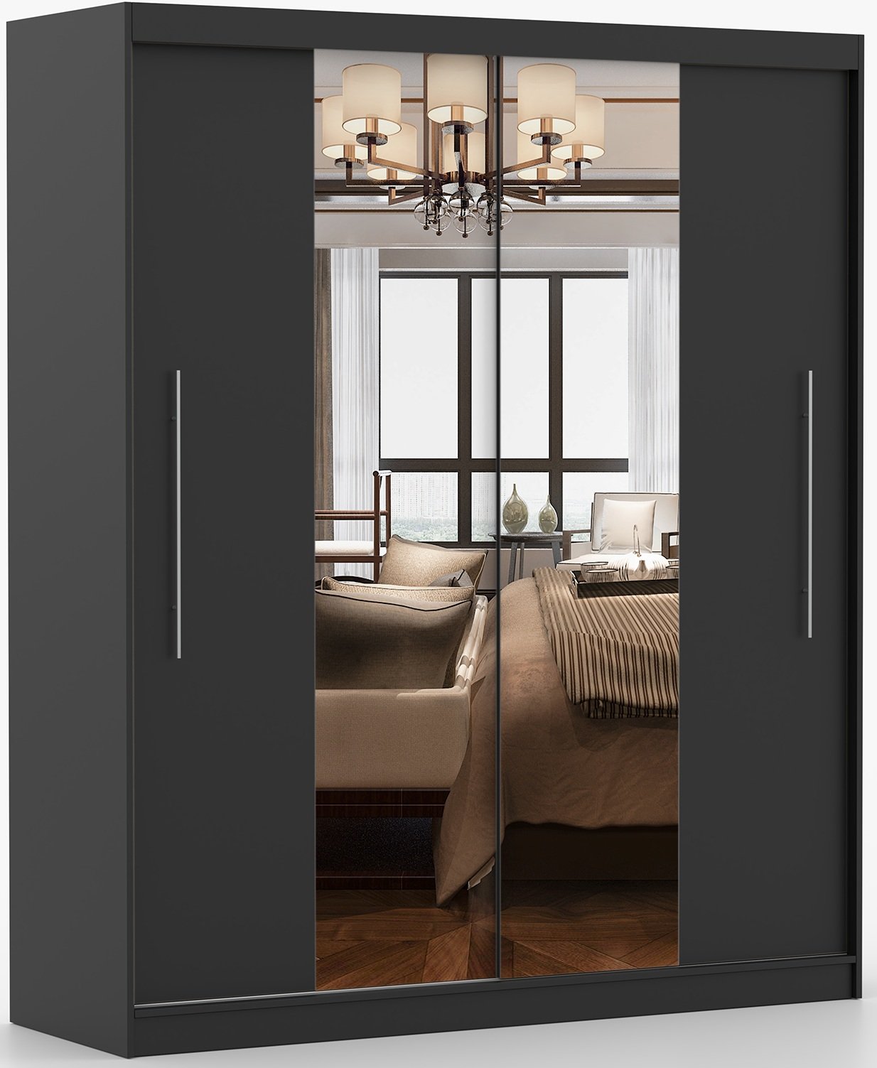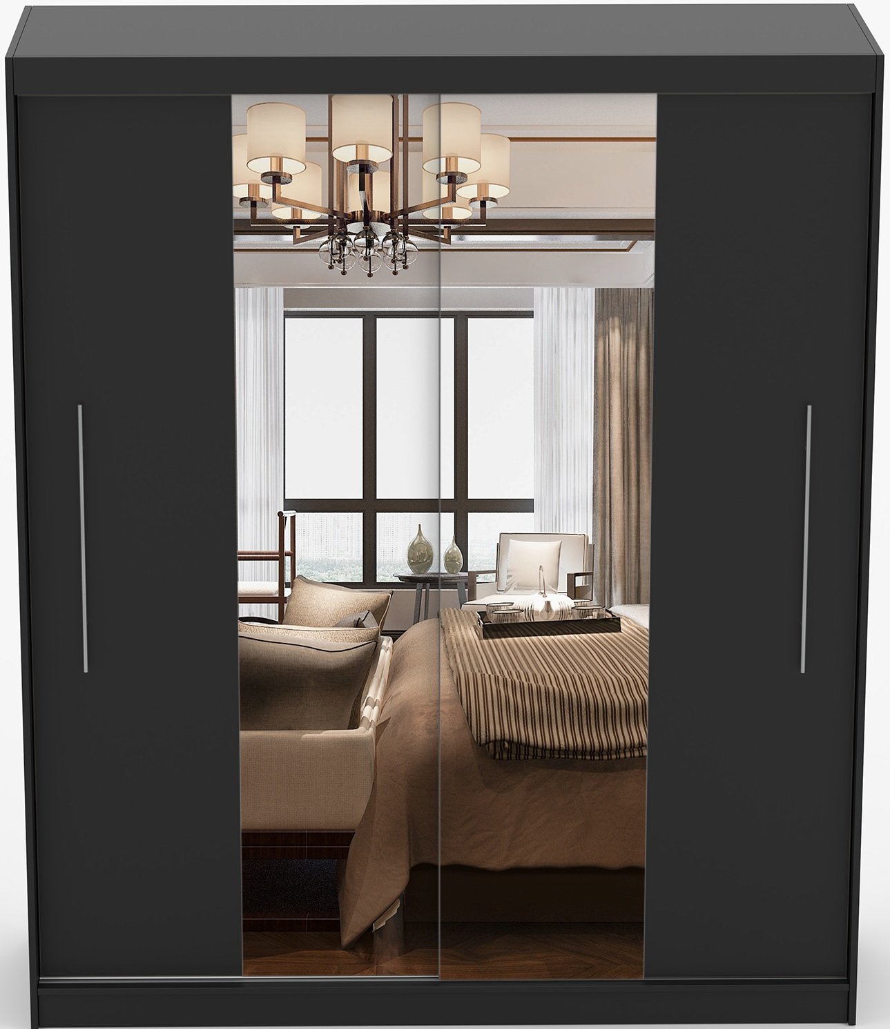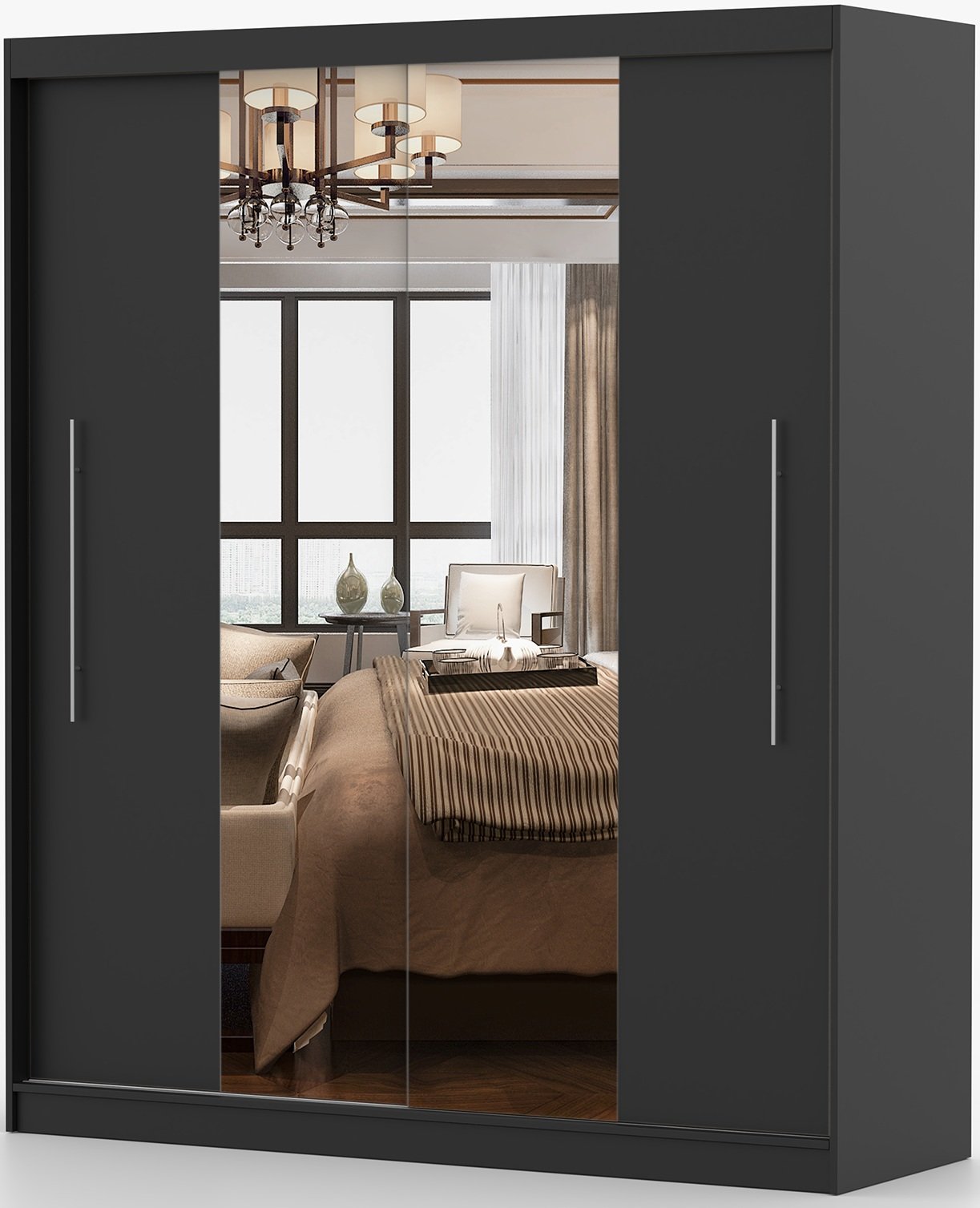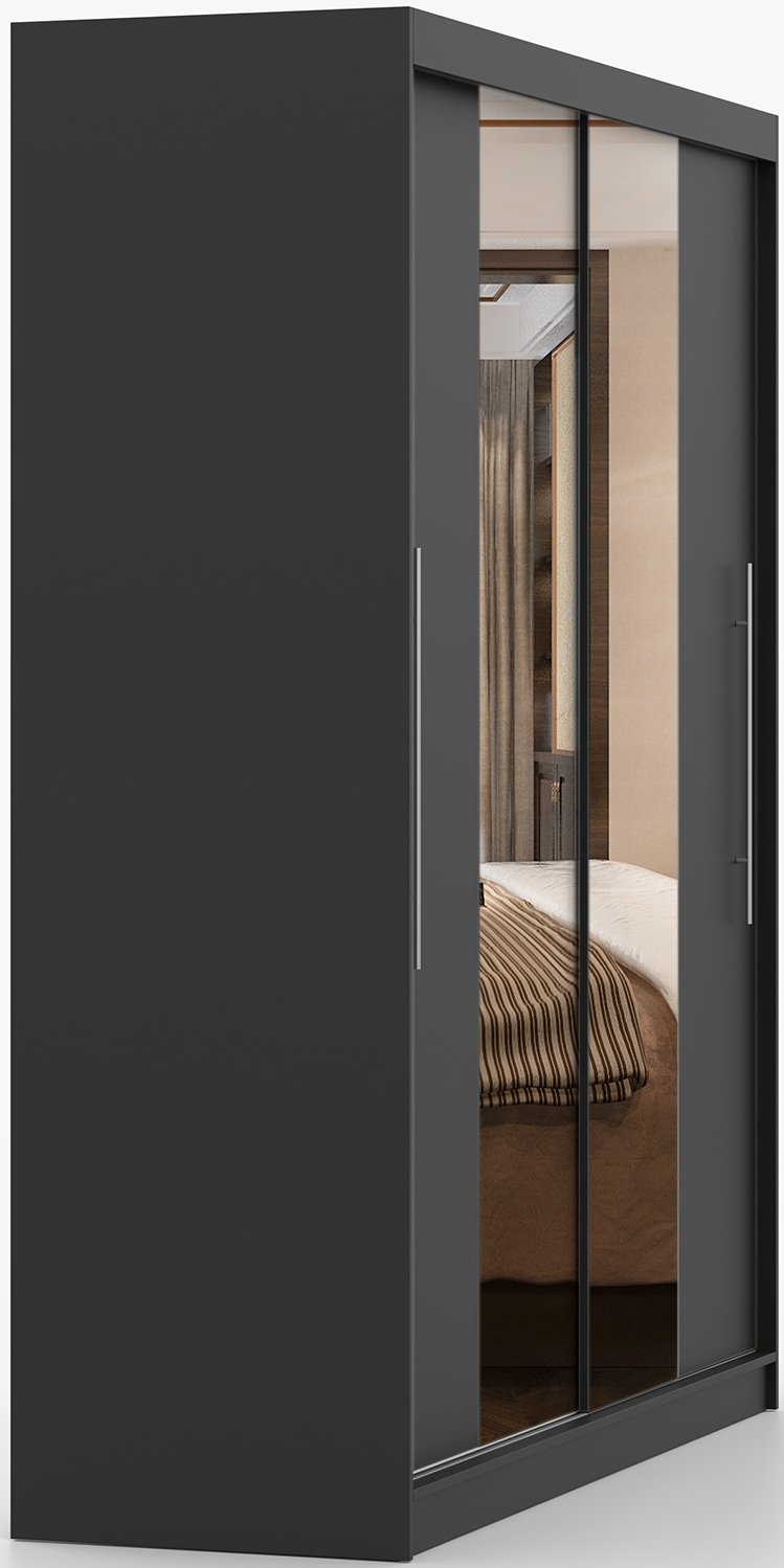 Crna boja i minimalistički oblik omogućuju da se garderobni ormar Torino s ogledalom lako uskladi s drugim elementima namještaja – od klasičnih drvenih tonova do modernih svijetlih površina. Može biti dio cjelovite spavaće kompozicije ili samostalan element u predsoblju. Zrcalna površina dodatno naglašava estetsku vrijednost prostora i optički ga povećava.