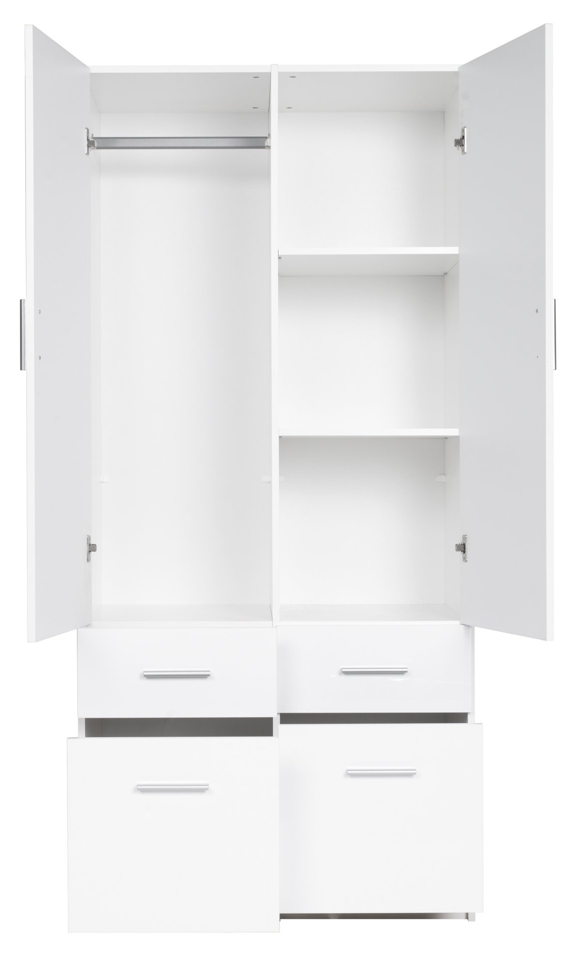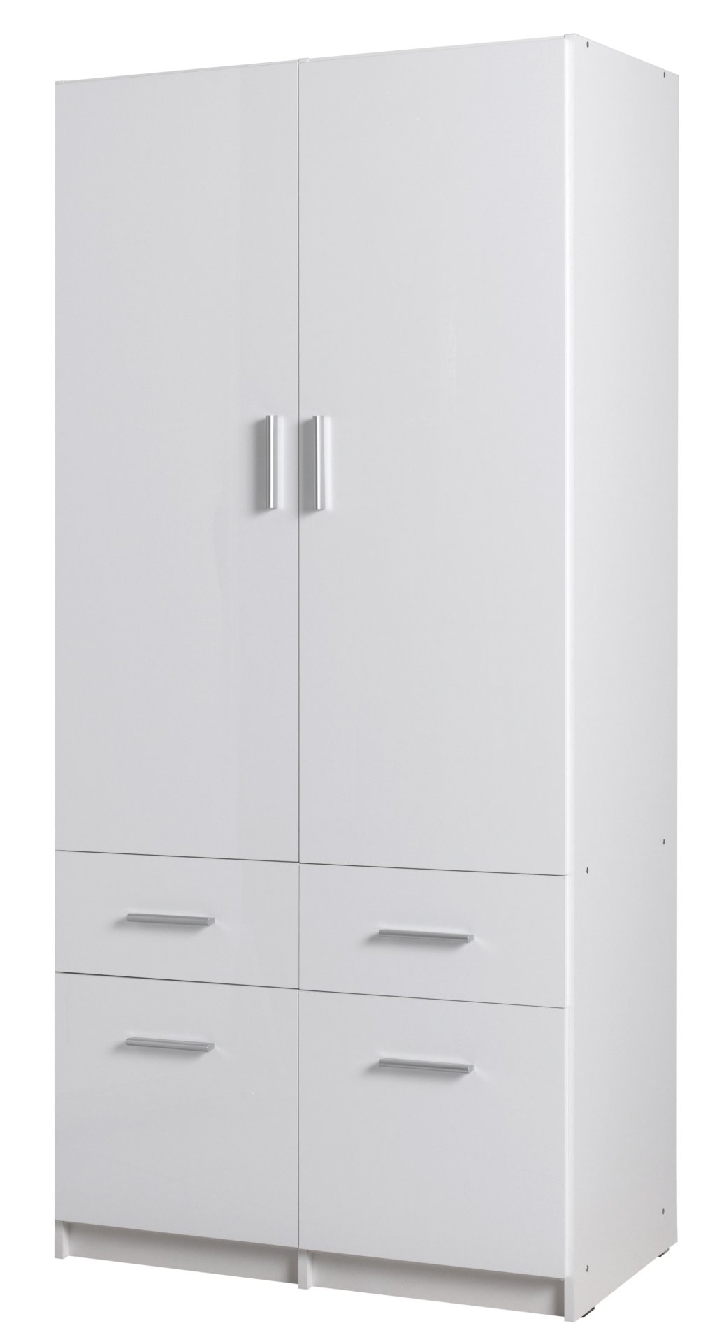 Ako želite praktična, elegantna i kvalitetna rješenja za pohranu odjeće, onda je ovaj dvokrilni ormar s ladicama izvrstan izbor. Spaja funkcionalnost i moderan dizajn, zbog čega se odlično uklapa kako u spavaću sobu, tako i u dječju sobu ili predsoblje. Svojom univerzalnom bijelom bojom u visokom sjaju stvara osjećaj svjetlosti i čistoće, a istovremeno vizualno povećava prostor. Zahvaljujući promišljenom dizajnu i kvalitetnim materijalima, ormar je prikladan za svakodnevnu uporabu, a ujedno osigurava uredan i estetski izgled vašeg doma.
