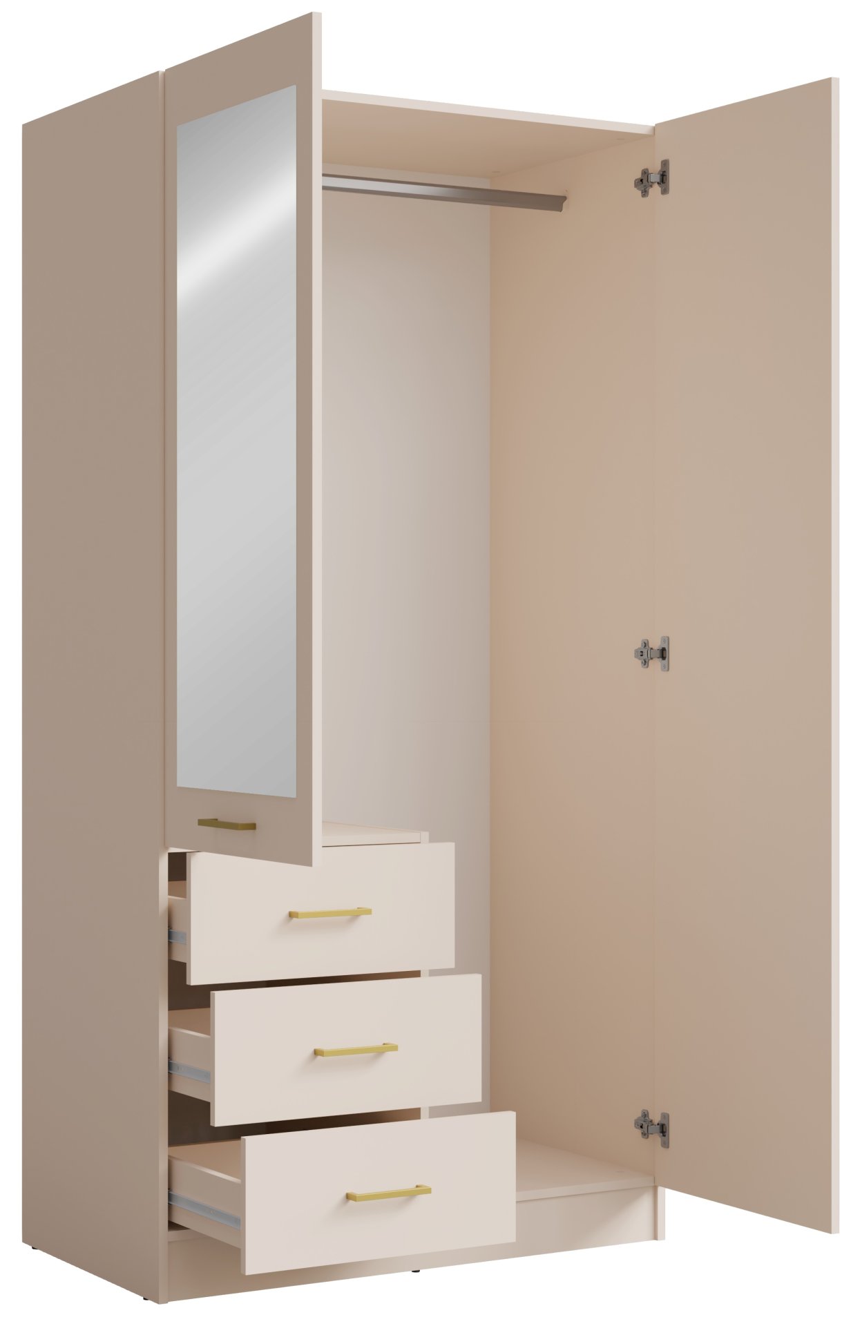 Poseban naglasak kolekcije Konso su zlatne ručke, koje dodaju dašak luksuza i upotpunjuju inače smirenu shemu boja. Takva kombinacija suptilne boje i metalnog detalja stvara harmoniju između modernog i klasičnog stila, što omogućuje da se ormar lako uklopi u različite unutarnje ambijente.