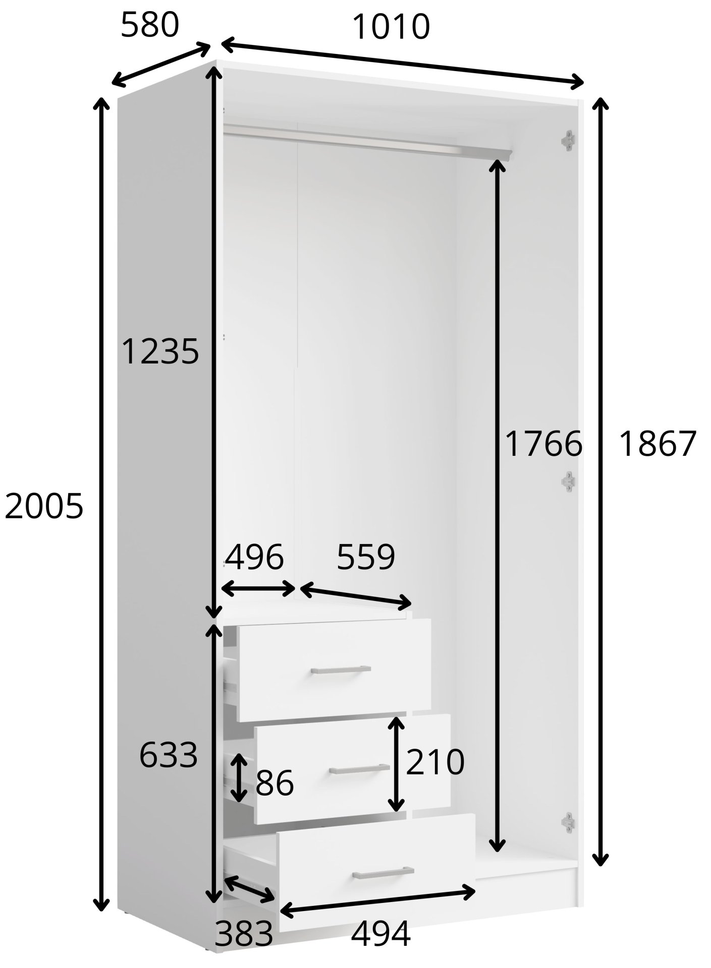 Njegova visina od 200,5 cm omogućuje učinkovito korištenje prostora do stropa, što je osobito korisno u manjim stanovima, gdje je svaki centimetar dragocjen. Dubina od 58 cm osigurava dovoljno prostora za vješanje odjeće bez gužvanja, što je ključno za održavanje urednog izgleda garderobe.