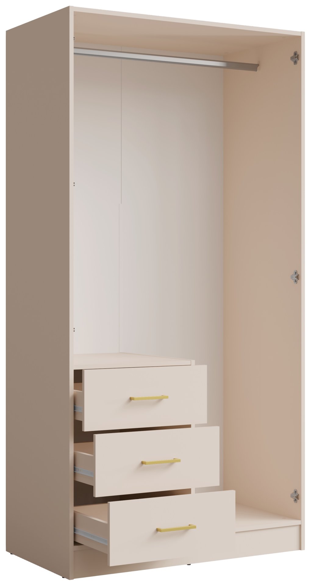 Garderobni ormar Konso 15 u bež boji dio je priznate kolekcije Konso, koja dolazi iz poljske tvornice Meblosiek. Ovaj model širine 100 cm osmišljen je za one koji traže savršenu ravnotežu između elegancije, funkcionalnosti i kvalitete izrade. Korpus ormara izrađen je od laminirane iverice debljine 16 mm, što osigurava čvrstoću, stabilnost i dug vijek trajanja. Bež nijansa lako se prilagođava različitim stilovima unutarnjeg uređenja, od modernih do klasičnih ambijenata, te prostoru dodaje ugodnu toplinu i osjećaj domaćeg ugođaja.